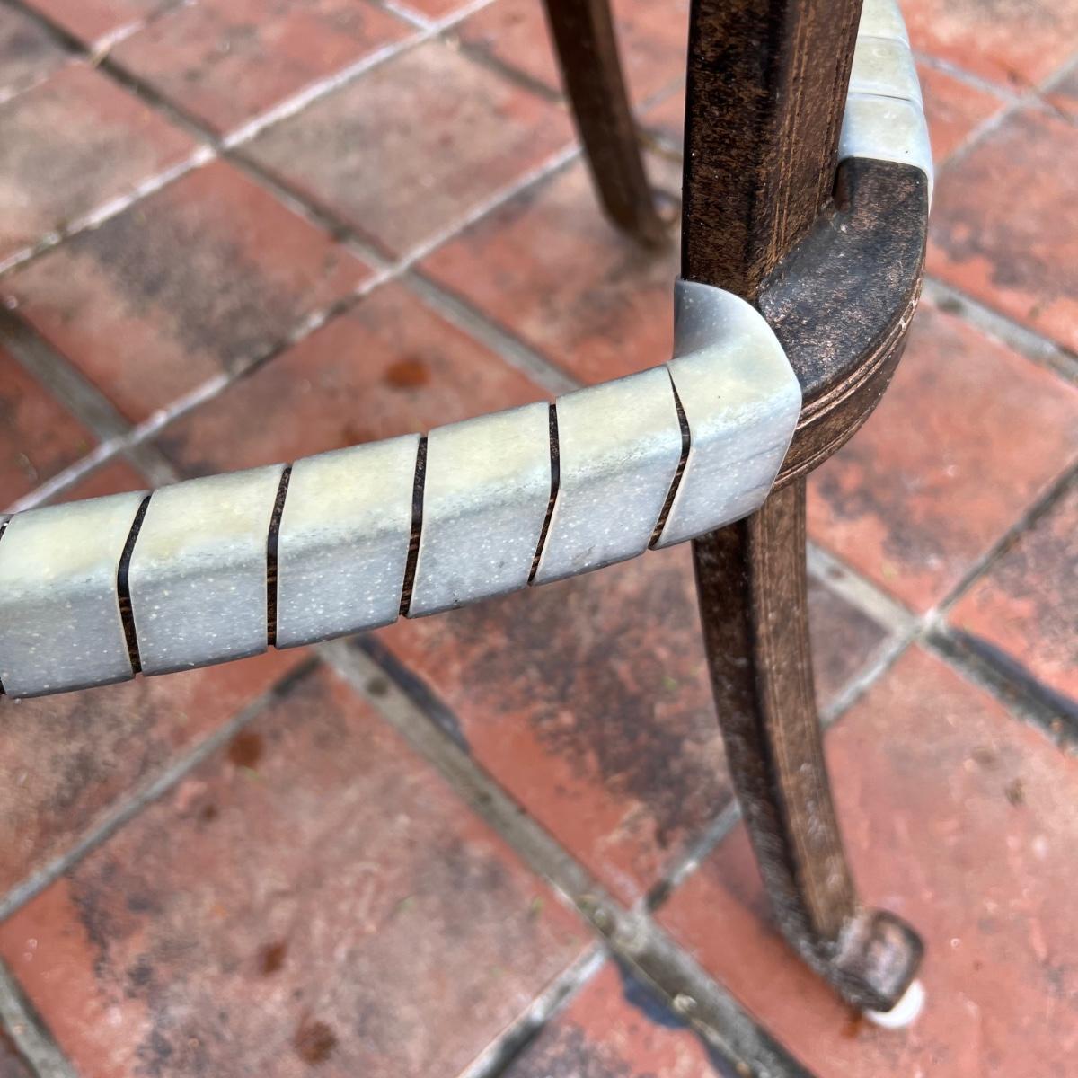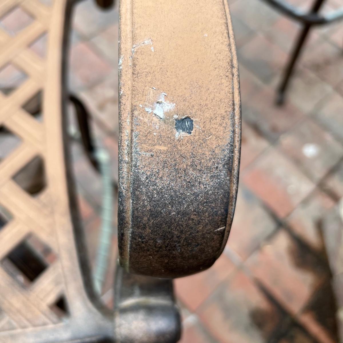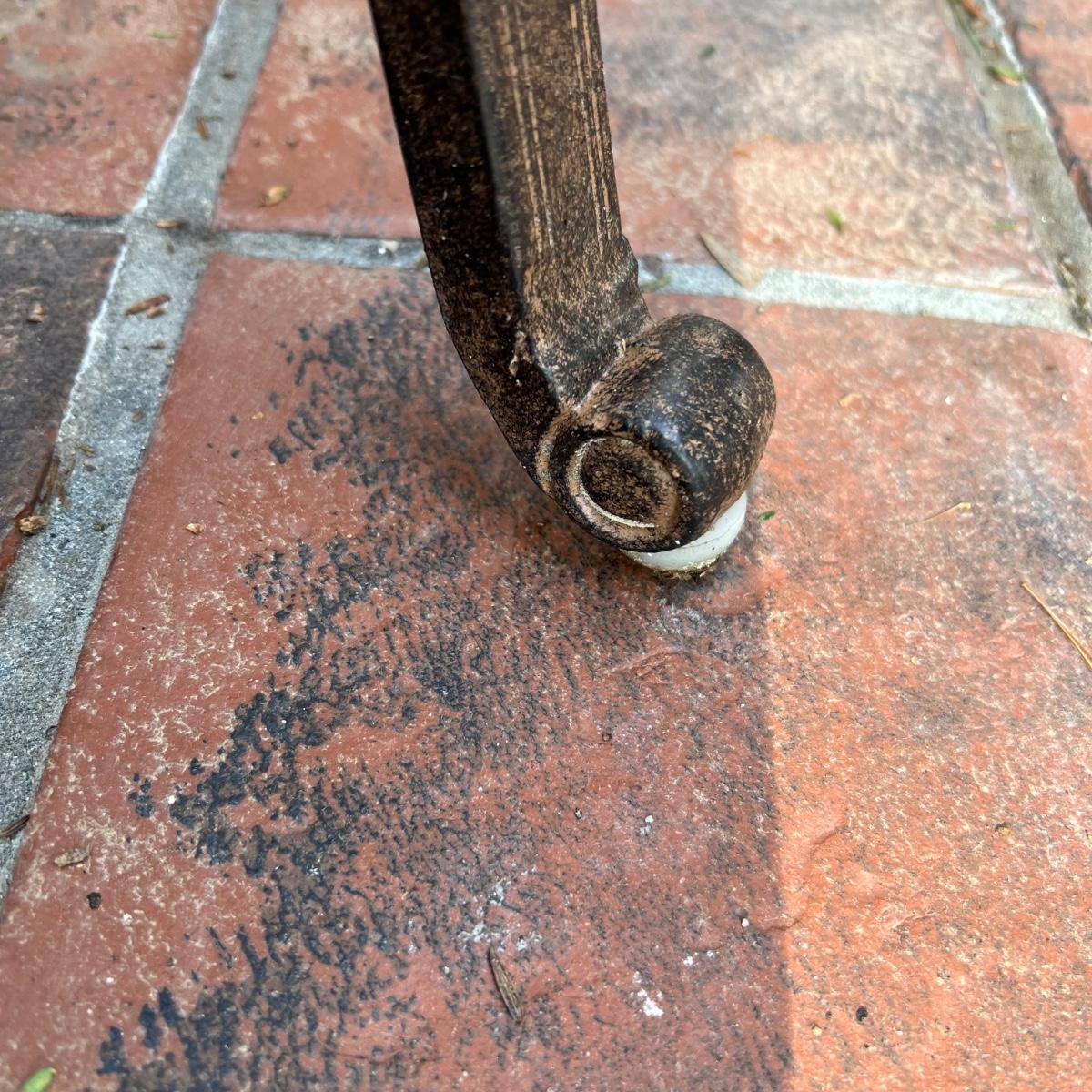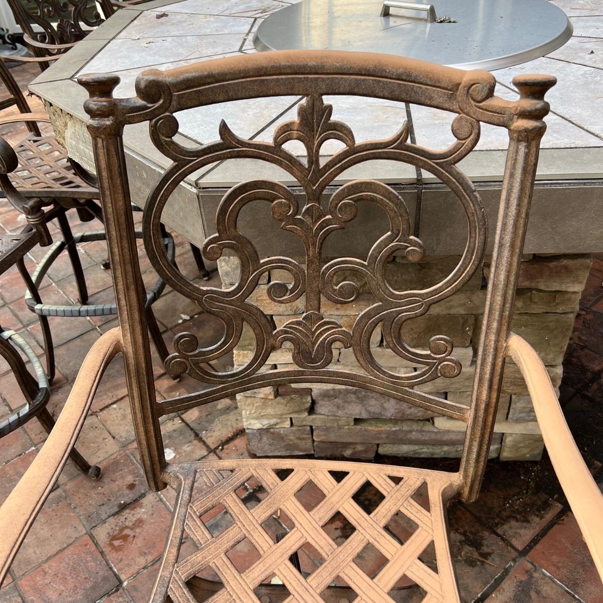 A matching set of six bar stools/chairs that are finished in a rust brown. All chairs swivel easily. The only blemishes found are on two chairs which are shown in images, they include some hardened grout on one and a small rub mark on another. All chairs have a thick plastic wrapped around the lower section which is probably for protection and could be removed.