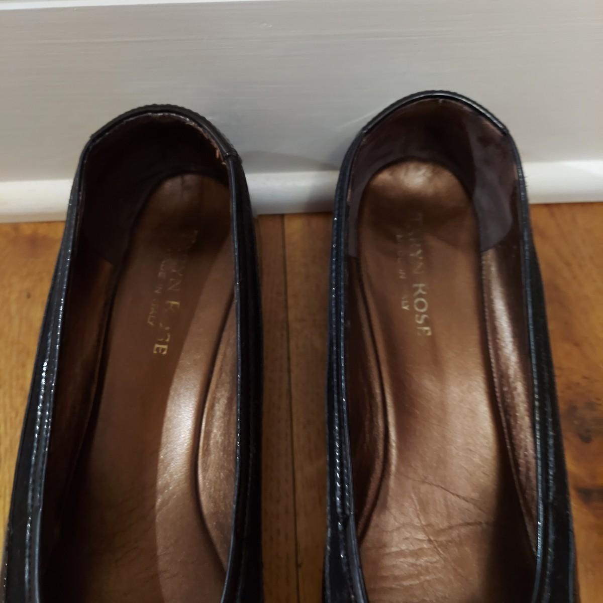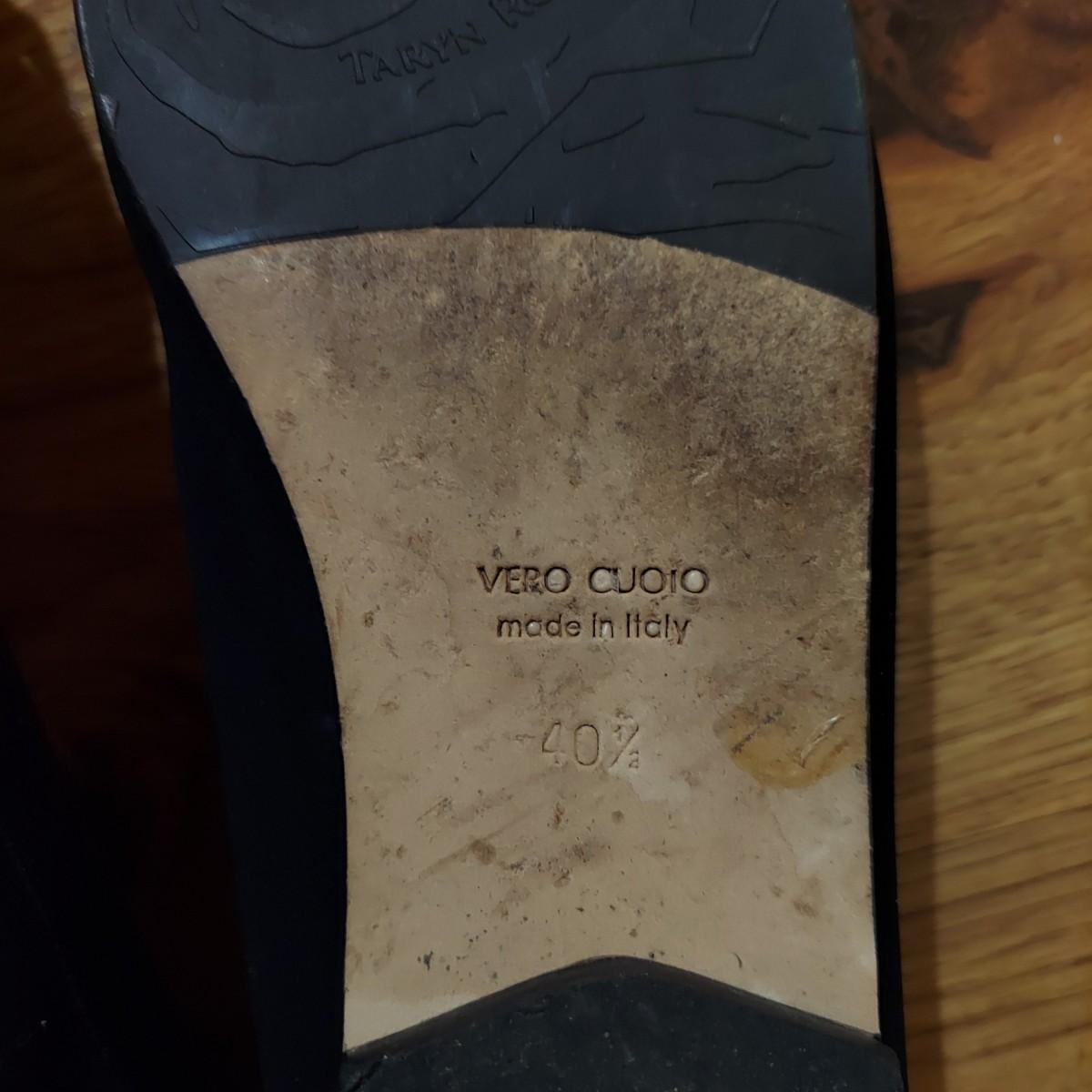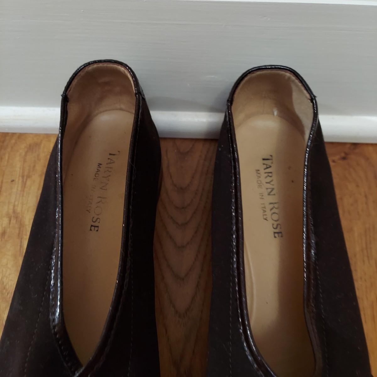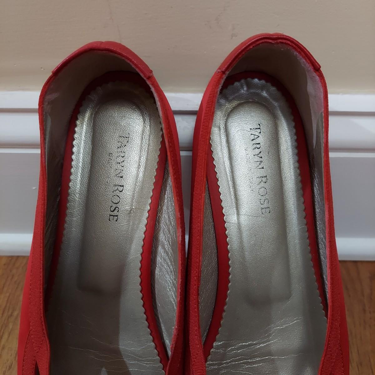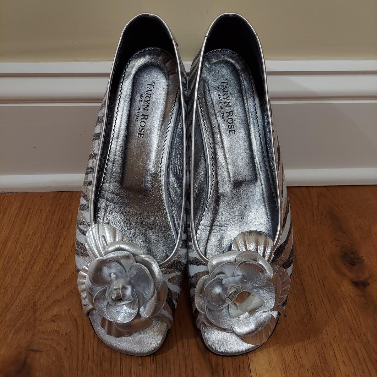 Six pair of Taryn Rose shoes. There are three pair of open toe flats. The silver pair is leather while the black and red pairs are satin. The closed toe flats have a slight wedge. One pair is patent leather and the other pair is suede. There is one pair of sued peep toe heels. They have a 3" heel. The elastic for the buckle is starting to give. Please see photos. All six pairs are either size 40.5 or size 41 which is approximately a US 9.5 and 10. They all have a leather sole with a rubber grip. Made in Italy. Shipping available.