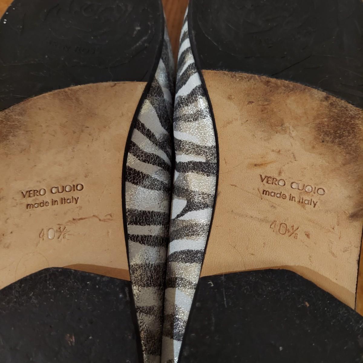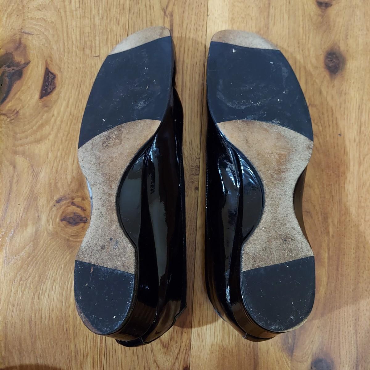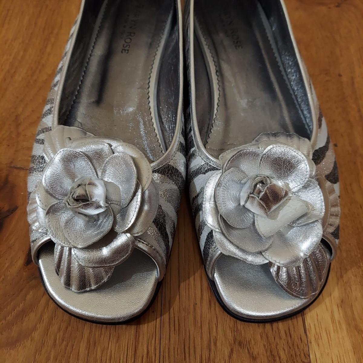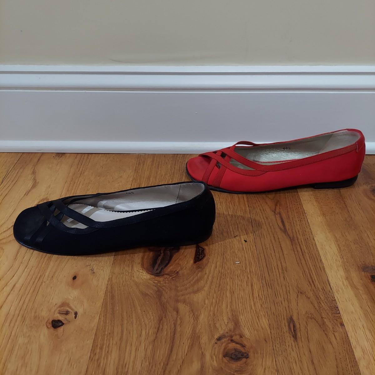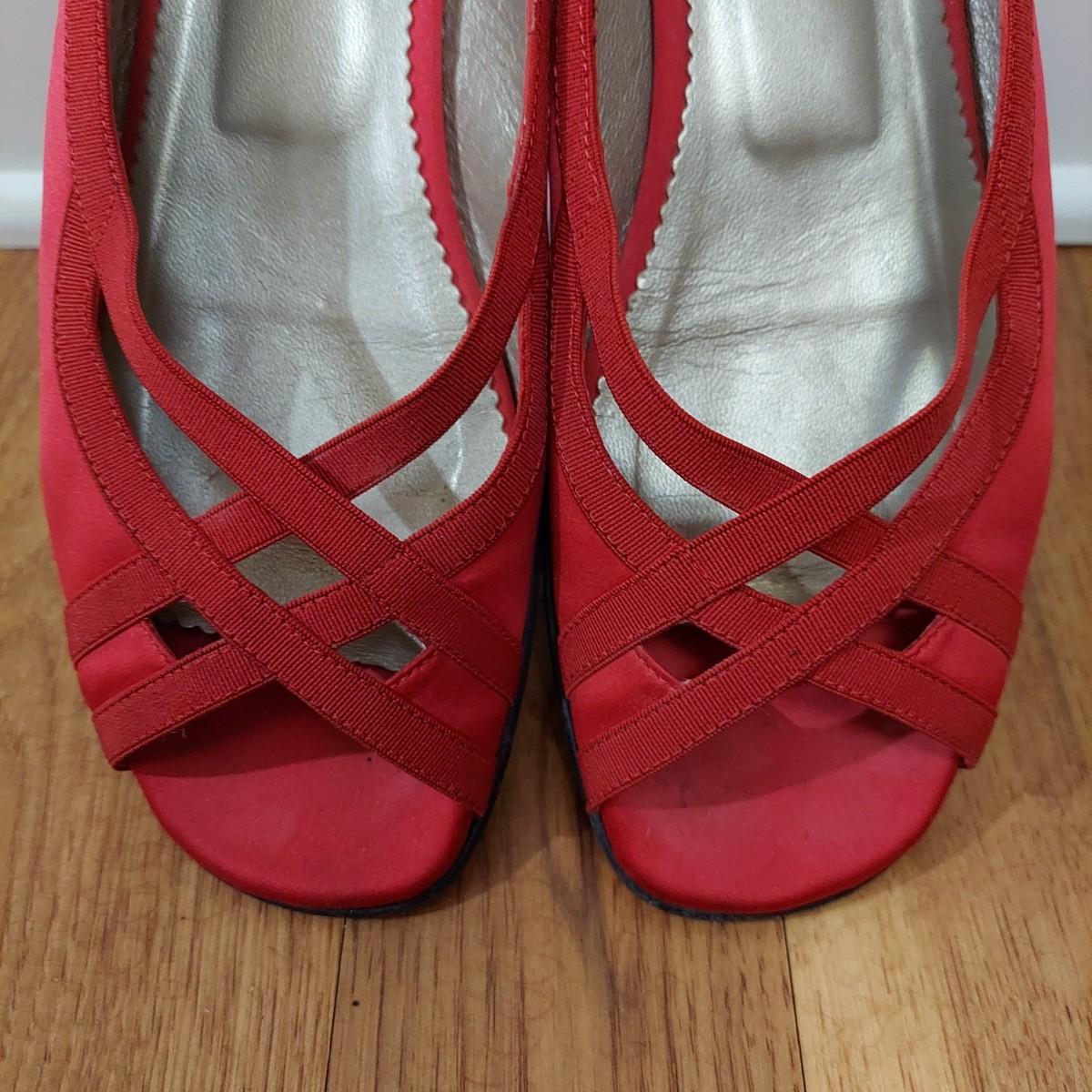 Six pair of Taryn Rose shoes. There are three pair of open toe flats. The silver pair is leather while the black and red pairs are satin. The closed toe flats have a slight wedge. One pair is patent leather and the other pair is suede. There is one pair of sued peep toe heels. They have a 3" heel. The elastic for the buckle is starting to give. Please see photos. All six pairs are either size 40.5 or size 41 which is approximately a US 9.5 and 10. They all have a leather sole with a rubber grip. Made in Italy. Shipping available.