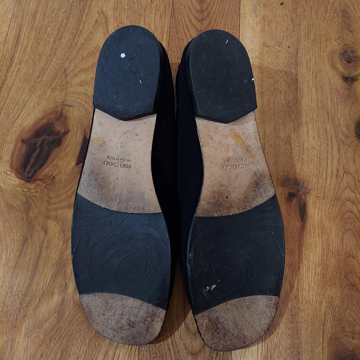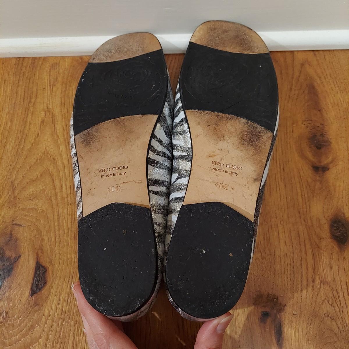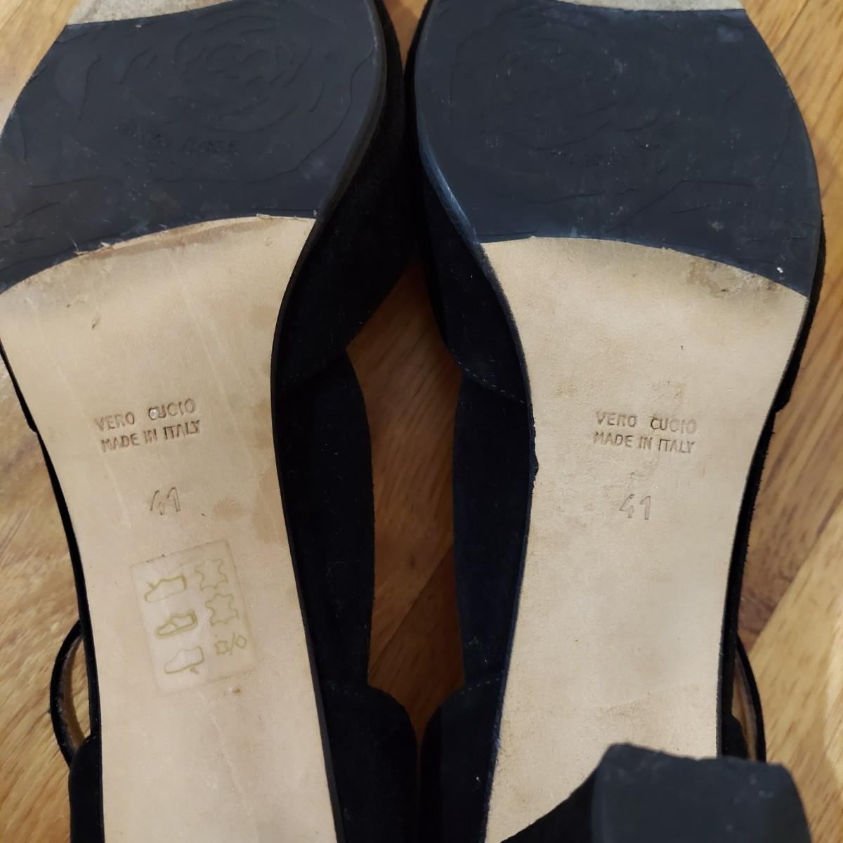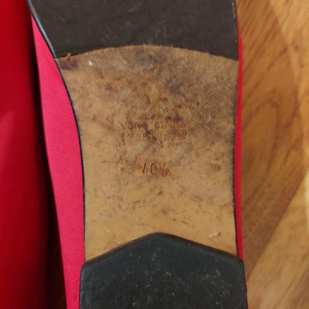 Six pair of Taryn Rose shoes. There are three pair of open toe flats. The silver pair is leather while the black and red pairs are satin. The closed toe flats have a slight wedge. One pair is patent leather and the other pair is suede. There is one pair of sued peep toe heels. They have a 3" heel. The elastic for the buckle is starting to give. Please see photos. All six pairs are either size 40.5 or size 41 which is approximately a US 9.5 and 10. They all have a leather sole with a rubber grip. Made in Italy. Shipping available.