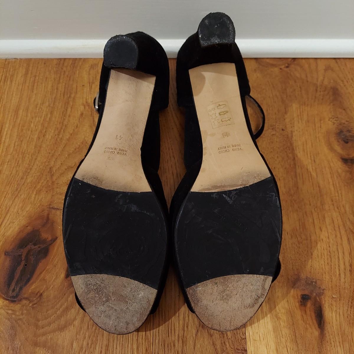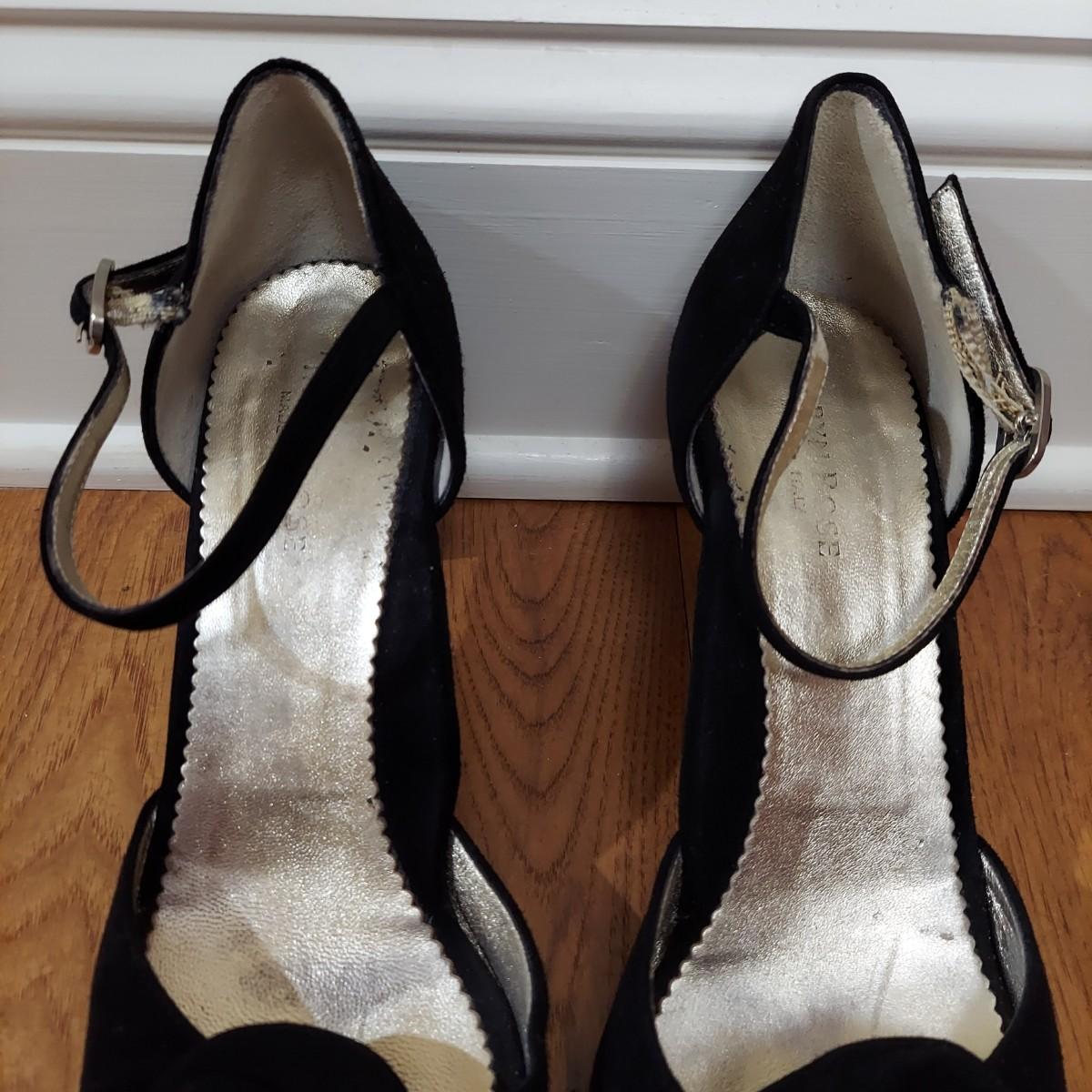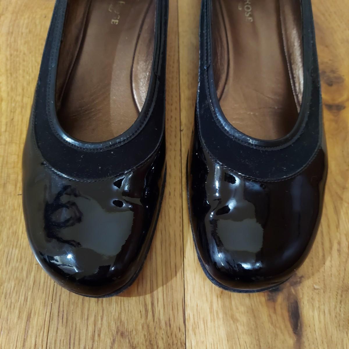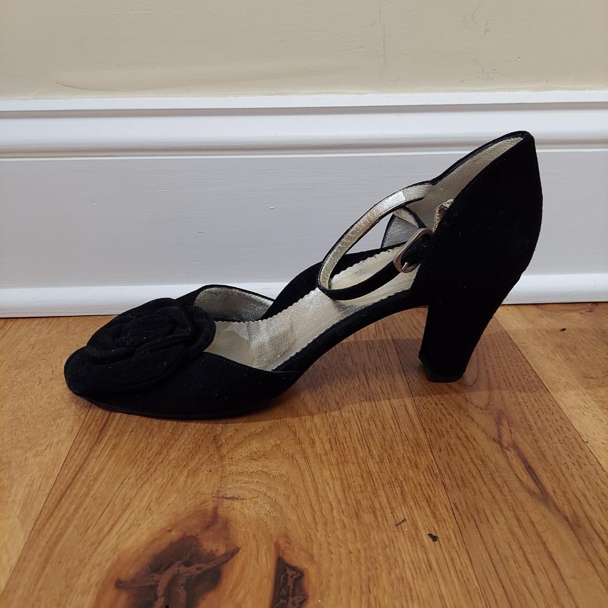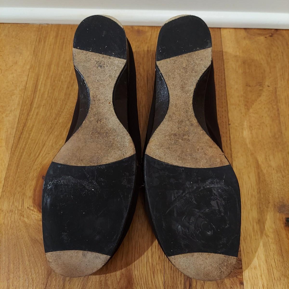 Six pair of Taryn Rose shoes. There are three pair of open toe flats. The silver pair is leather while the black and red pairs are satin. The closed toe flats have a slight wedge. One pair is patent leather and the other pair is suede. There is one pair of sued peep toe heels. They have a 3" heel. The elastic for the buckle is starting to give. Please see photos. All six pairs are either size 40.5 or size 41 which is approximately a US 9.5 and 10. They all have a leather sole with a rubber grip. Made in Italy. Shipping available.
