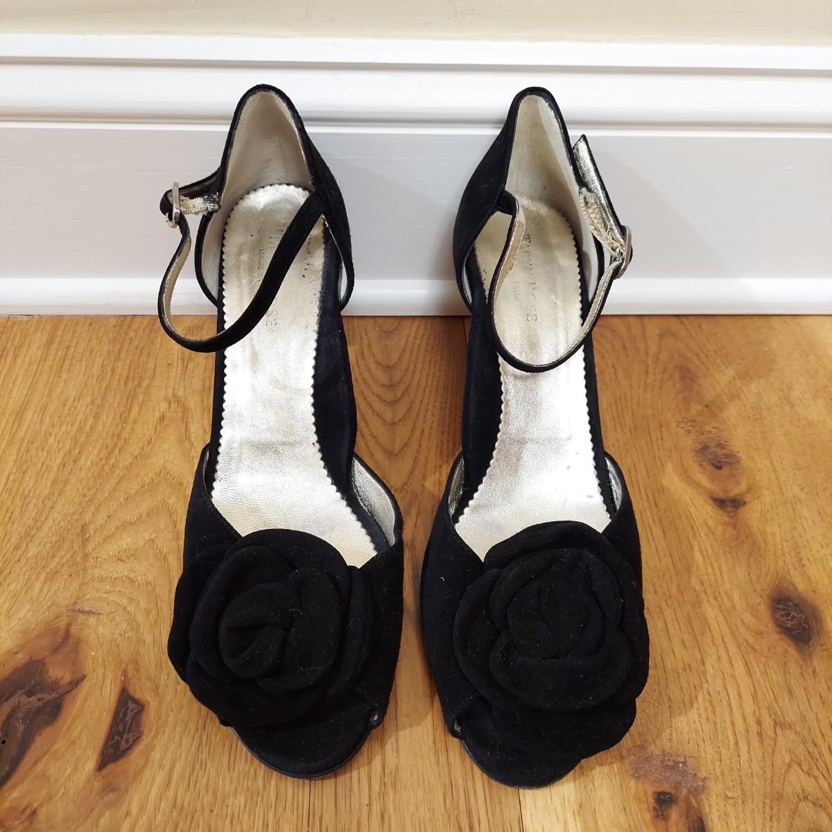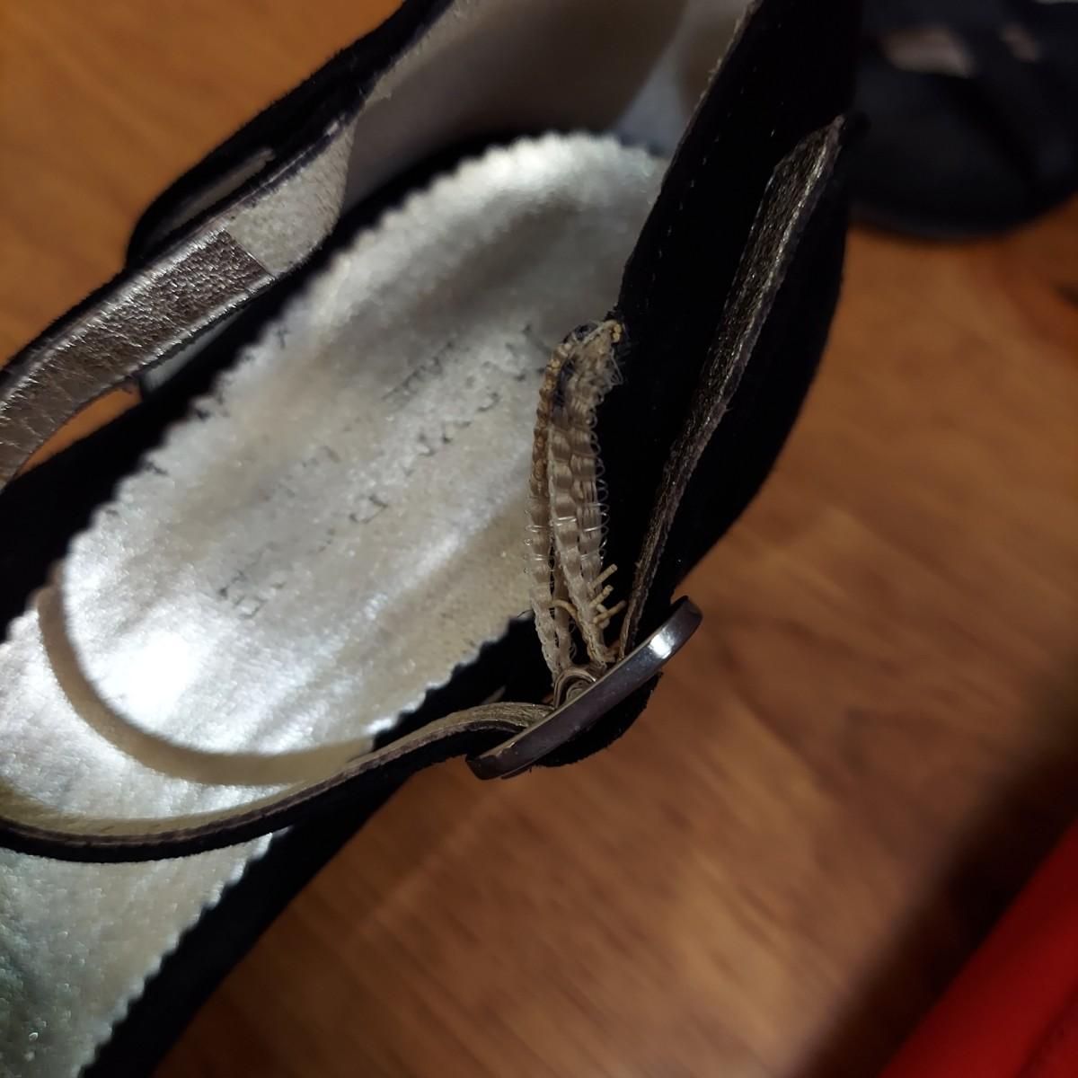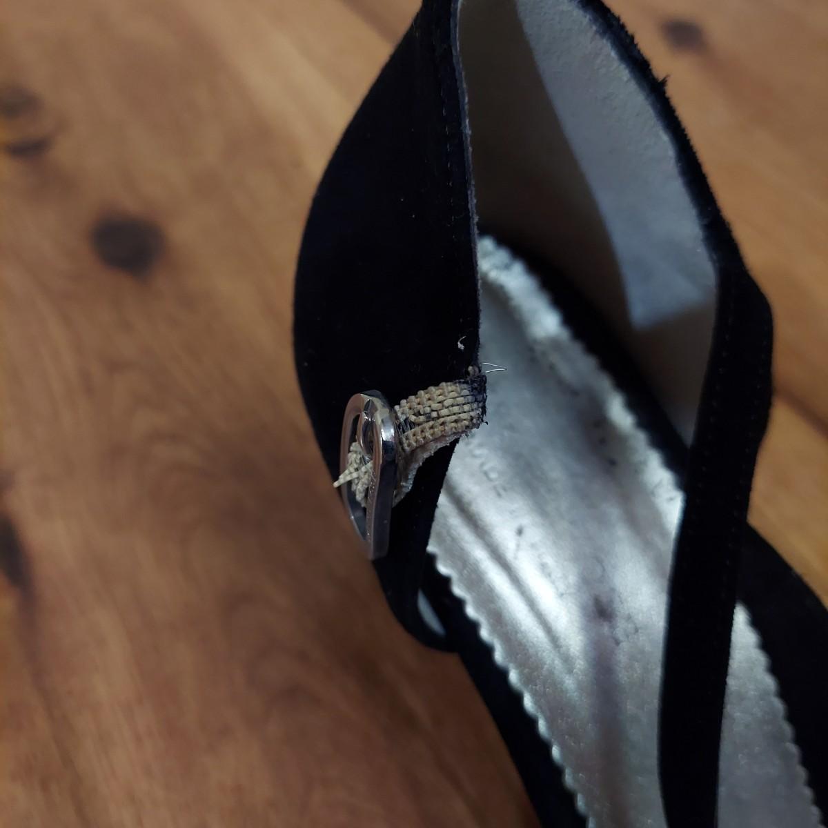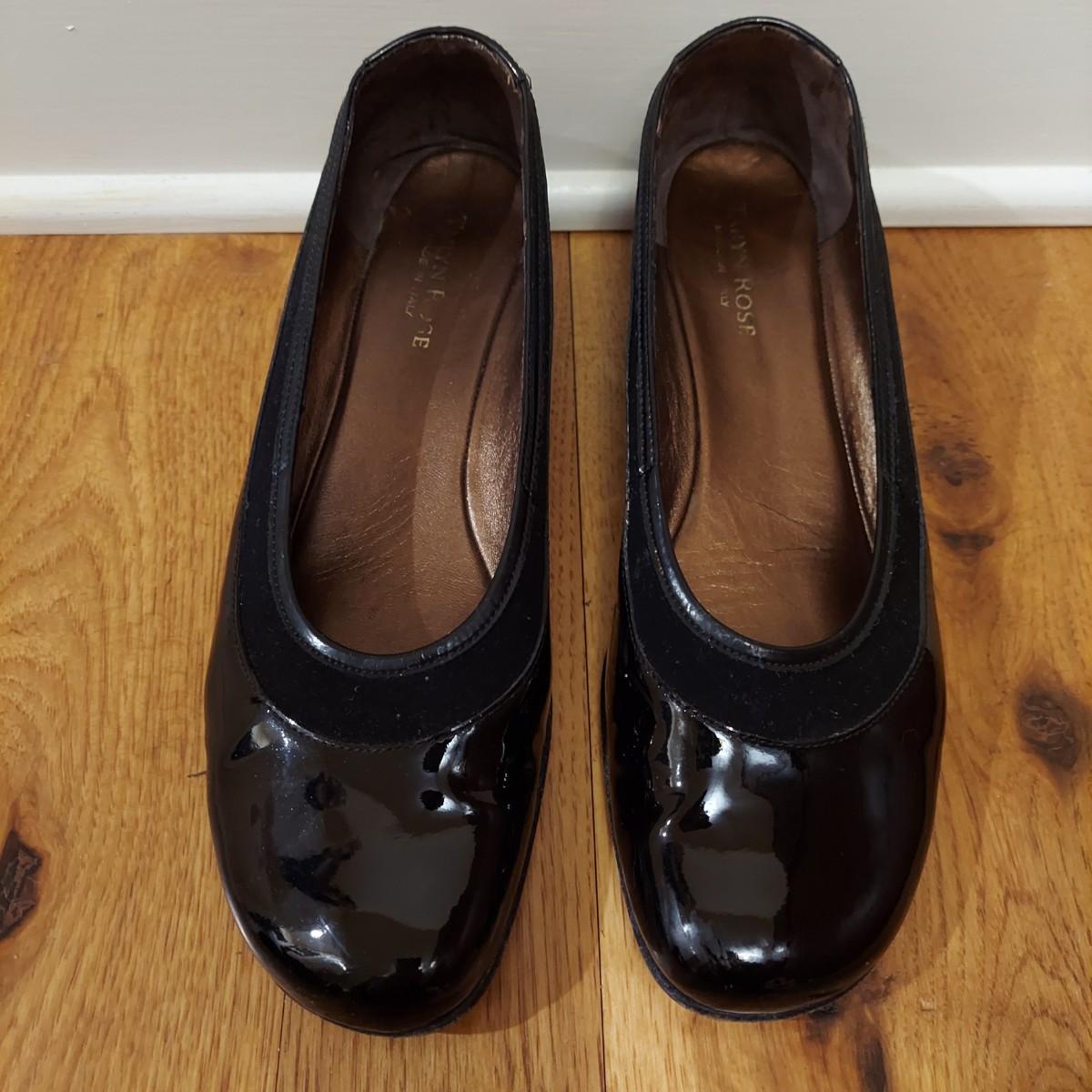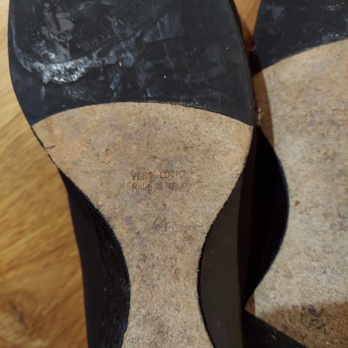 Six pair of Taryn Rose shoes. There are three pair of open toe flats. The silver pair is leather while the black and red pairs are satin. The closed toe flats have a slight wedge. One pair is patent leather and the other pair is suede. There is one pair of sued peep toe heels. They have a 3" heel. The elastic for the buckle is starting to give. Please see photos. All six pairs are either size 40.5 or size 41 which is approximately a US 9.5 and 10. They all have a leather sole with a rubber grip. Made in Italy. Shipping available.