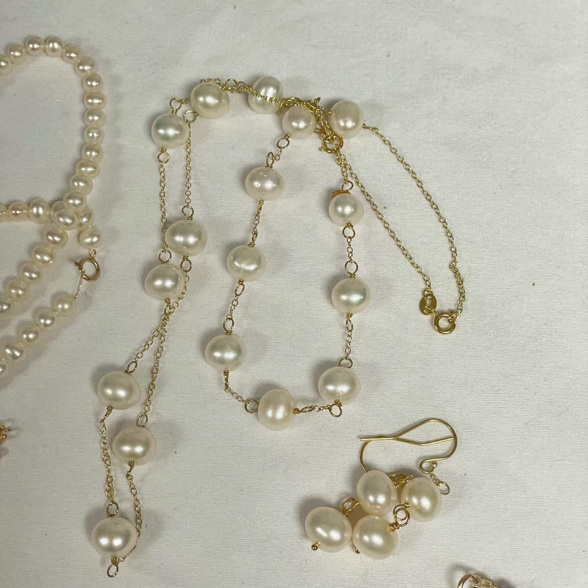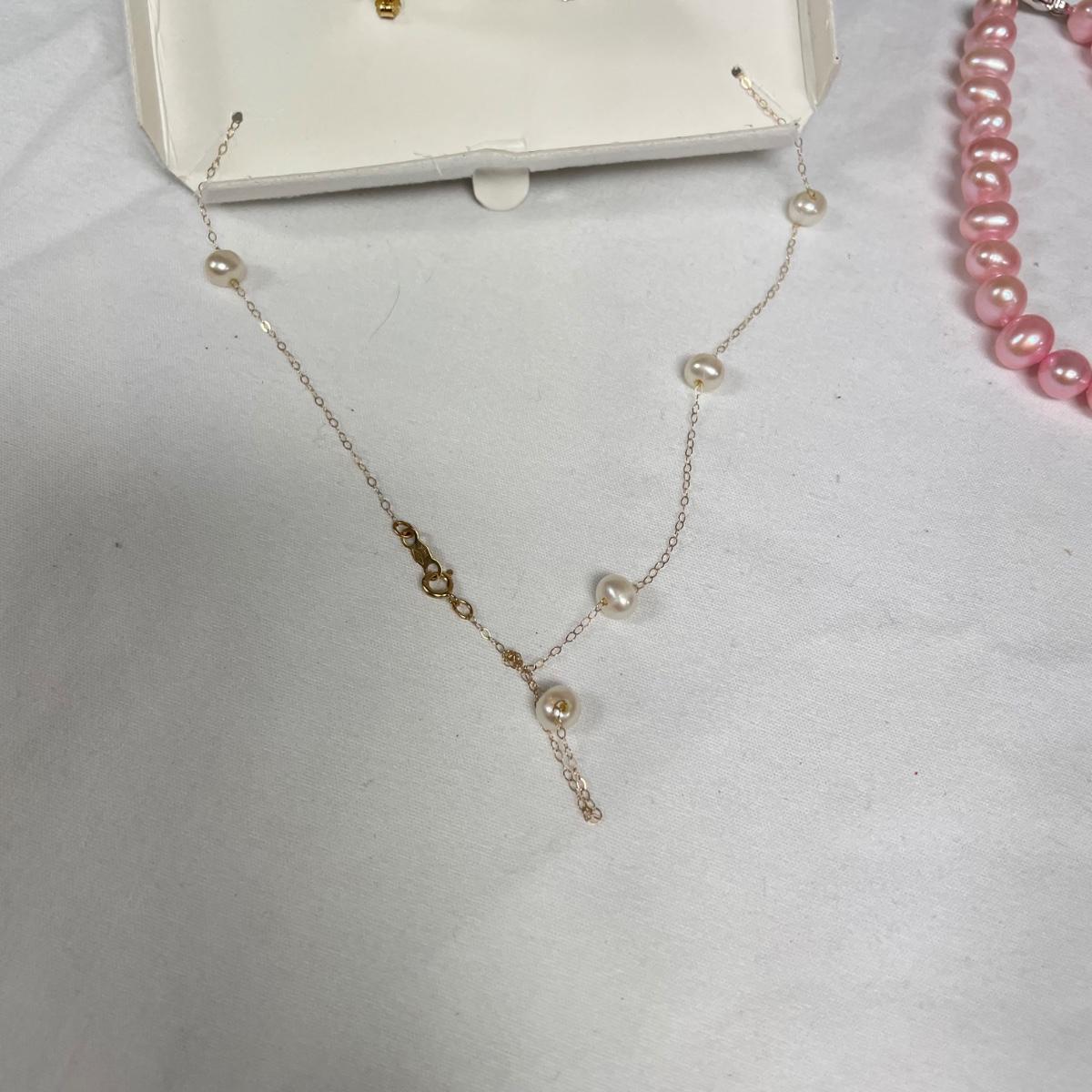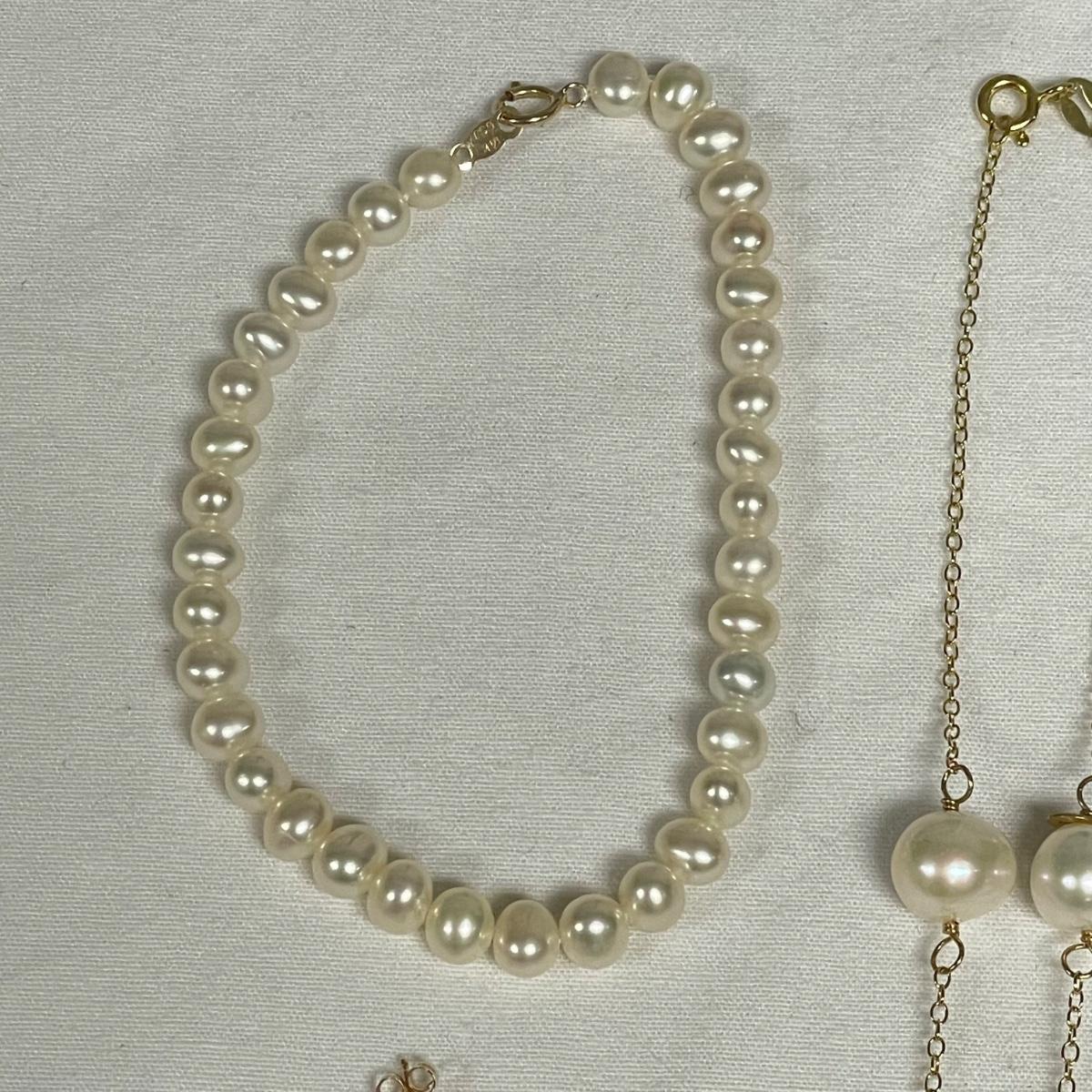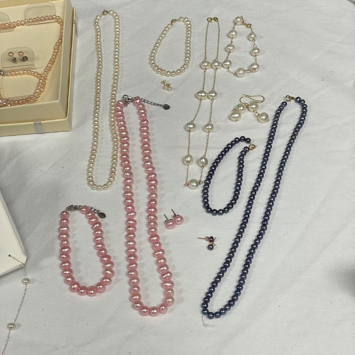 Six sets of pearls and pearl-like jewelry. Each set includes earrings for pierced ears, a necklace and bracelet except the set shown in a black box which has earrings and a necklace without a bracelet. Gold clasps and chains appear to be stamped 14K, the pink freshwater set has 925 stamped and the baby/child set (coral colored) does not appear to be stamped. The black boxed set’s necklace has a small knot currently. Most necklaces are about 18”. See images for all markings found. We cannot guarantee the authenticity of the gemstones. All sales are final. No returns or refunds. Please bid accordingly.
