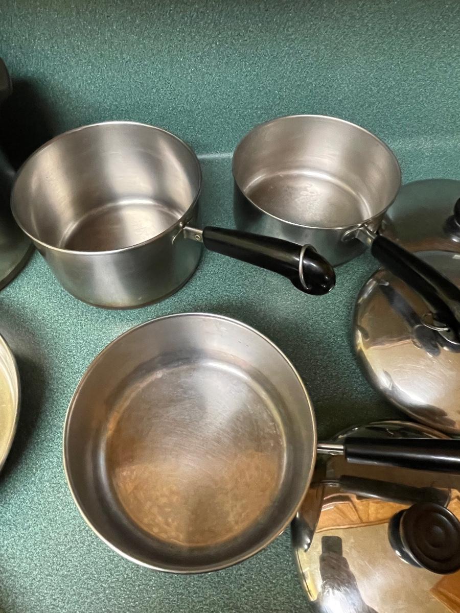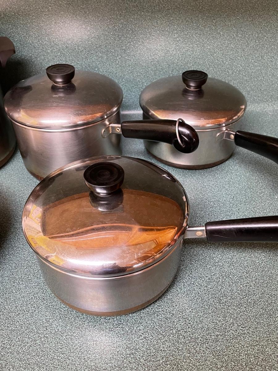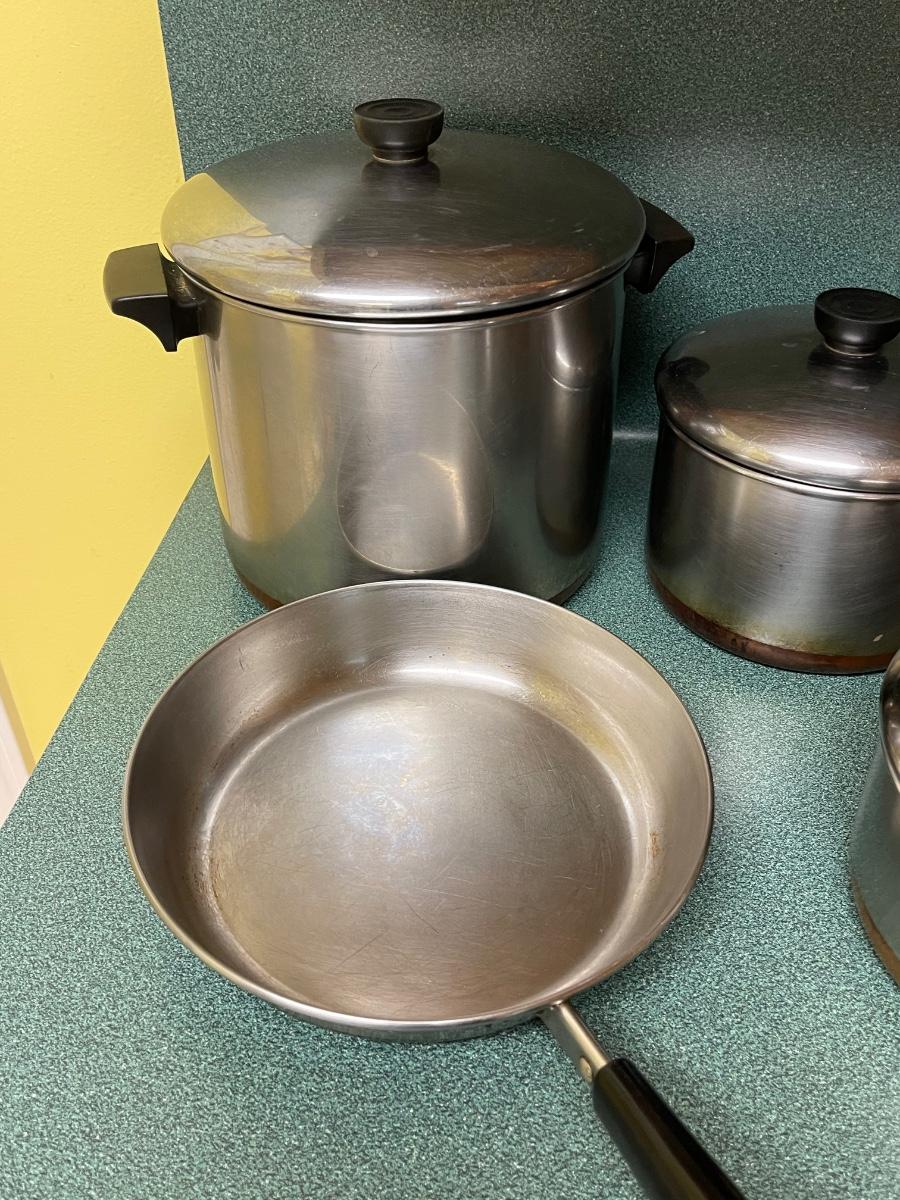 6 piece revere cookware- 5 lids-8 qt boil pot, skillet 9.5”, 3 qt pot, two 2qt pots, 1 qt pot
