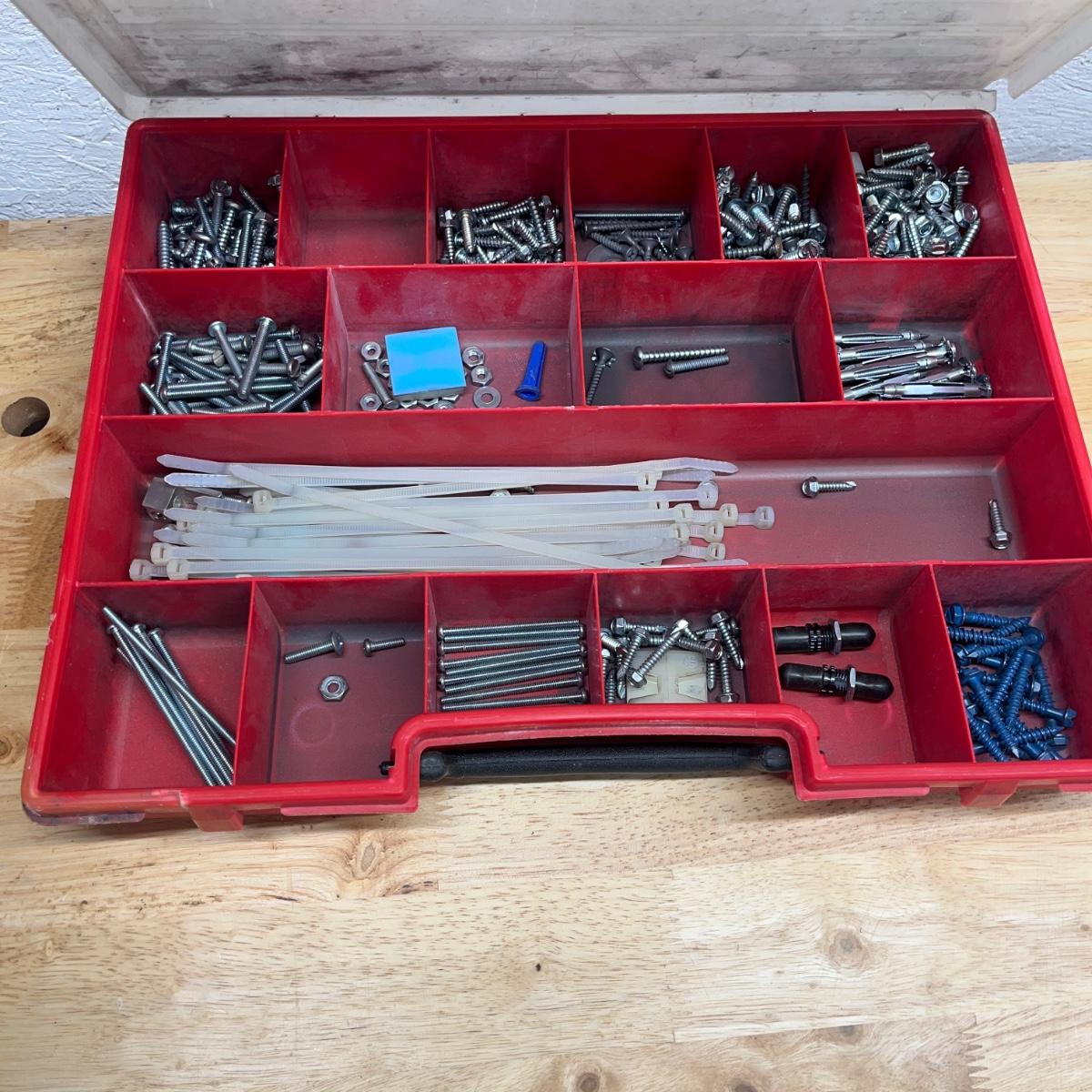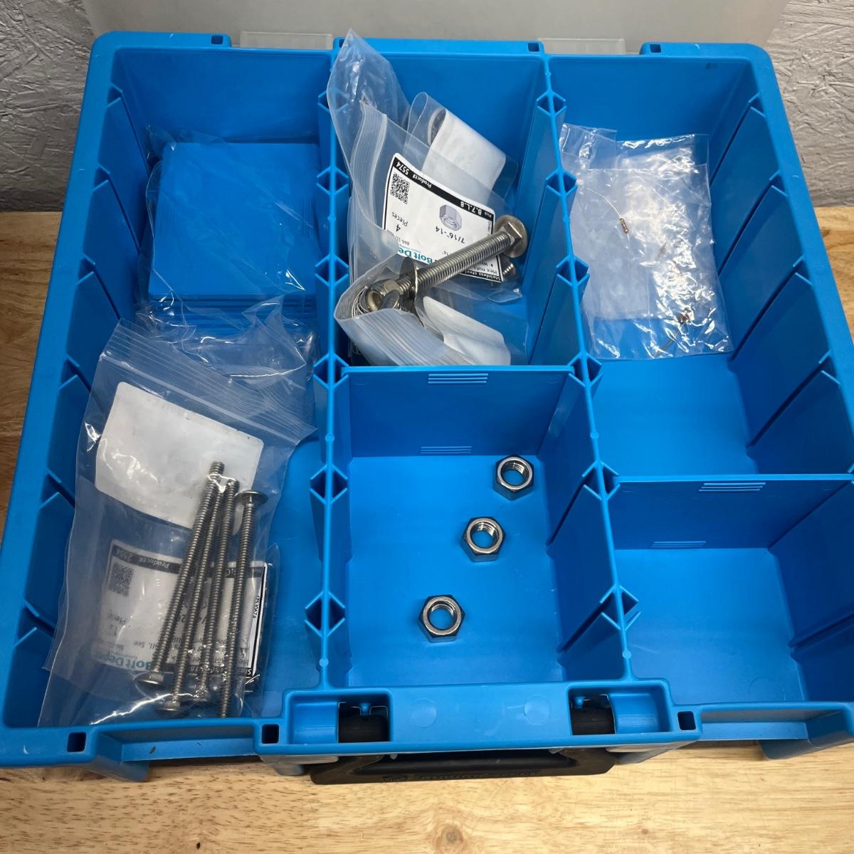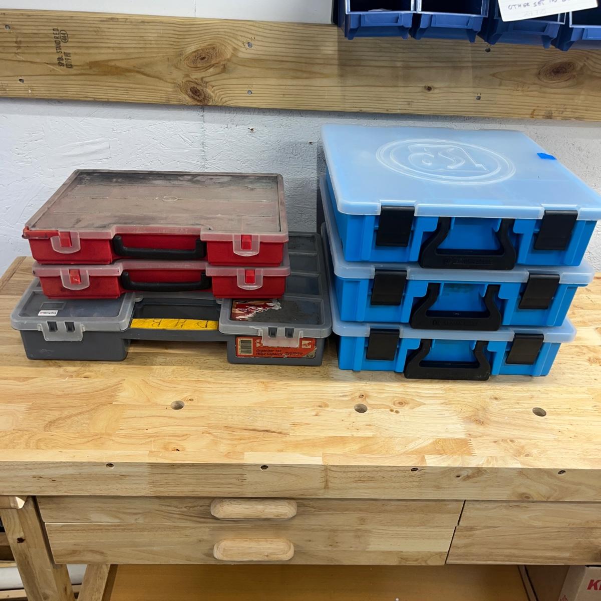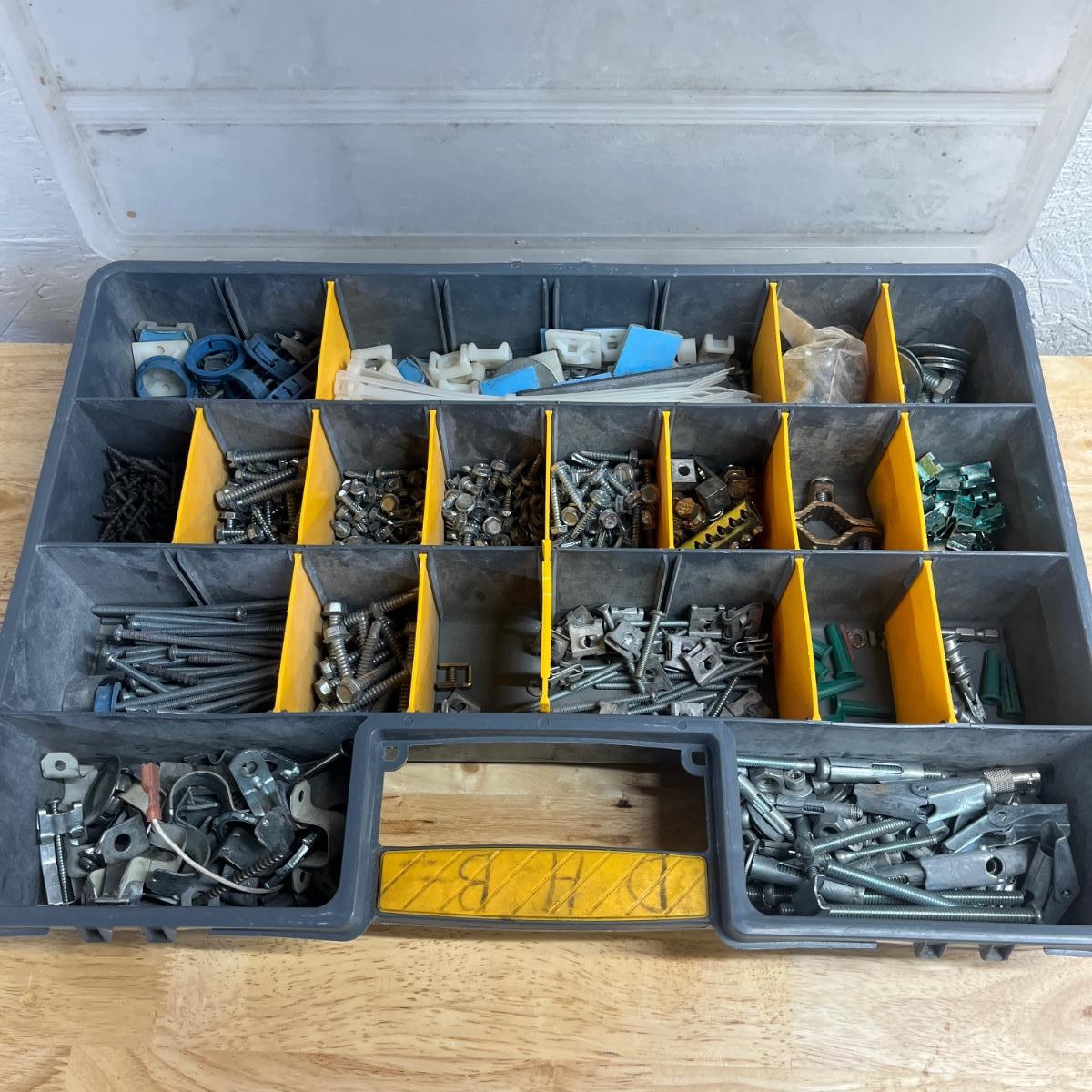 Lot contains six plastic bins with the contents that includes wire nuts, bolts, wire connectors, screws, toggle bolts and more. Largest bin measures 18” x 12” x 3.25”H. One bin has break on top, see pictures. Bench not included but available in auction.