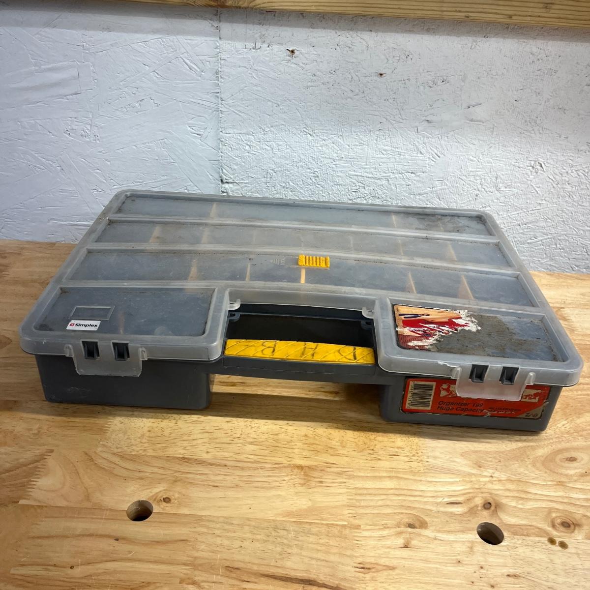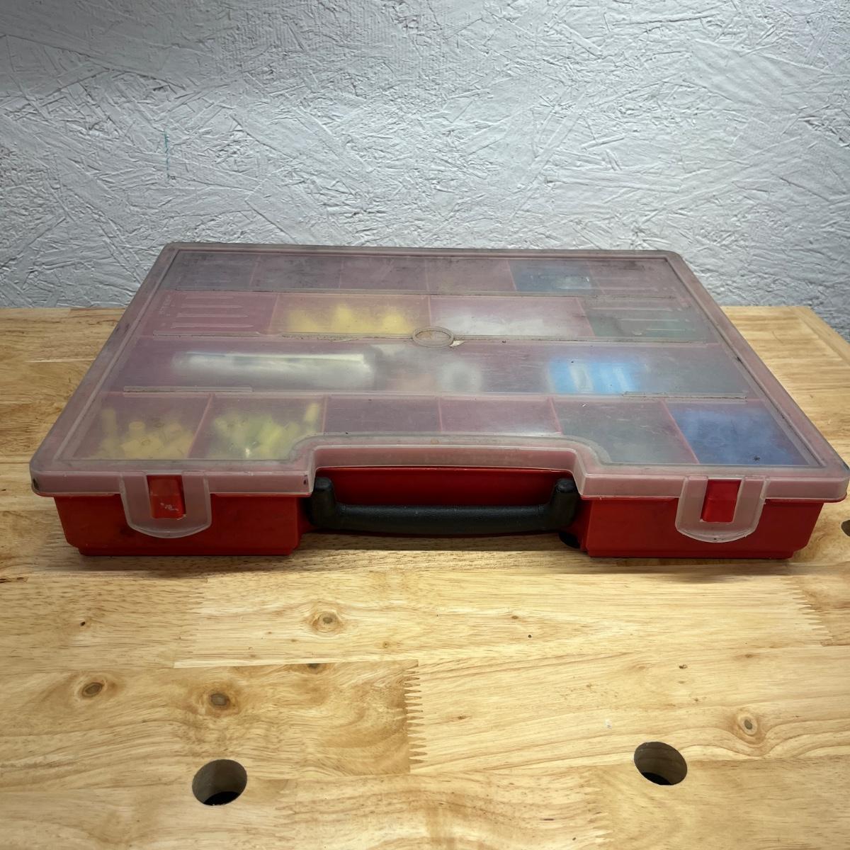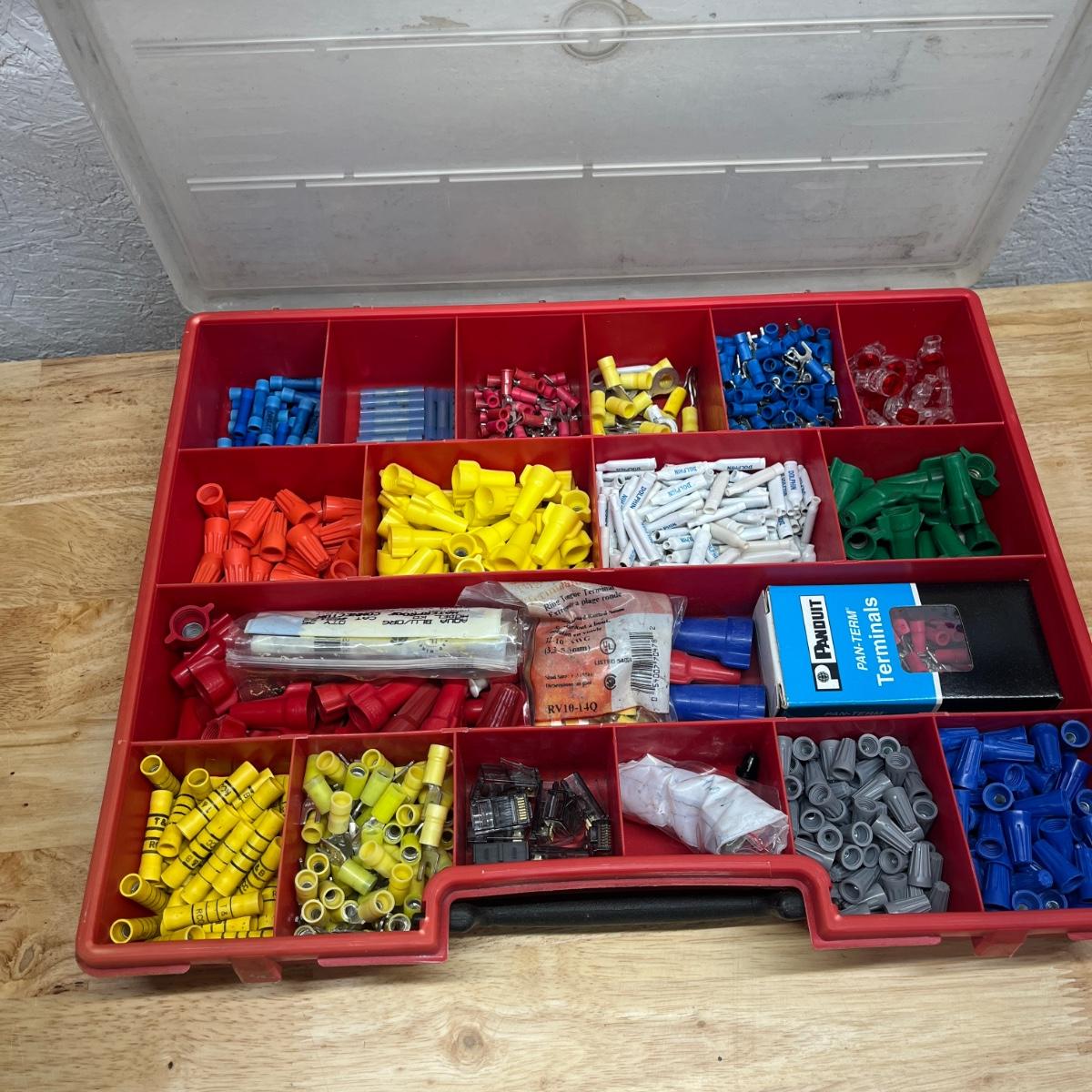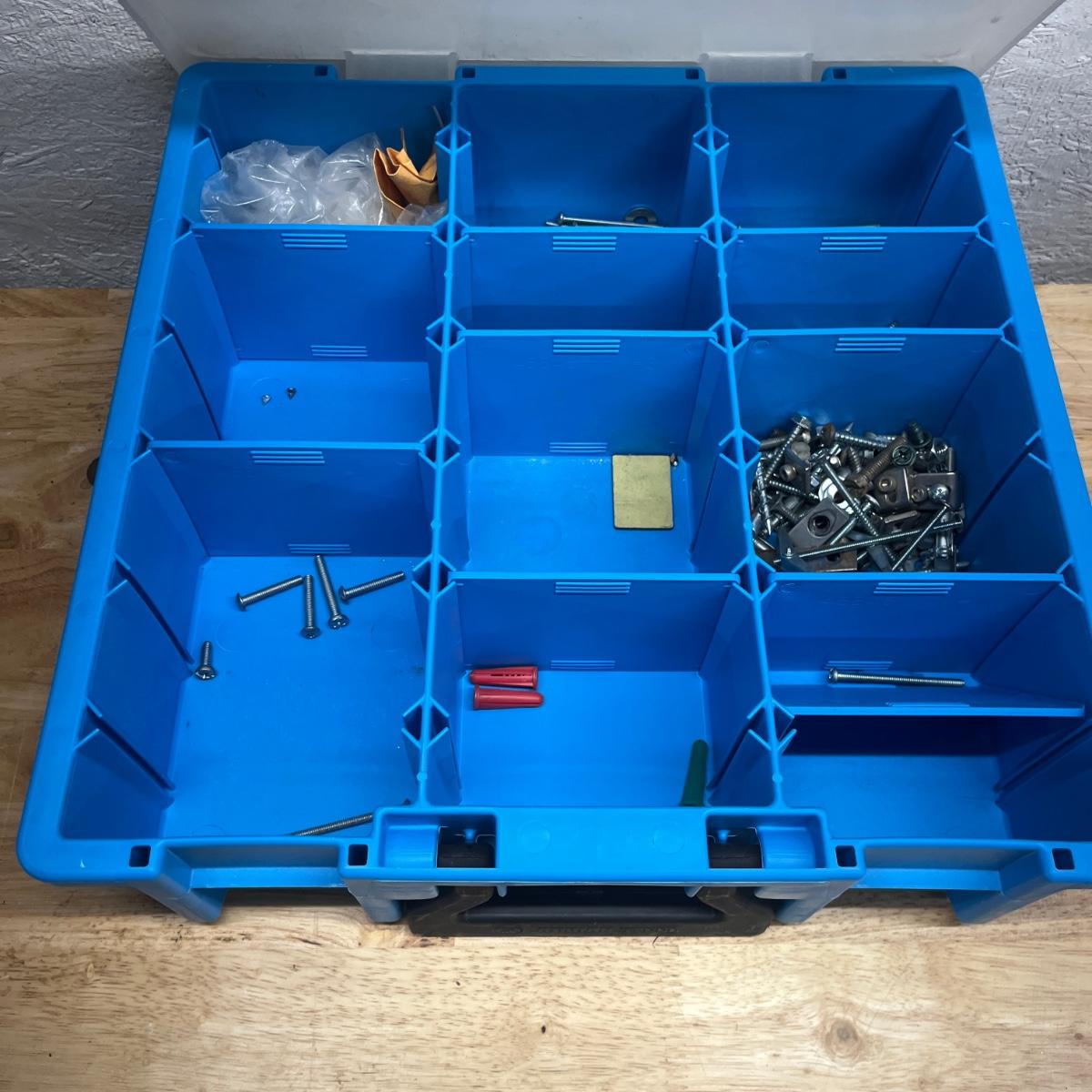 Lot contains six plastic bins with the contents that includes wire nuts, bolts, wire connectors, screws, toggle bolts and more. Largest bin measures 18” x 12” x 3.25”H. One bin has break on top, see pictures. Bench not included but available in auction.