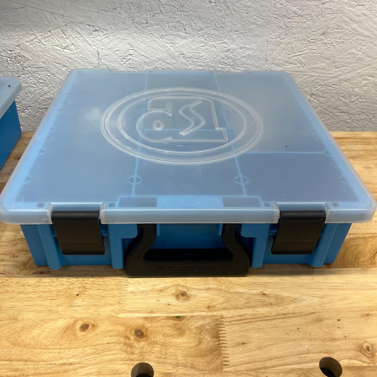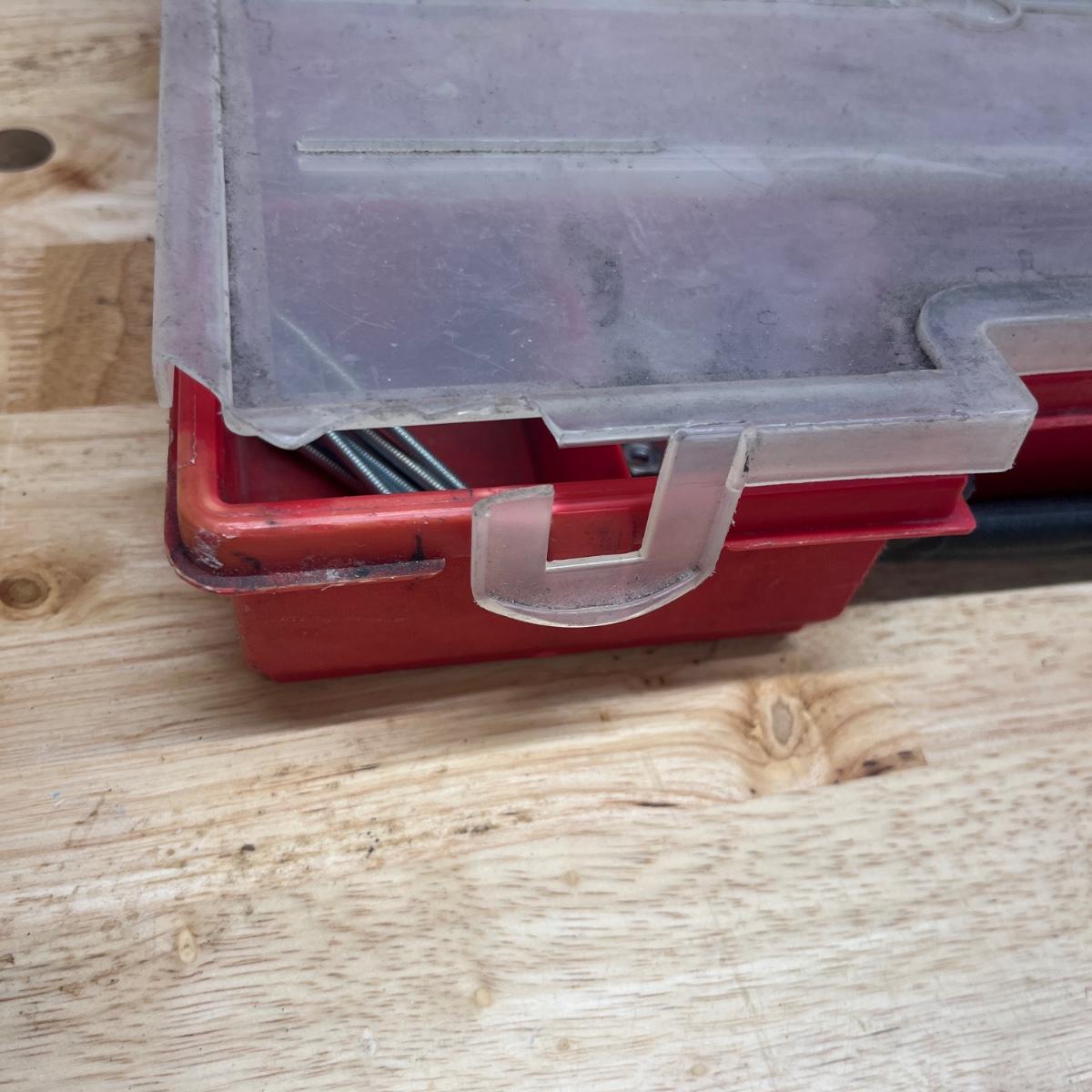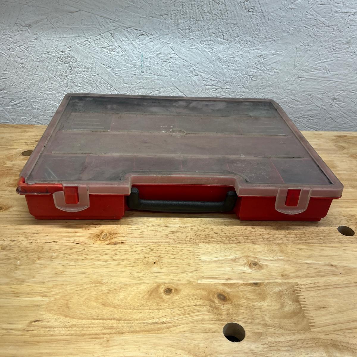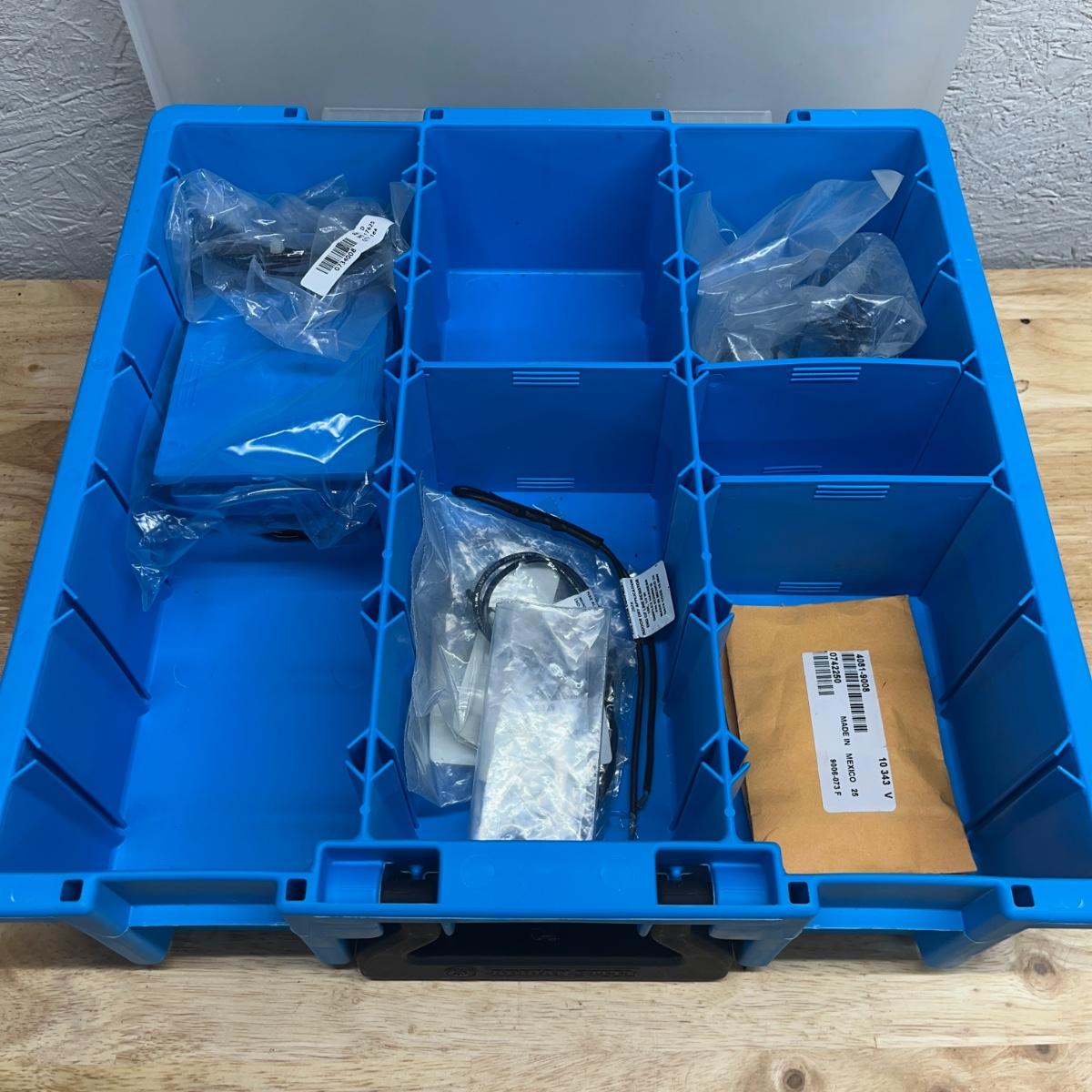 Lot contains six plastic bins with the contents that includes wire nuts, bolts, wire connectors, screws, toggle bolts and more. Largest bin measures 18” x 12” x 3.25”H. One bin has break on top, see pictures. Bench not included but available in auction.