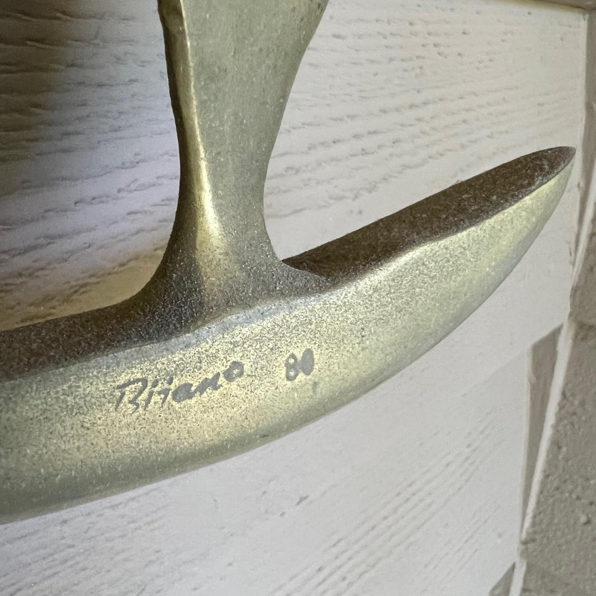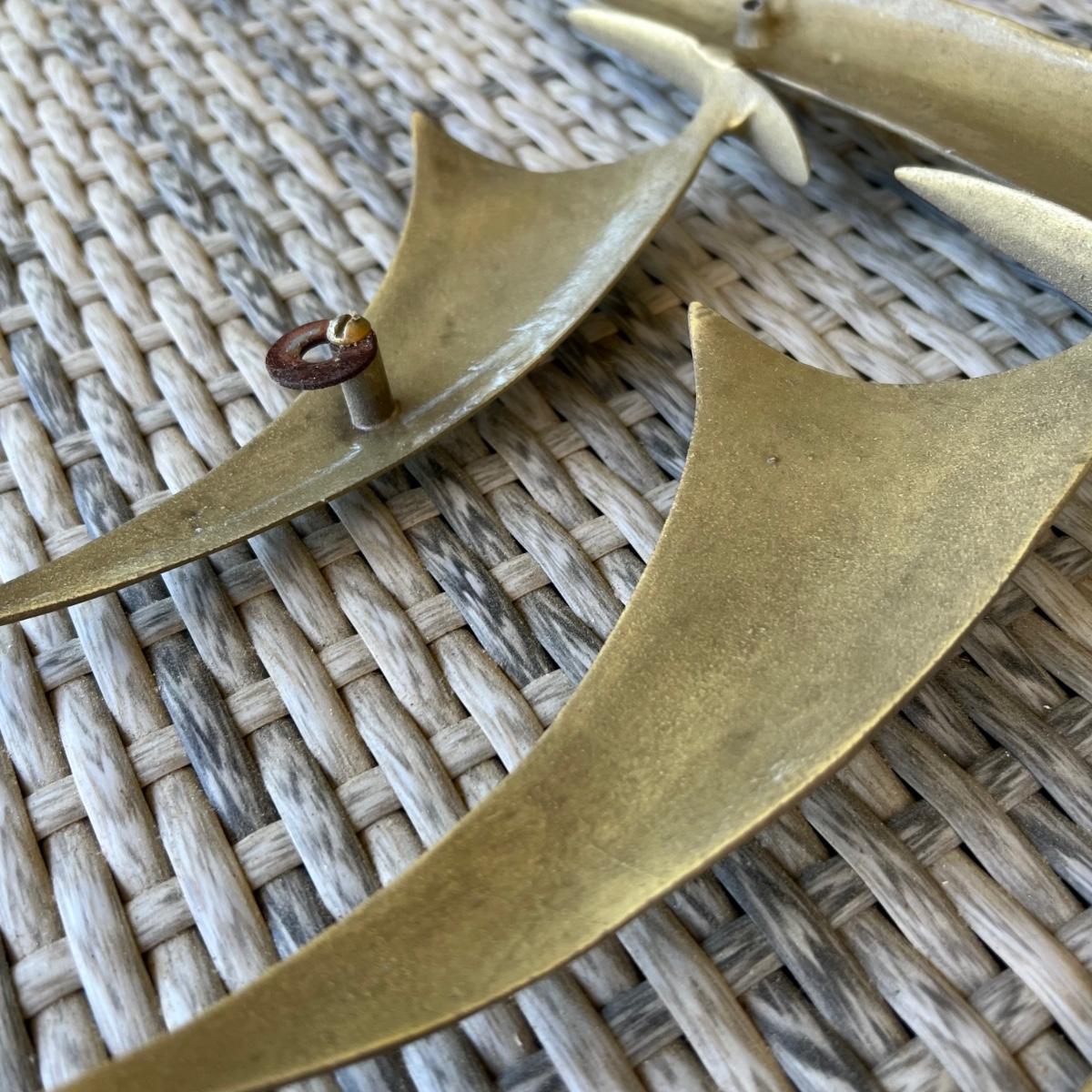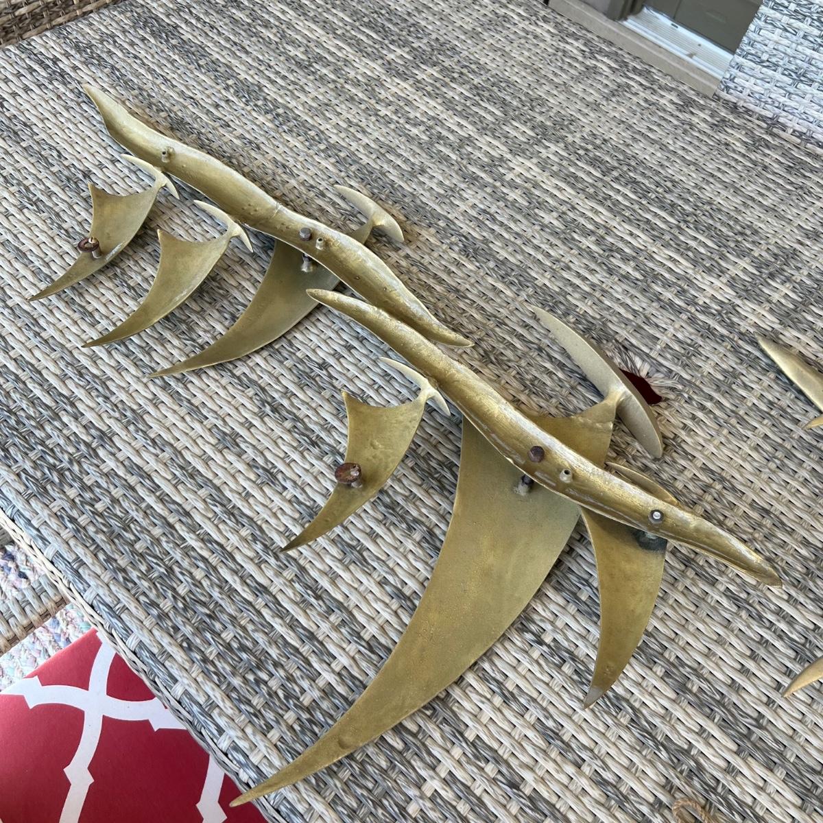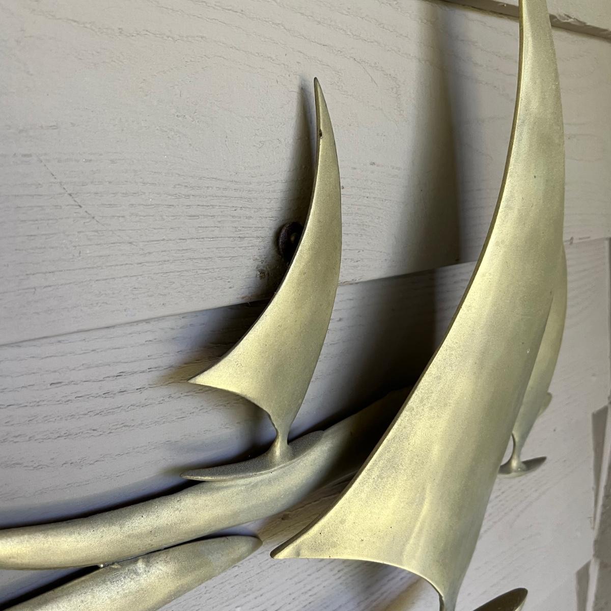 This brass Bitano wall hanging sculpture features six sailboats. It is signed and has two hooks for hanging. Note there are matching pieces in this auction.