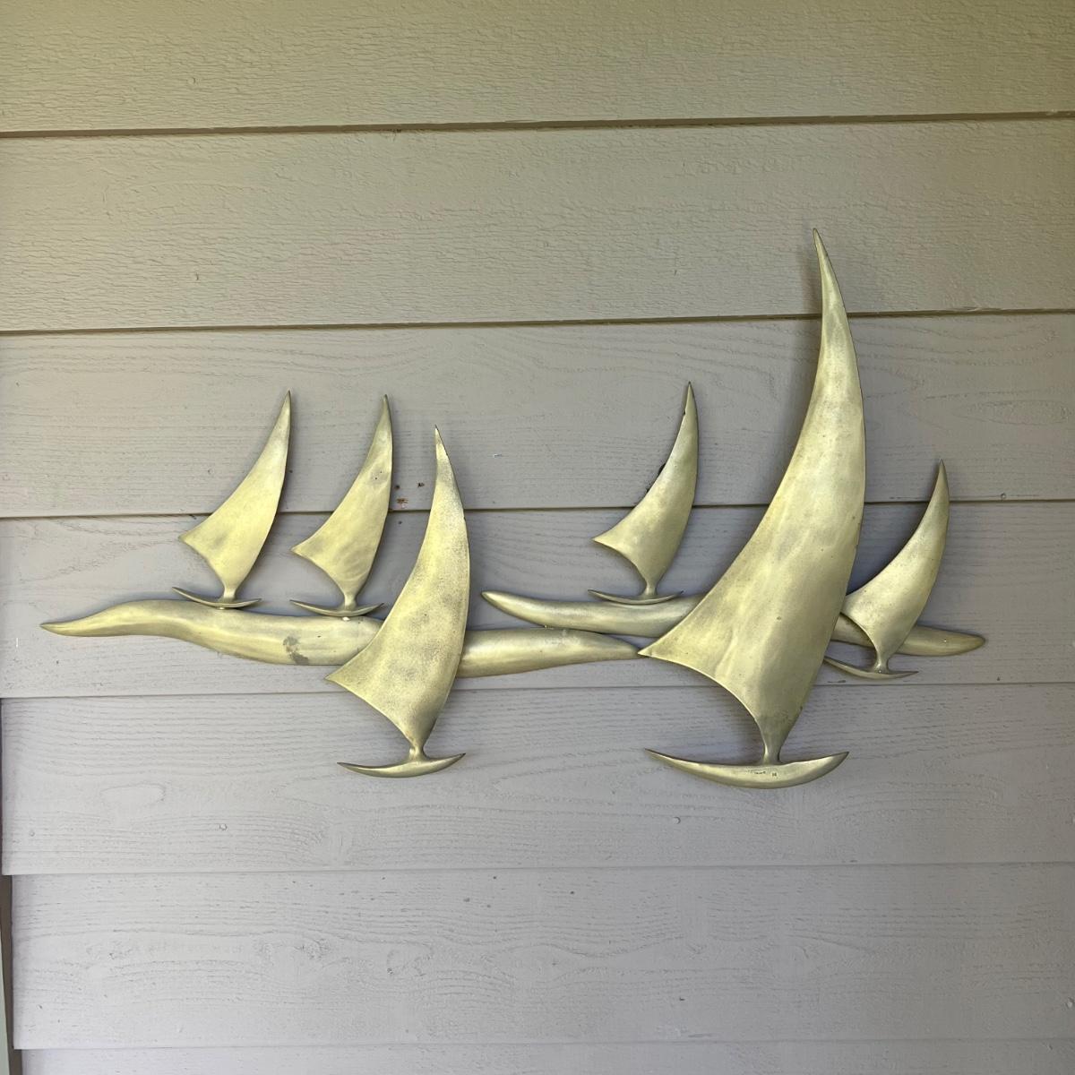Six Sailboats Signed Bitano Brass Wall Hanging Sculpture (2D-RG)