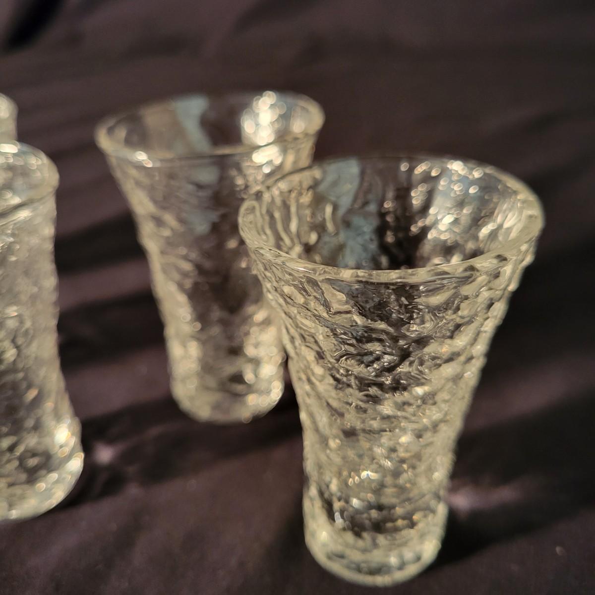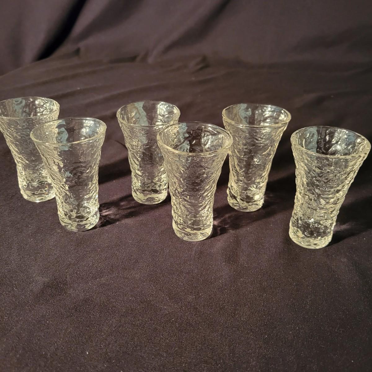 A collection of six shot glasses in good condition. These pieces feature textured glass and measure approximately 2" x 3". Shipping available