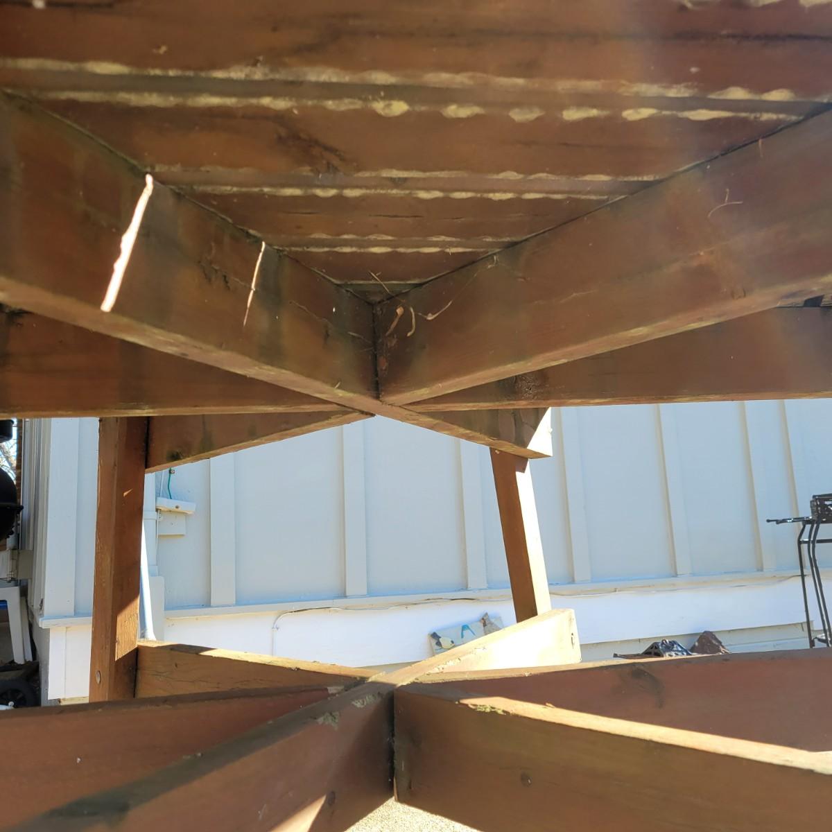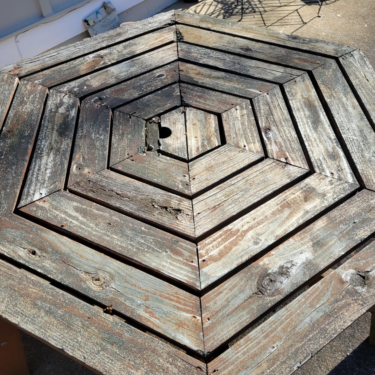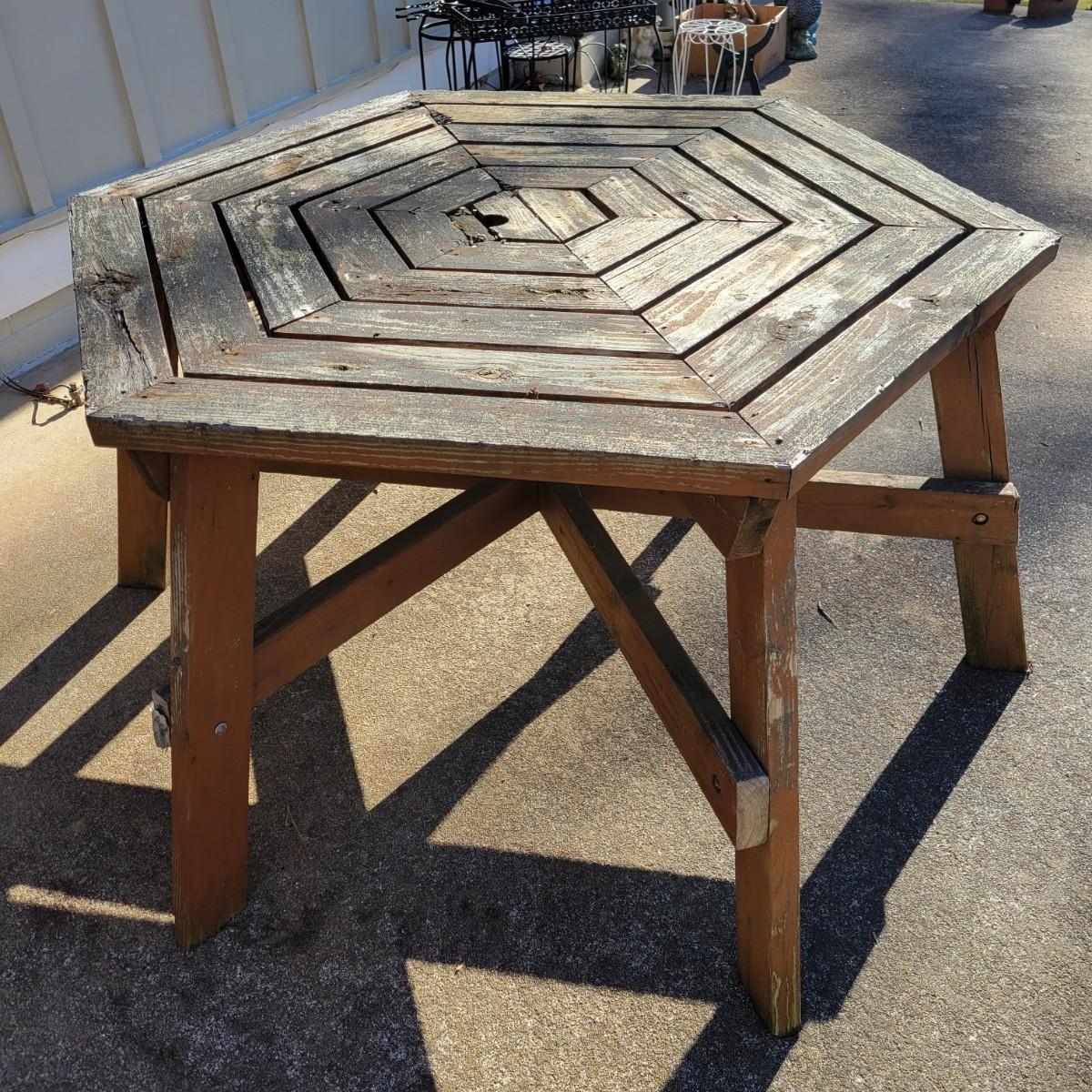 A six sided wooden table that measures approximately 54"D x 29.5"H. It is a little weather worn but is still solid. Local pickup only. Winning bidder must bring assistance to help move and load this item due to its weight and/or size.