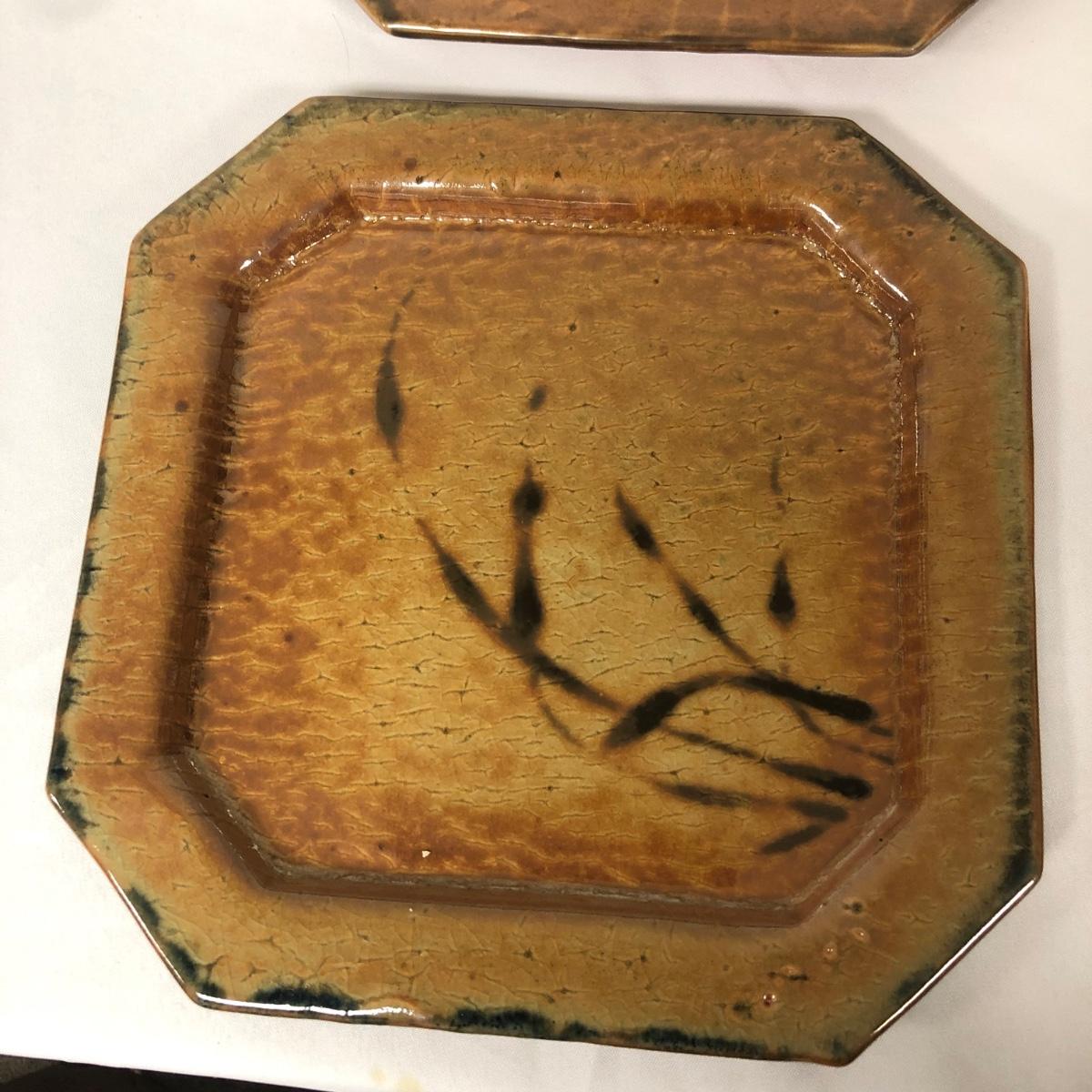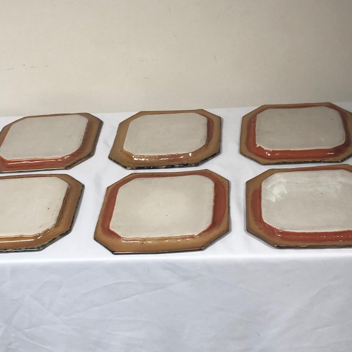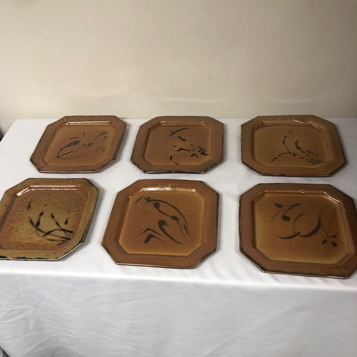 This lot includes six plates. Each plate is signed, with the same initals/symbol. Each plate is unique and handcrafted. Plates measure 11” x 11” each. Plates are sturdy; shipping Available.