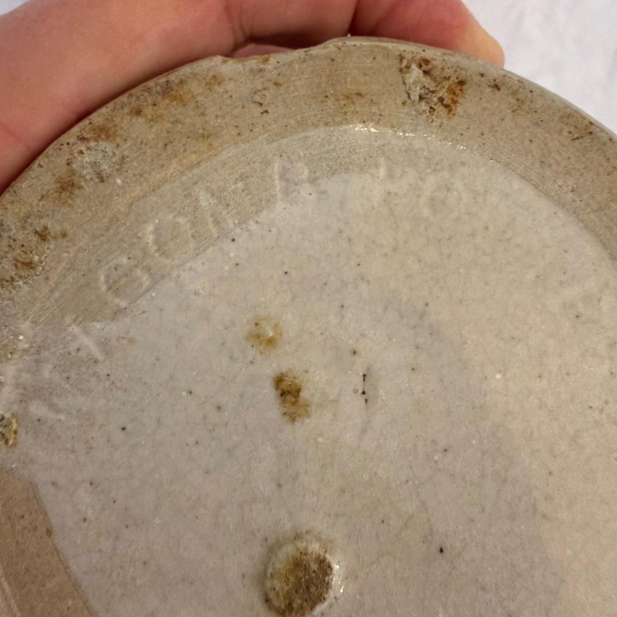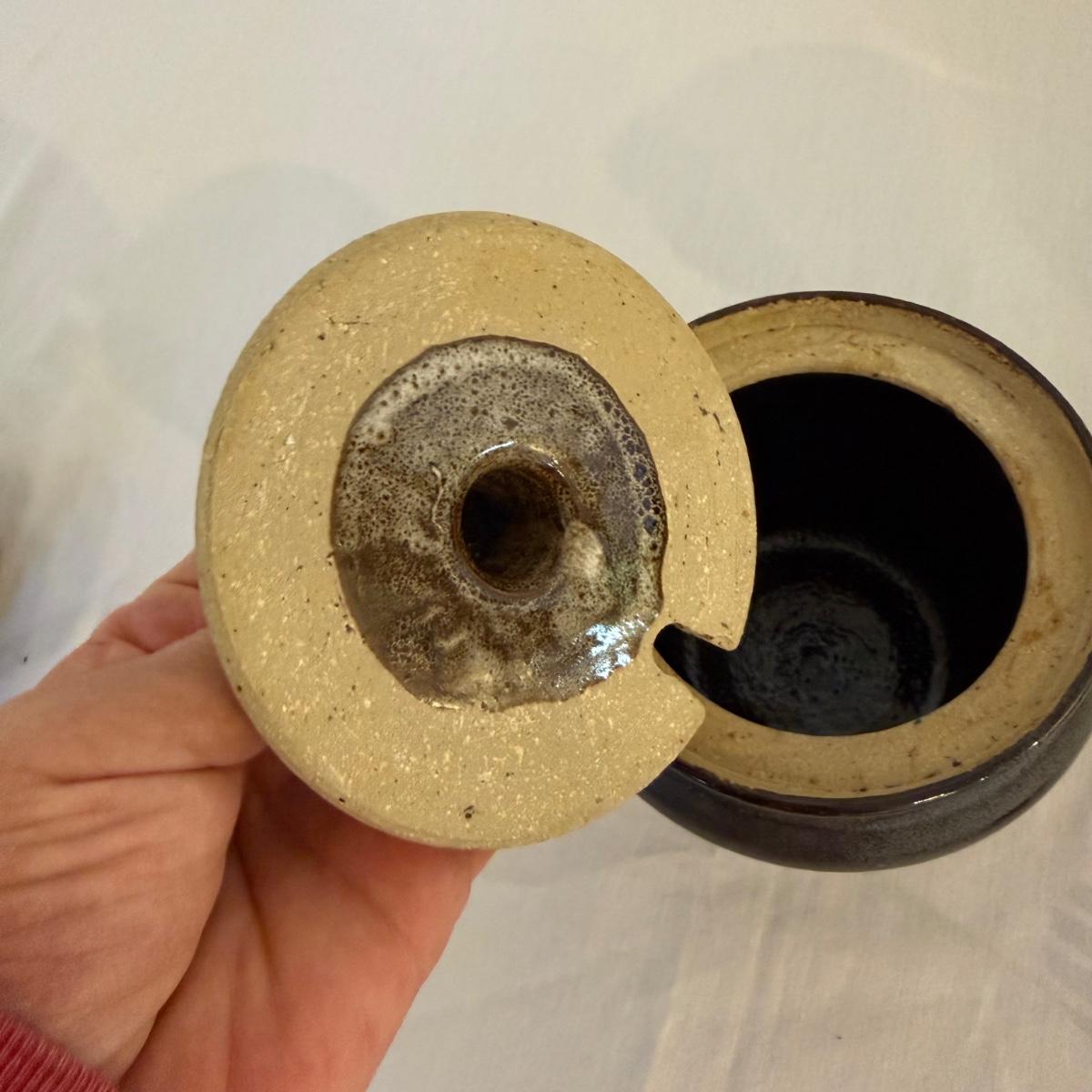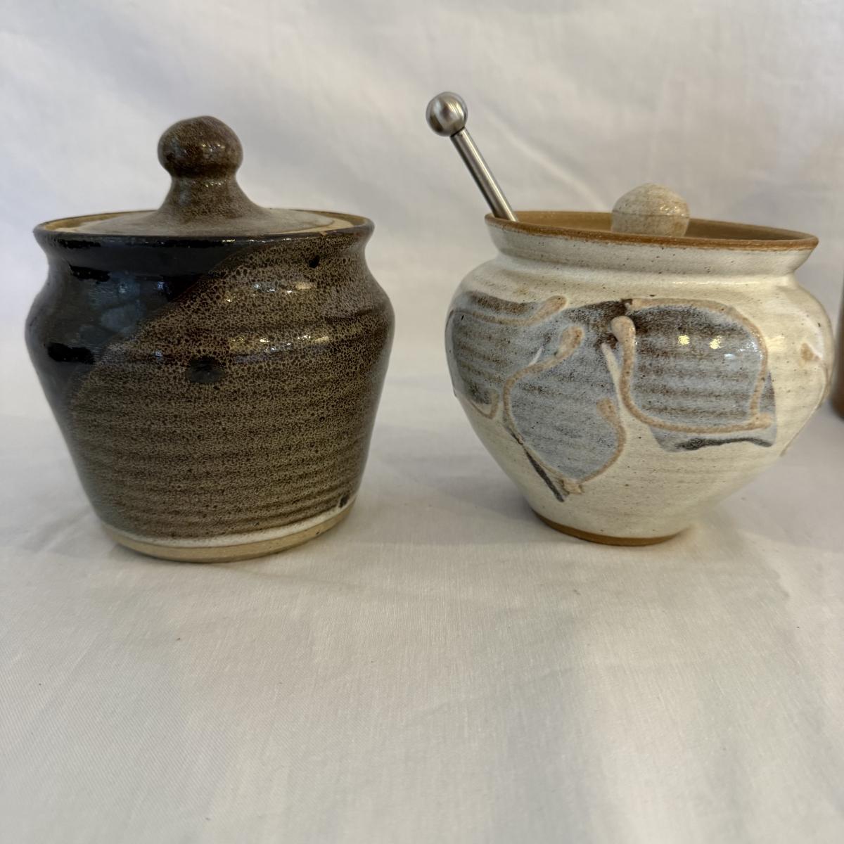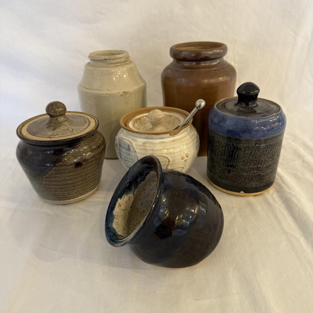 Six unique pottery jars that complement each other well. Two honey/sugar jars, a half-horizontal jar, a textured lidded jar, a standard brown crock and a light colored tall jar. The light colored tall jar appears to once have had a lid. This piece also has a hard-to-decipher stamp on the bottom. The half-horizontal jar, the lidded blue jar and dark honey jar appear to be stamped “Eugene” with dates. The lighter colored honey/sugar jar has a chip on the rim and a makers mark on the lower part near the bottom, see images. The taller brown crock measures 4.75” x 6.75”. See images. Shipping available.