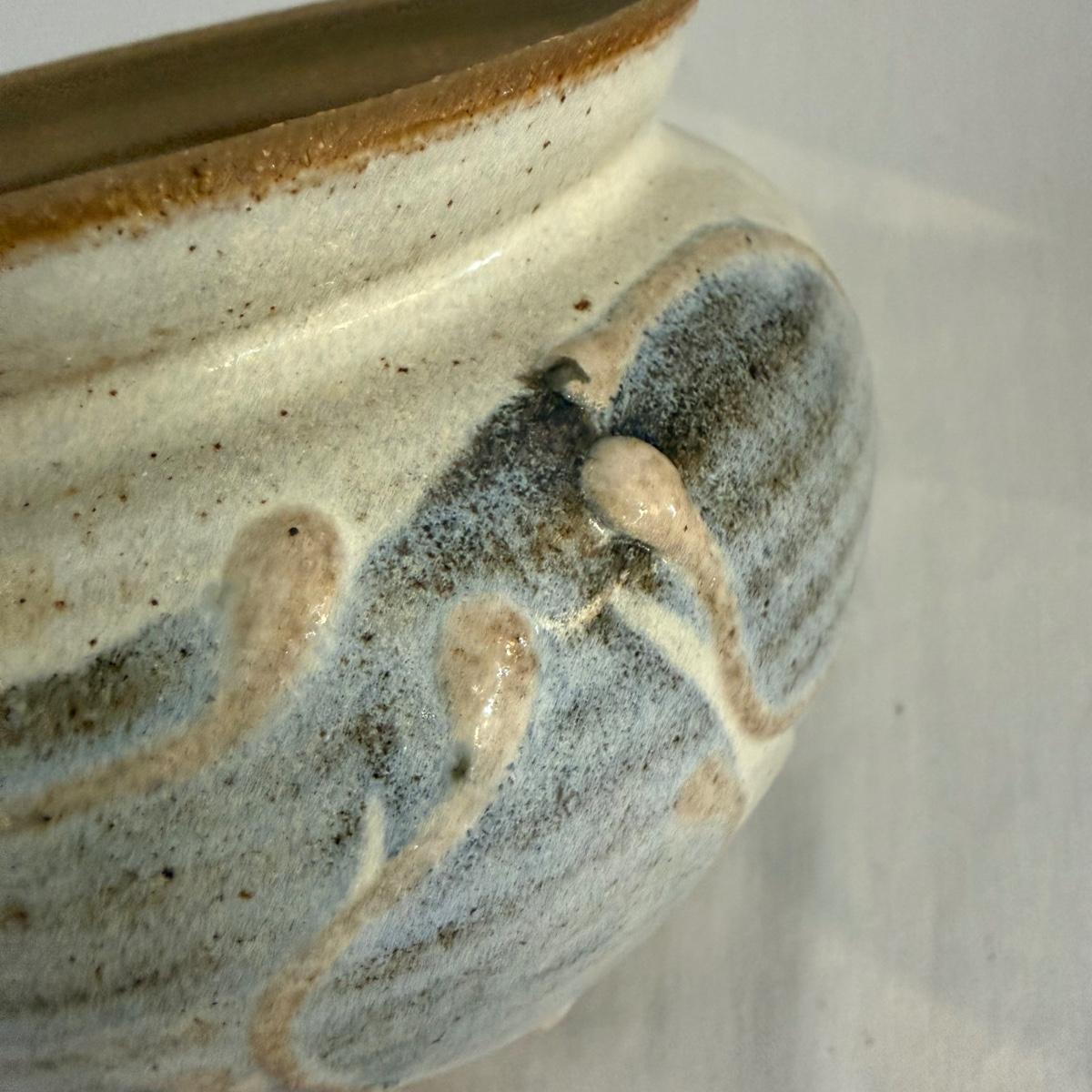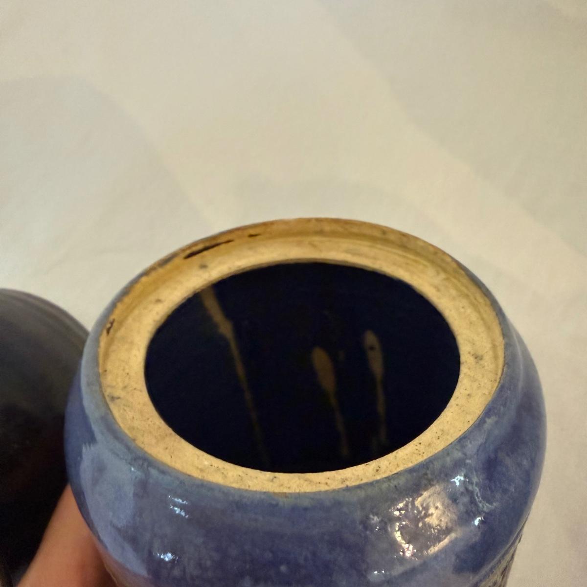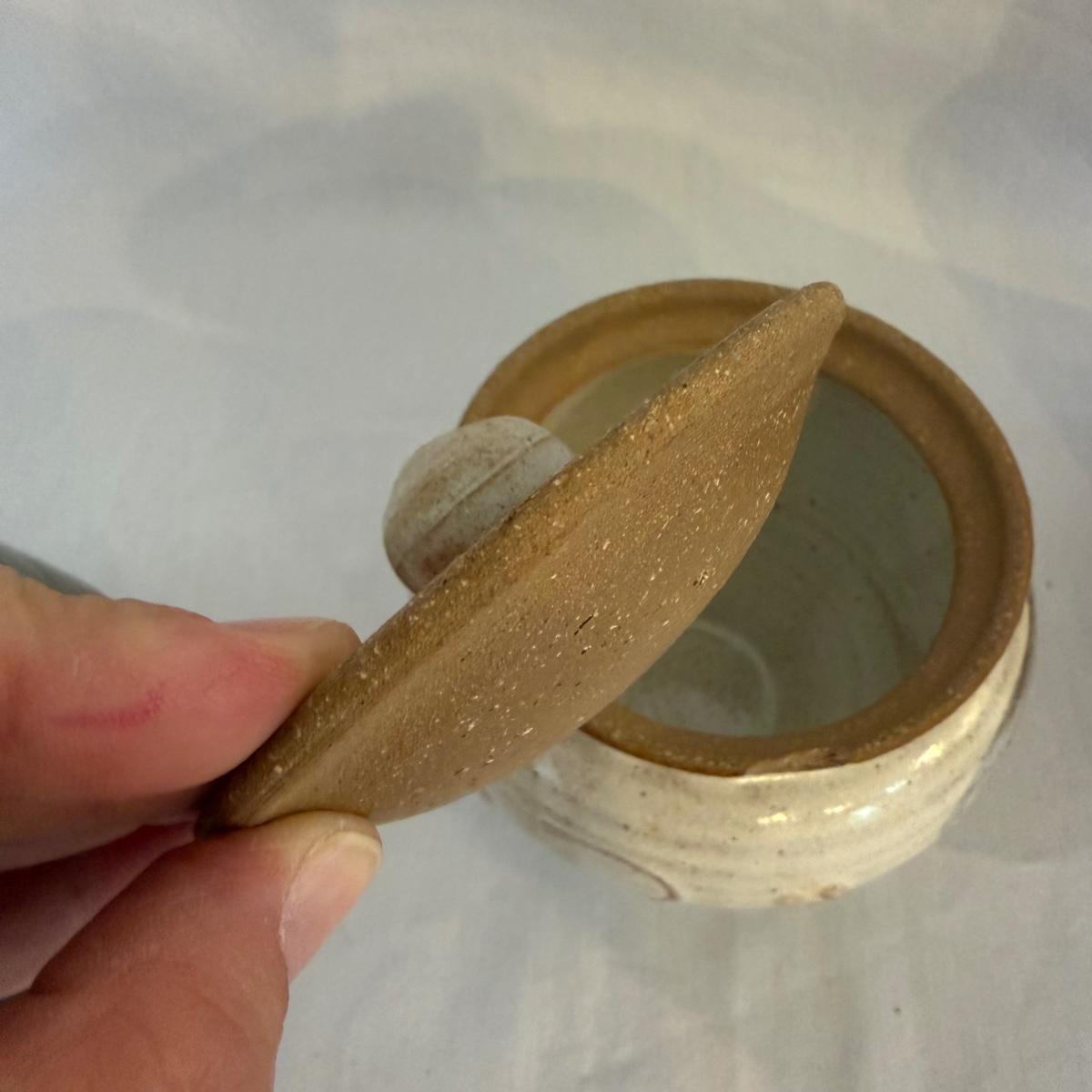 Six unique pottery jars that complement each other well. Two honey/sugar jars, a half-horizontal jar, a textured lidded jar, a standard brown crock and a light colored tall jar. The light colored tall jar appears to once have had a lid. This piece also has a hard-to-decipher stamp on the bottom. The half-horizontal jar, the lidded blue jar and dark honey jar appear to be stamped “Eugene” with dates. The lighter colored honey/sugar jar has a chip on the rim and a makers mark on the lower part near the bottom, see images. The taller brown crock measures 4.75” x 6.75”. See images. Shipping available.
