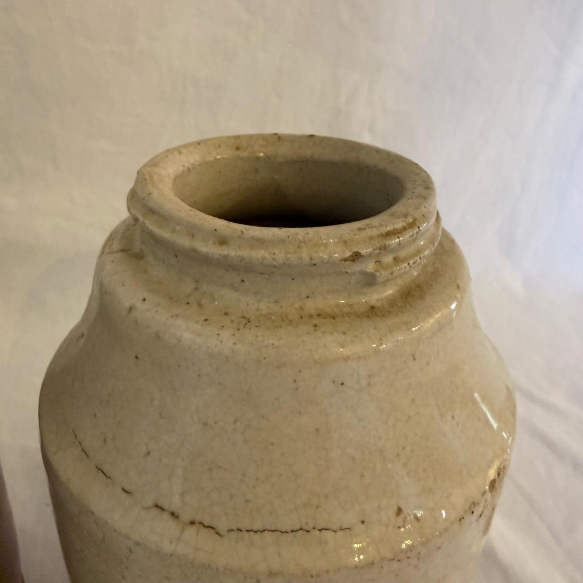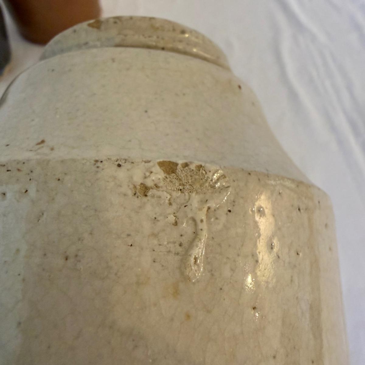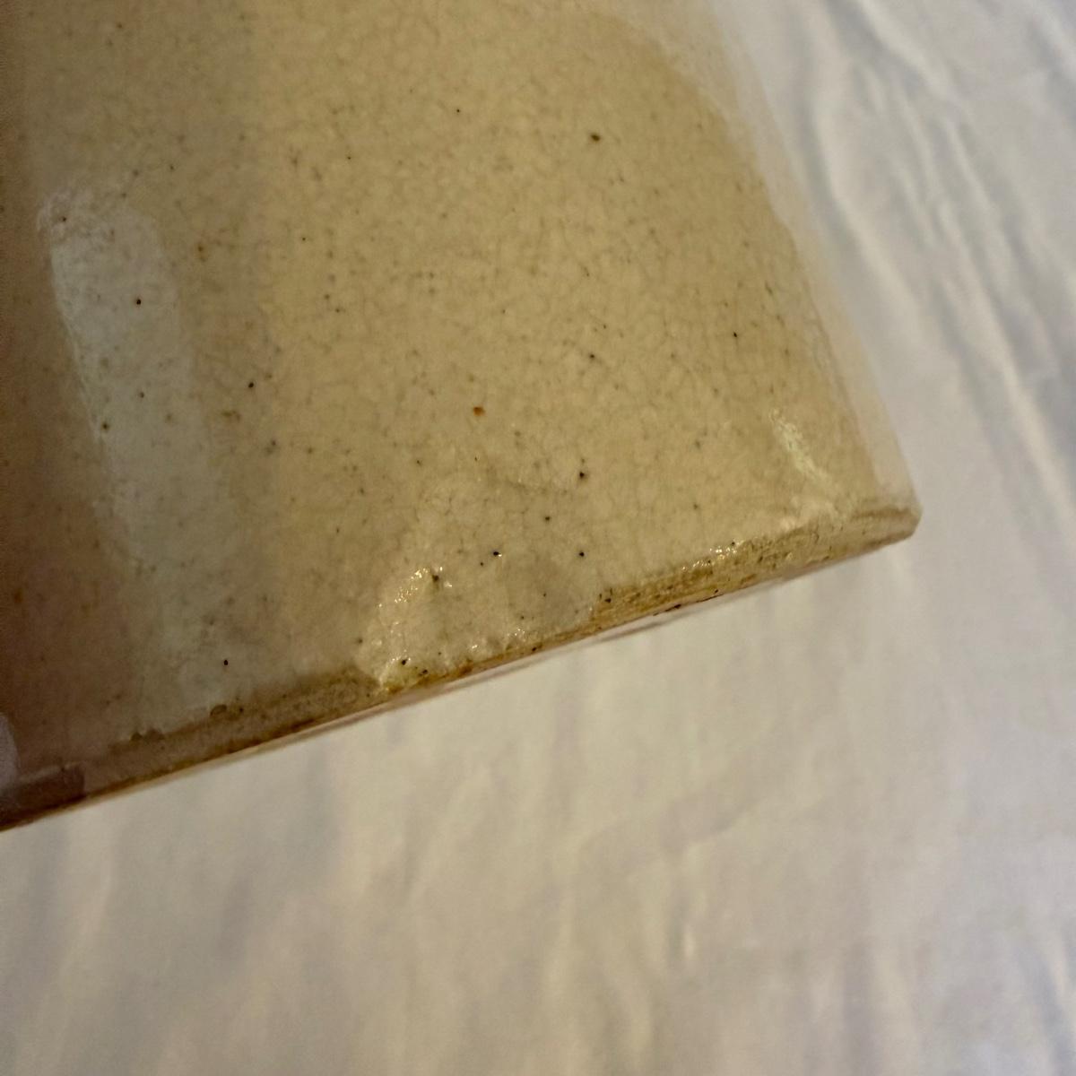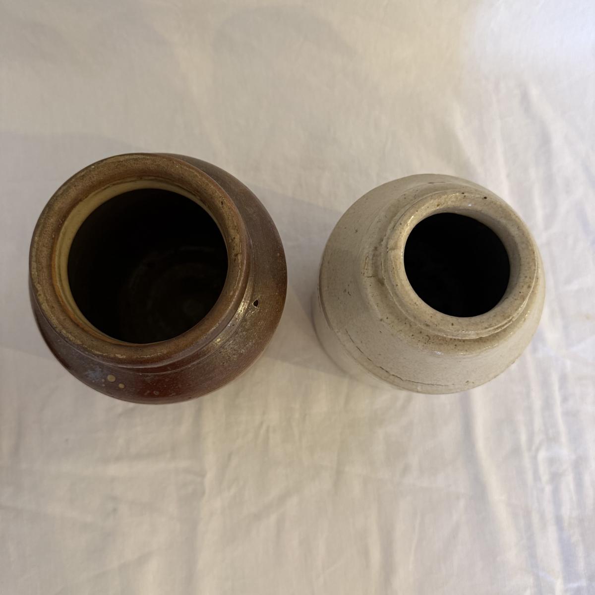 Six unique pottery jars that complement each other well. Two honey/sugar jars, a half-horizontal jar, a textured lidded jar, a standard brown crock and a light colored tall jar. The light colored tall jar appears to once have had a lid. This piece also has a hard-to-decipher stamp on the bottom. The half-horizontal jar, the lidded blue jar and dark honey jar appear to be stamped “Eugene” with dates. The lighter colored honey/sugar jar has a chip on the rim and a makers mark on the lower part near the bottom, see images. The taller brown crock measures 4.75” x 6.75”. See images. Shipping available.