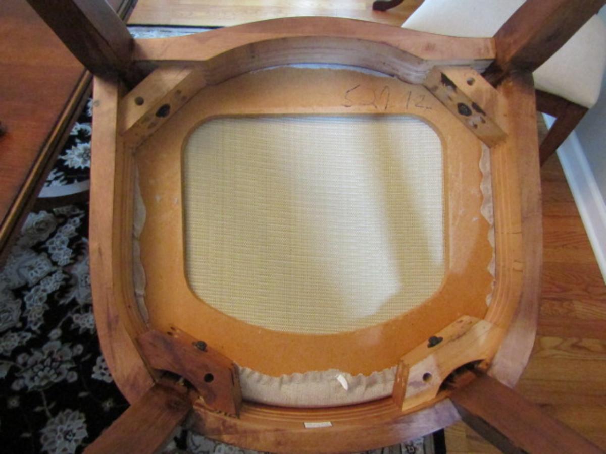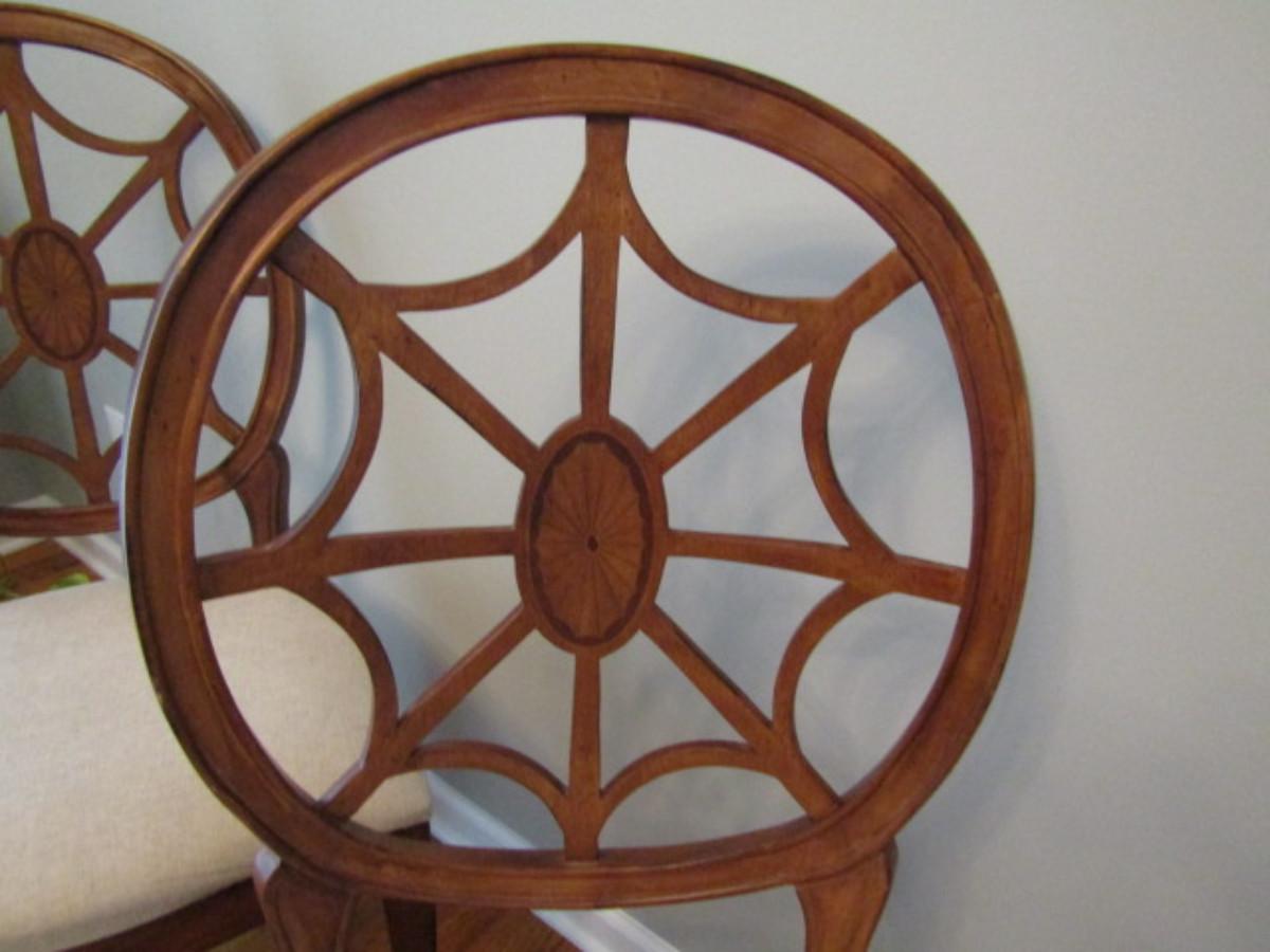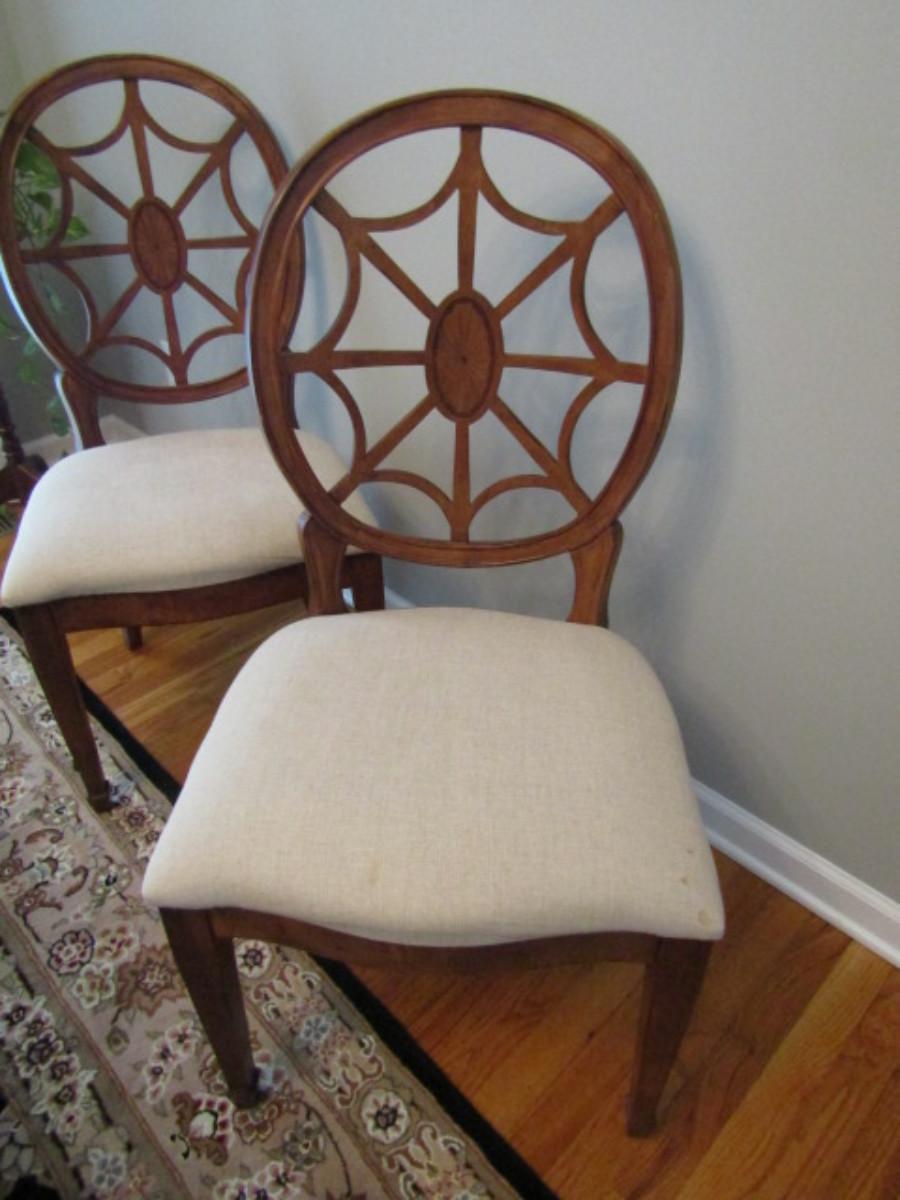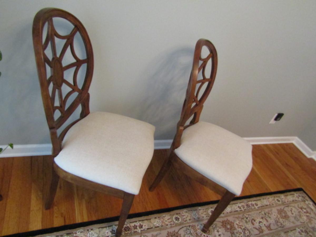 Six Spider Web Back Chairs. Please see all pictures- some small staining on upholstery, delamination on a couple of chairs.