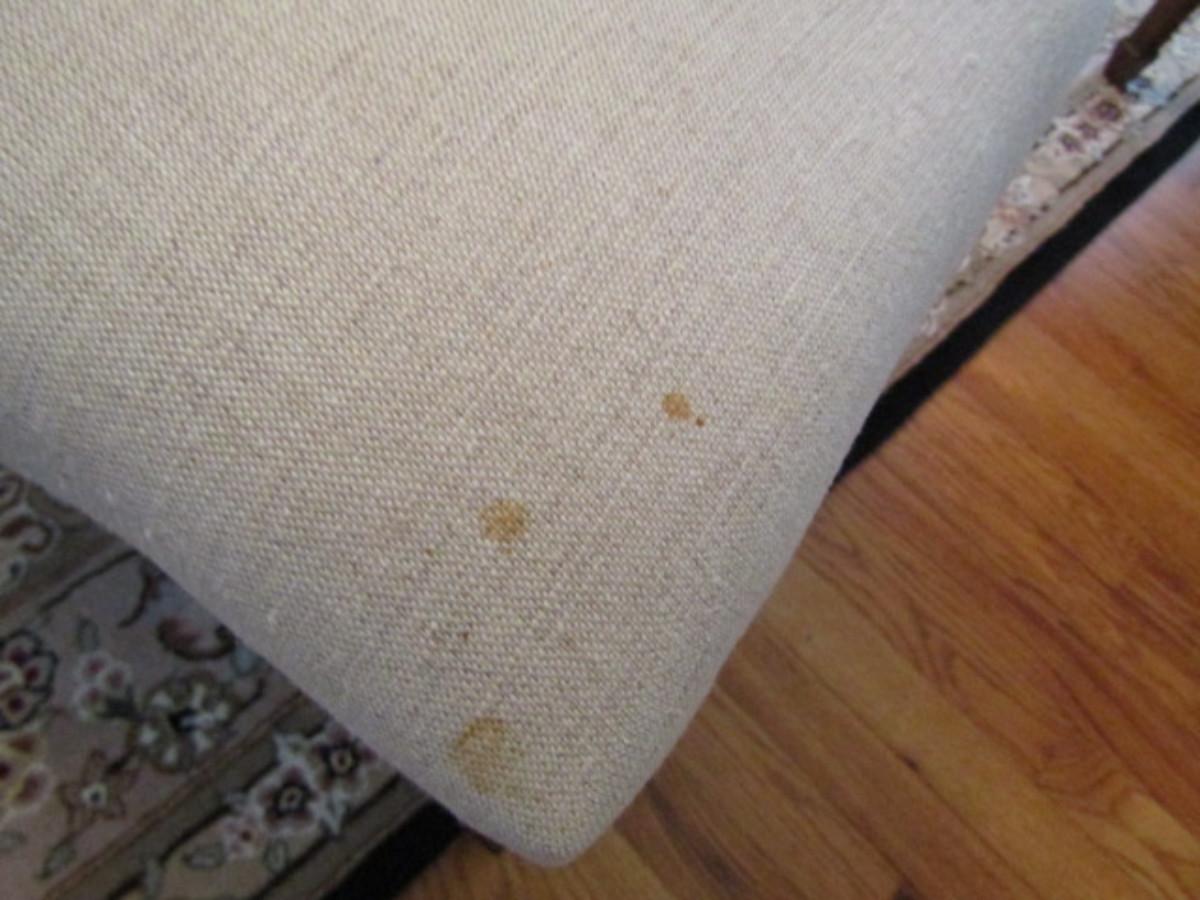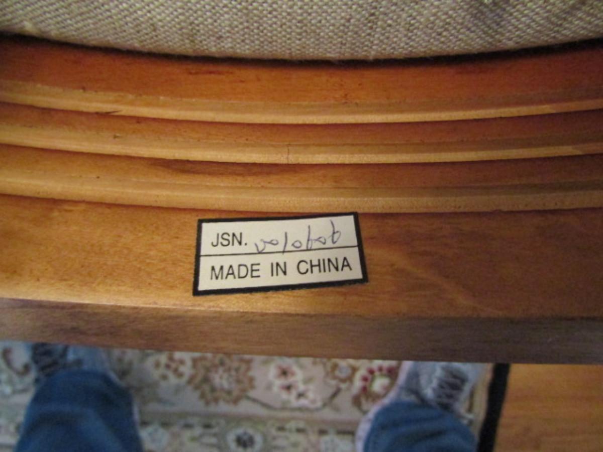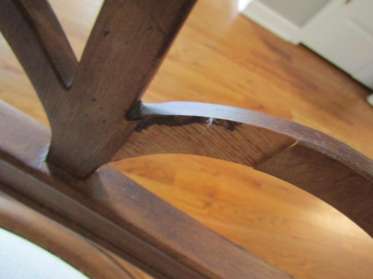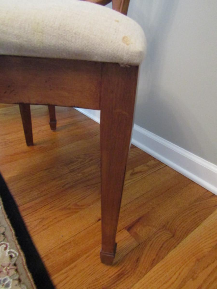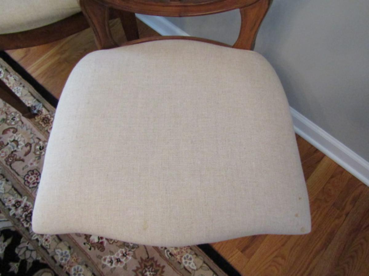 Six Spider Web Back Chairs. Please see all pictures- some small staining on upholstery, delamination on a couple of chairs.