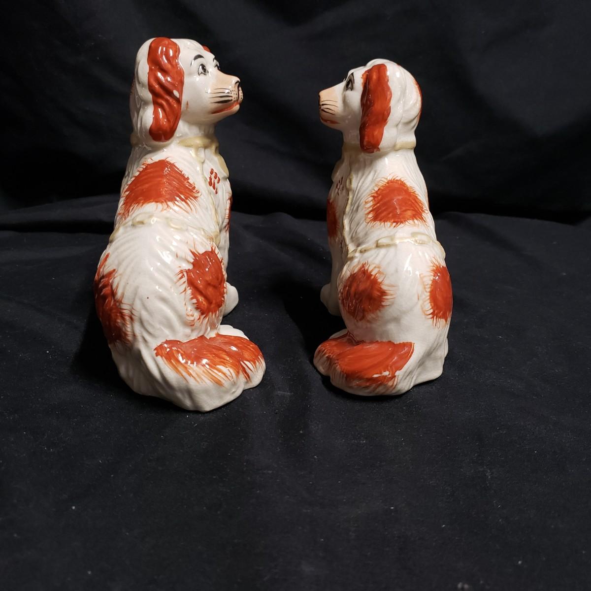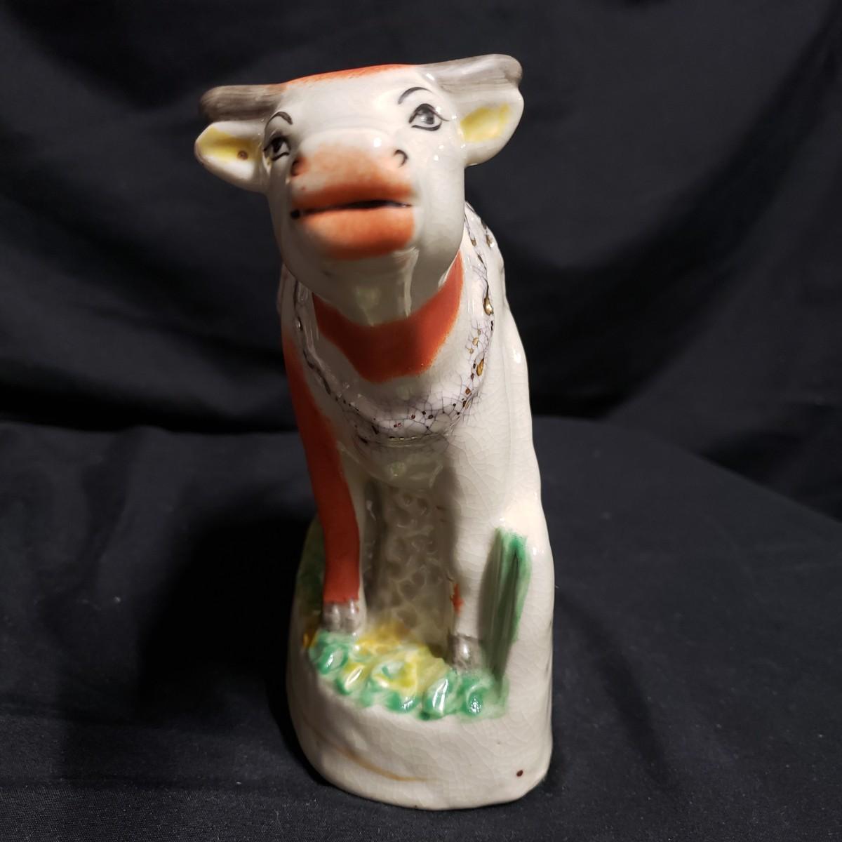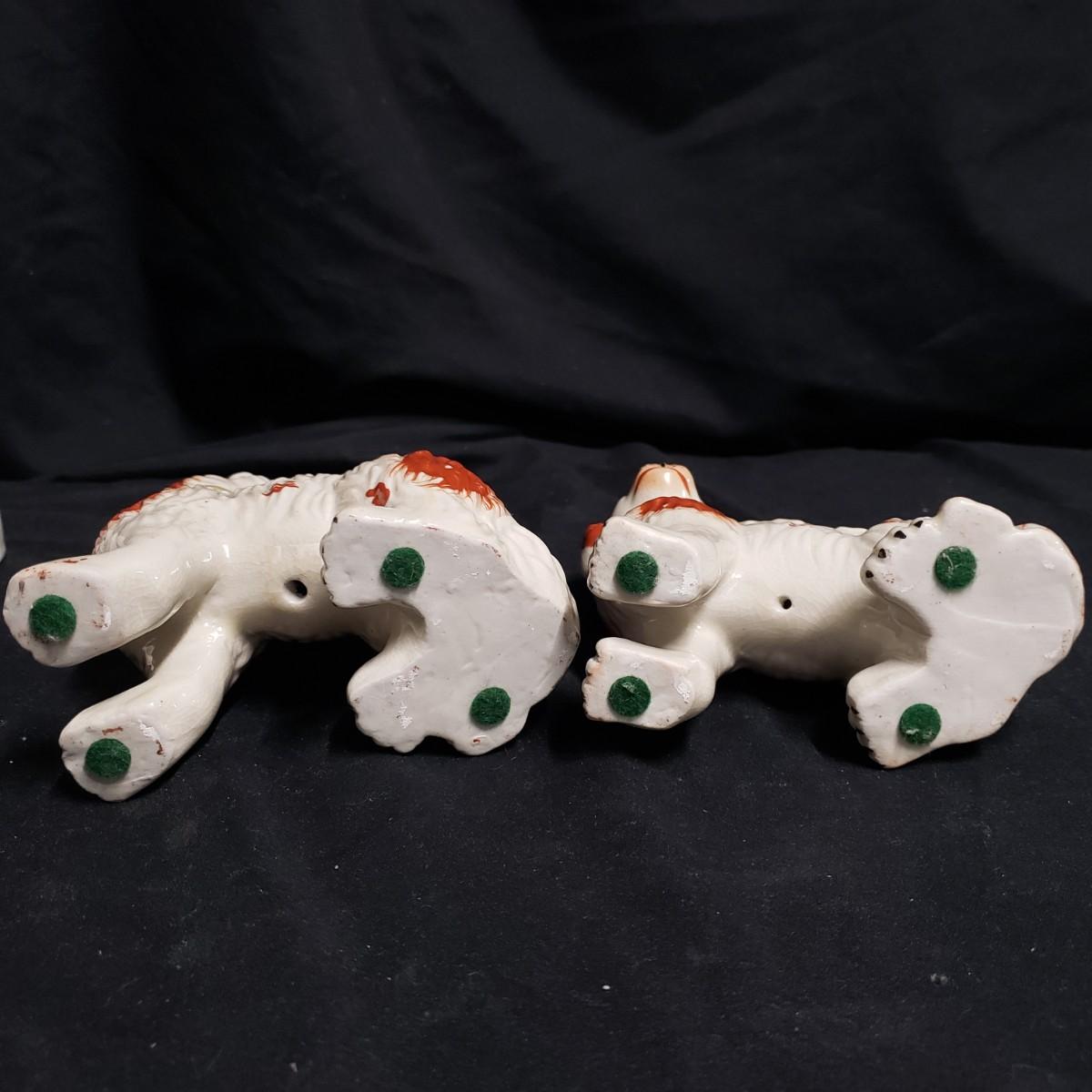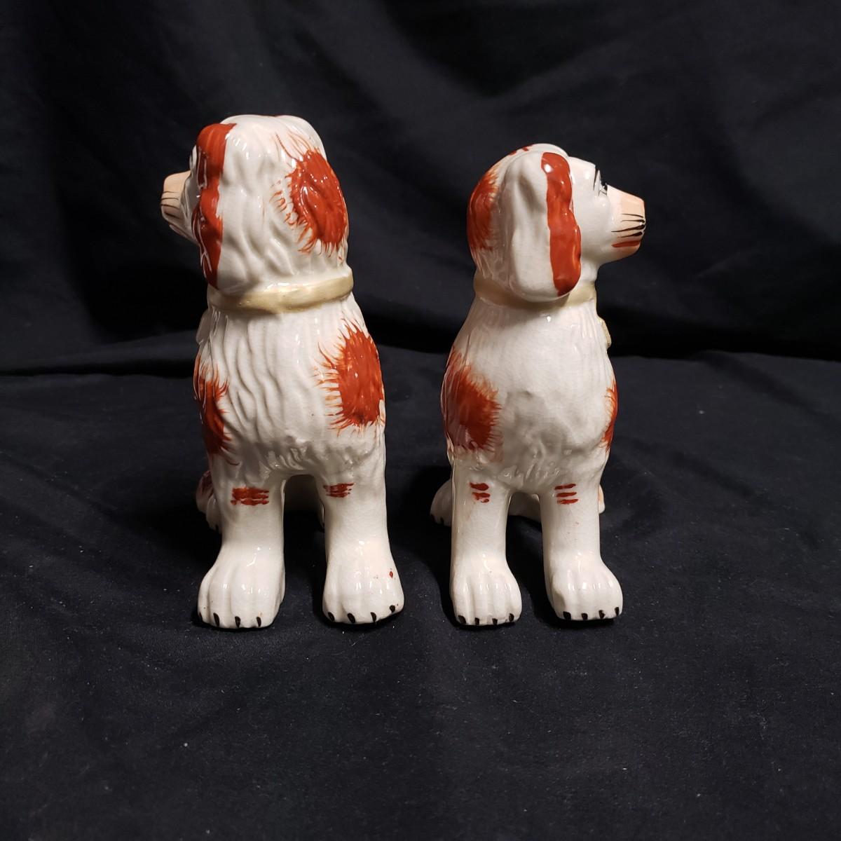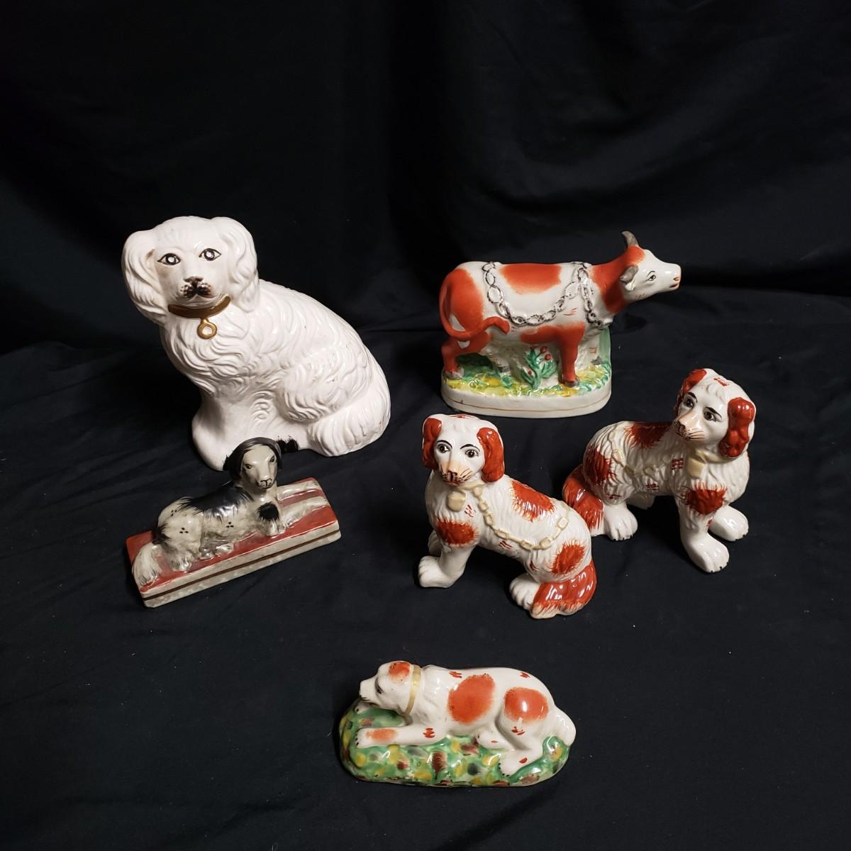 These six, possibly Staffordshire animal figurines were made for your mantle! The happy bull steer measures approximately 6" x 2" x 6"H. There are a pair of matching Spaniels, a larger black and white Terrier, a sitting Terrier and a brown and white dog laying down. There appears to be no markings on these figurines.