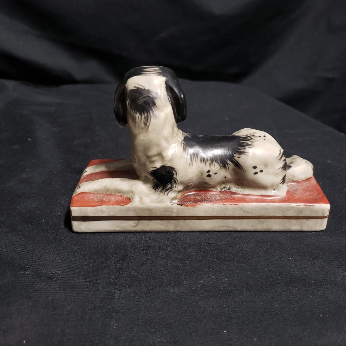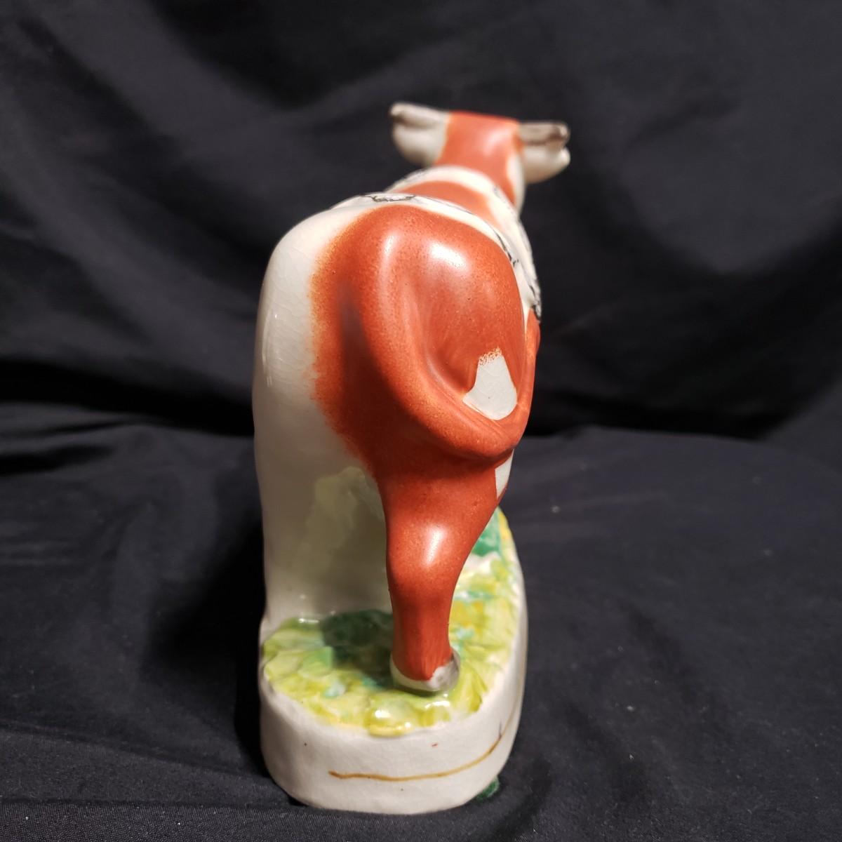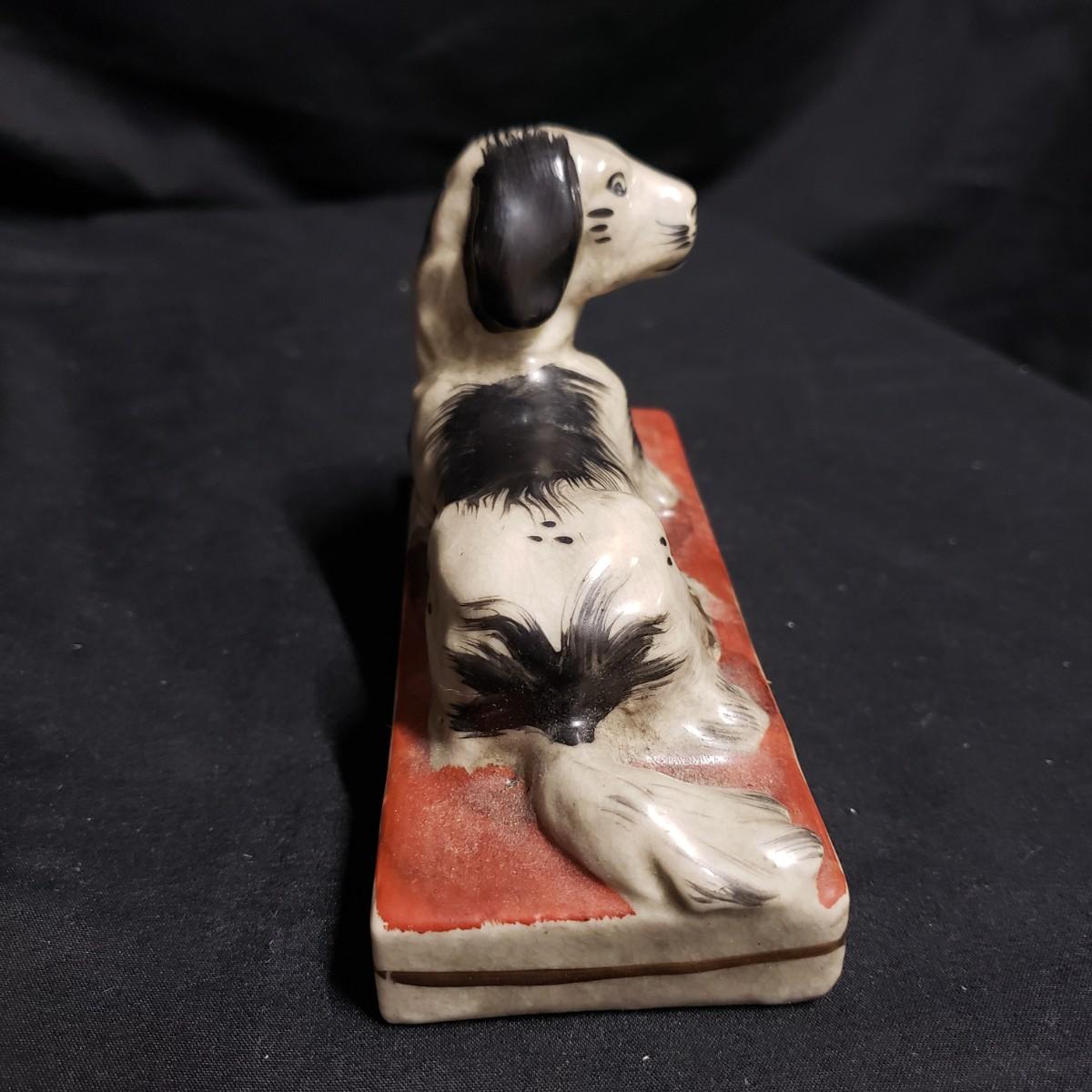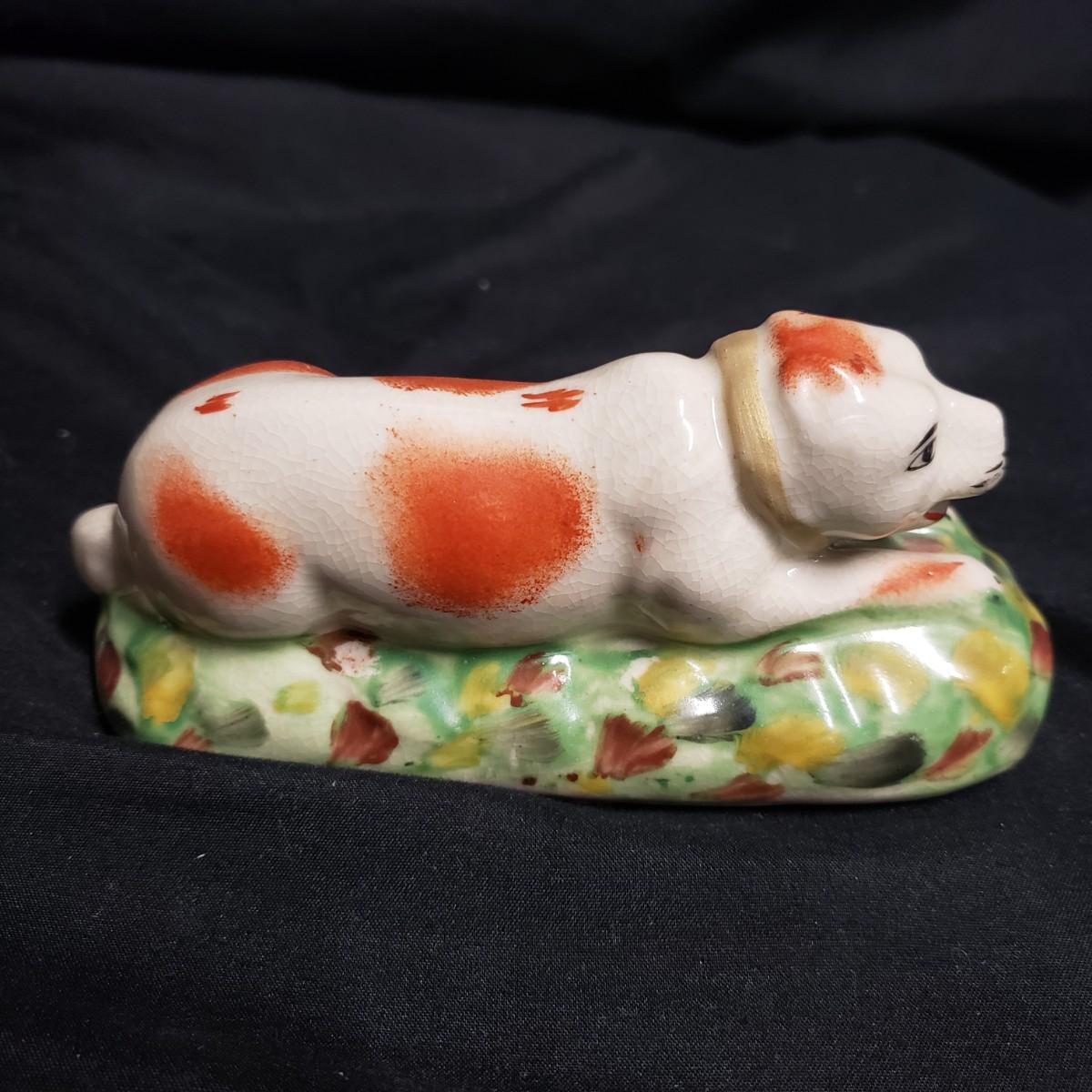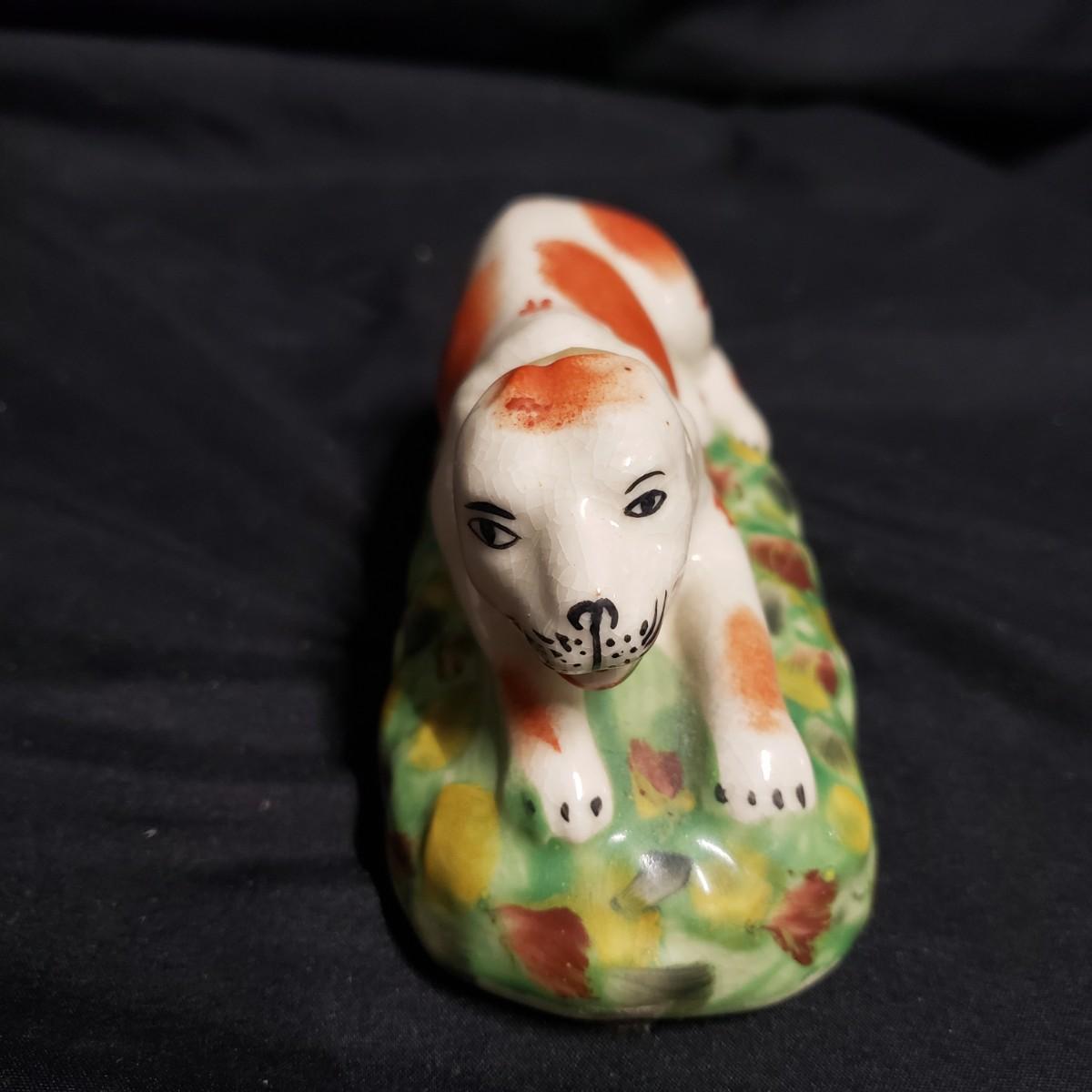 These six, possibly Staffordshire animal figurines were made for your mantle! The happy bull steer measures approximately 6" x 2" x 6"H. There are a pair of matching Spaniels, a larger black and white Terrier, a sitting Terrier and a brown and white dog laying down. There appears to be no markings on these figurines.