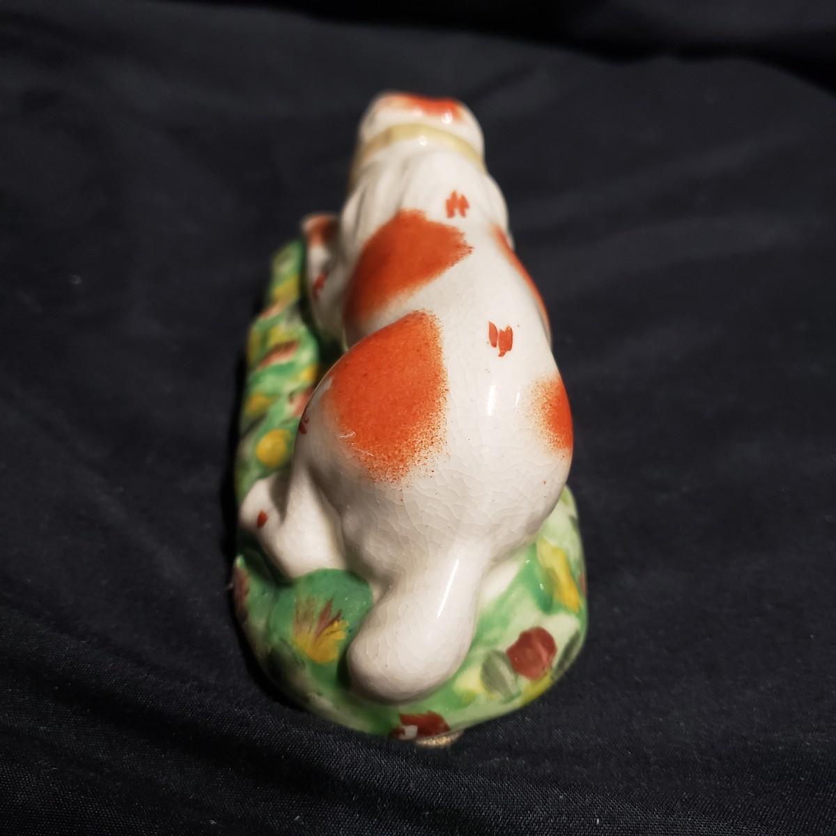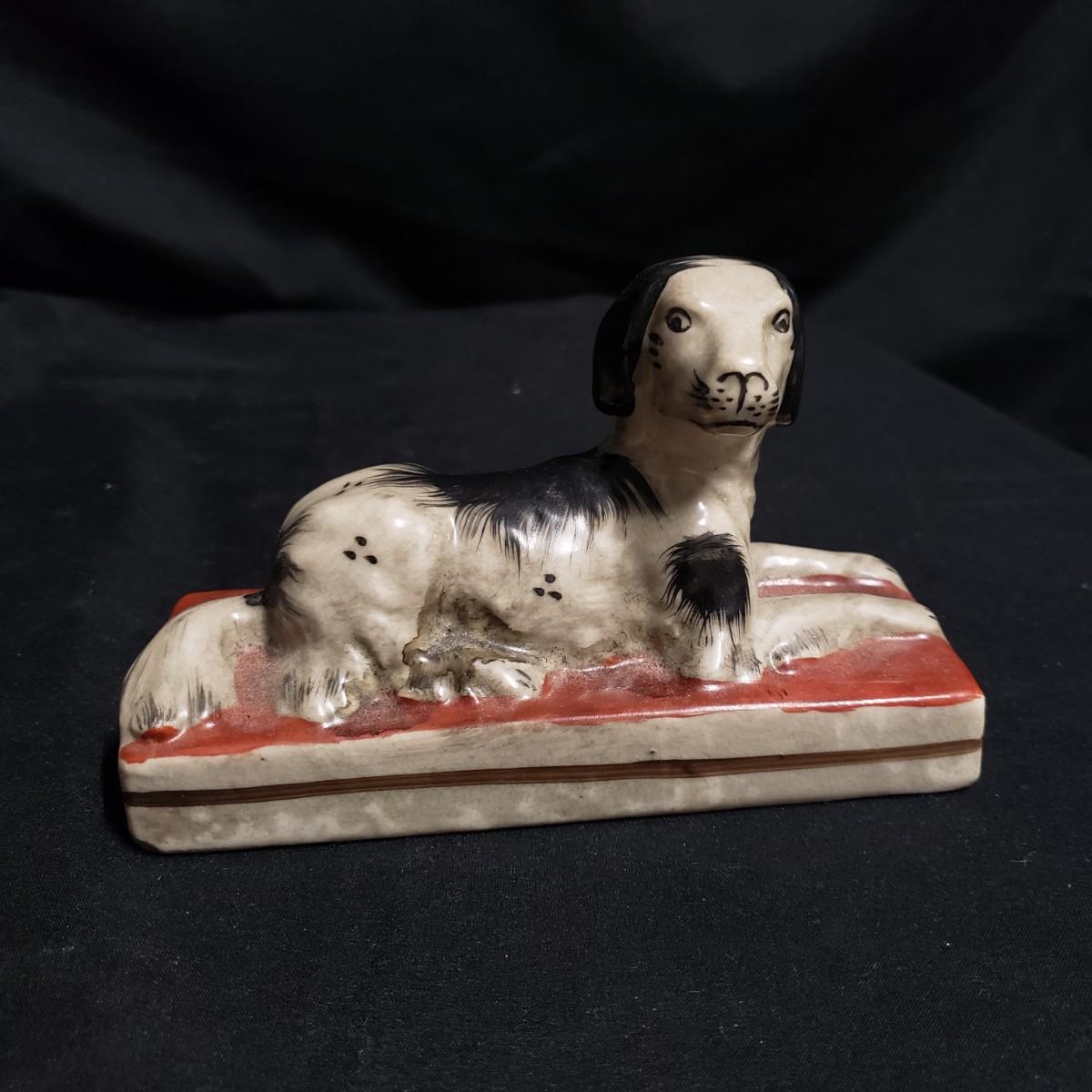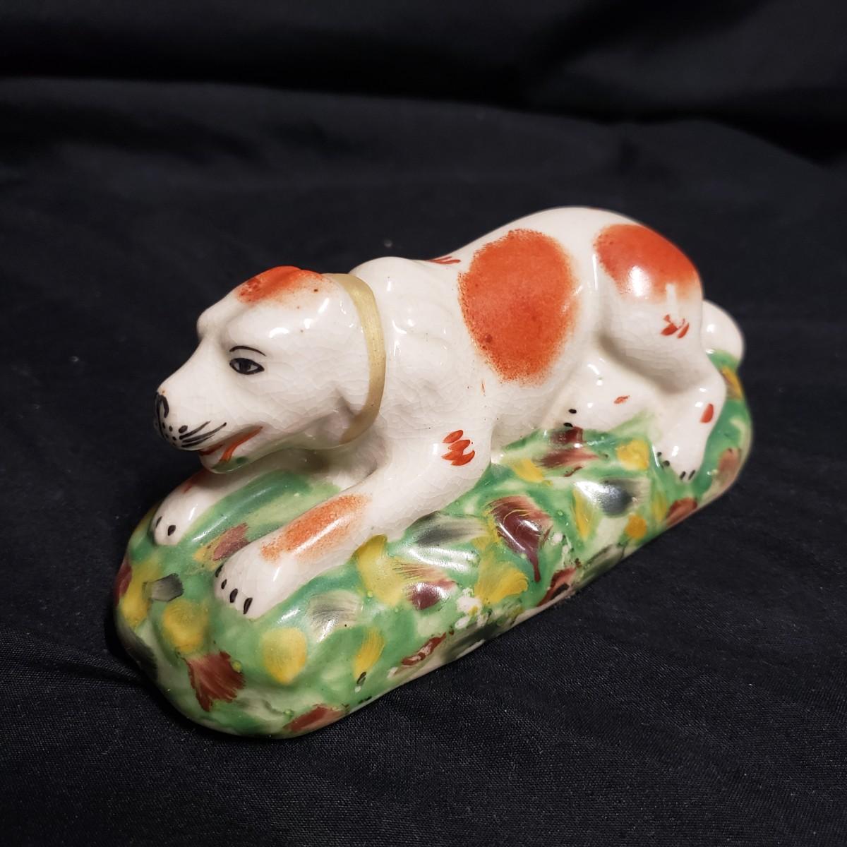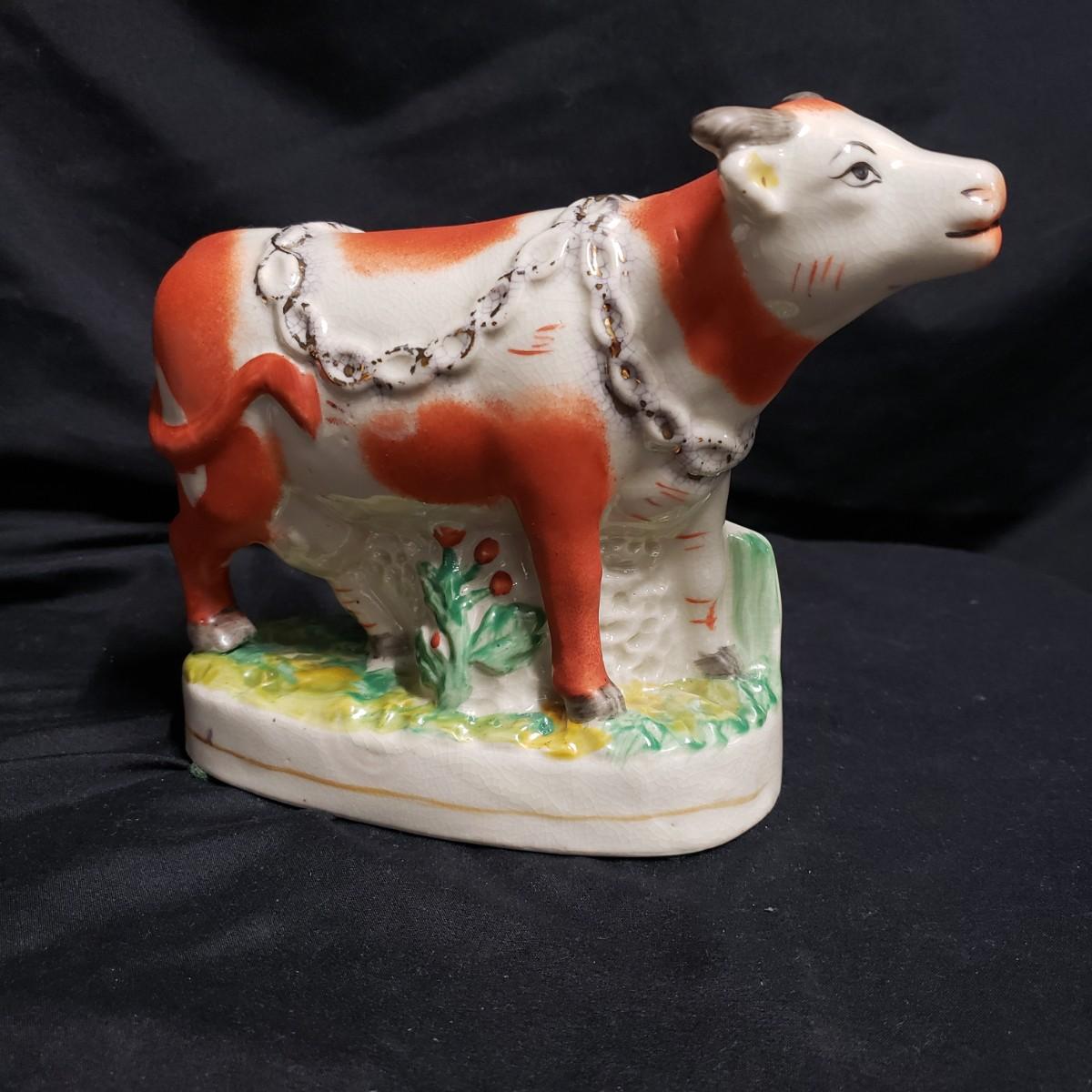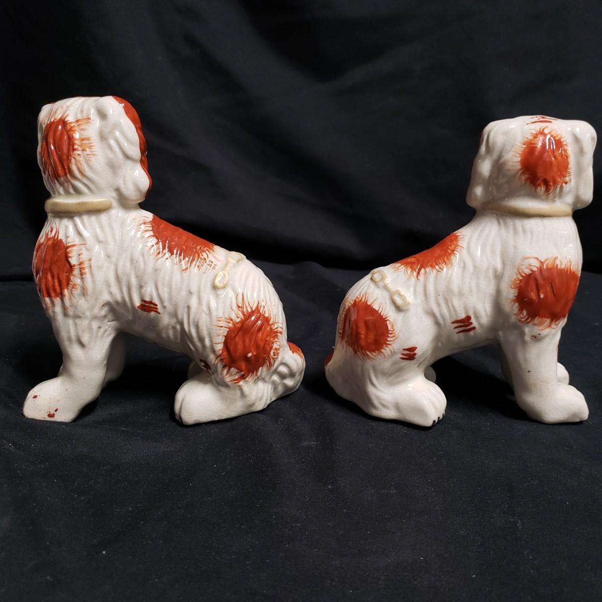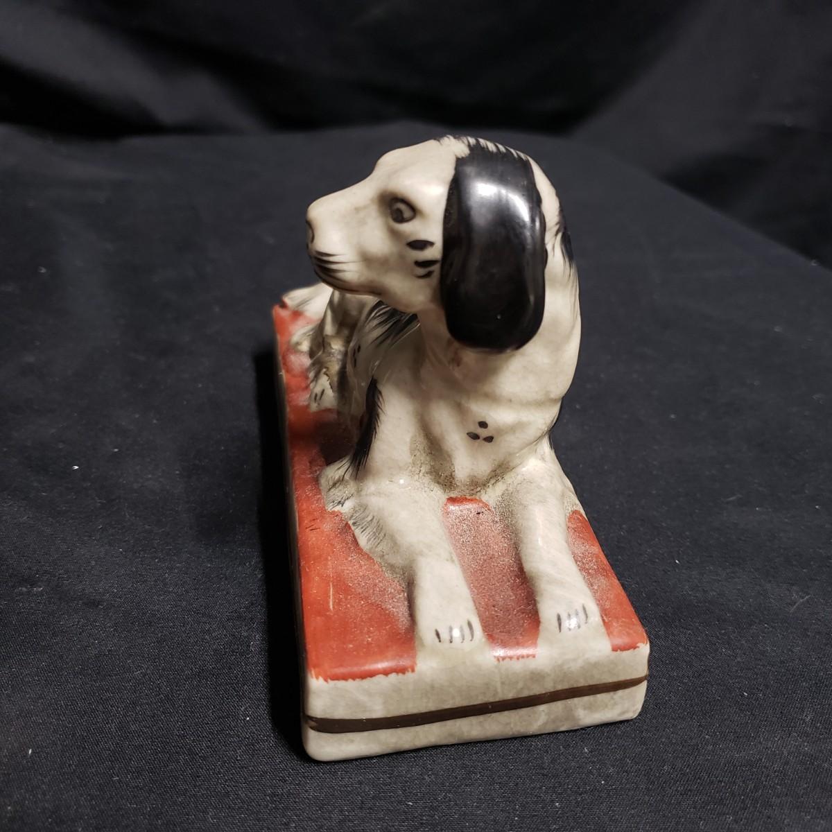 These six, possibly Staffordshire animal figurines were made for your mantle! The happy bull steer measures approximately 6" x 2" x 6"H. There are a pair of matching Spaniels, a larger black and white Terrier, a sitting Terrier and a brown and white dog laying down. There appears to be no markings on these figurines.
