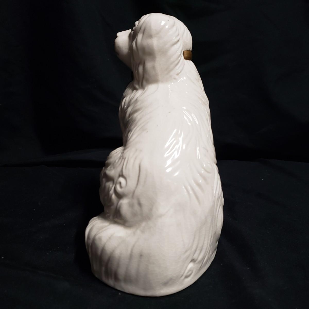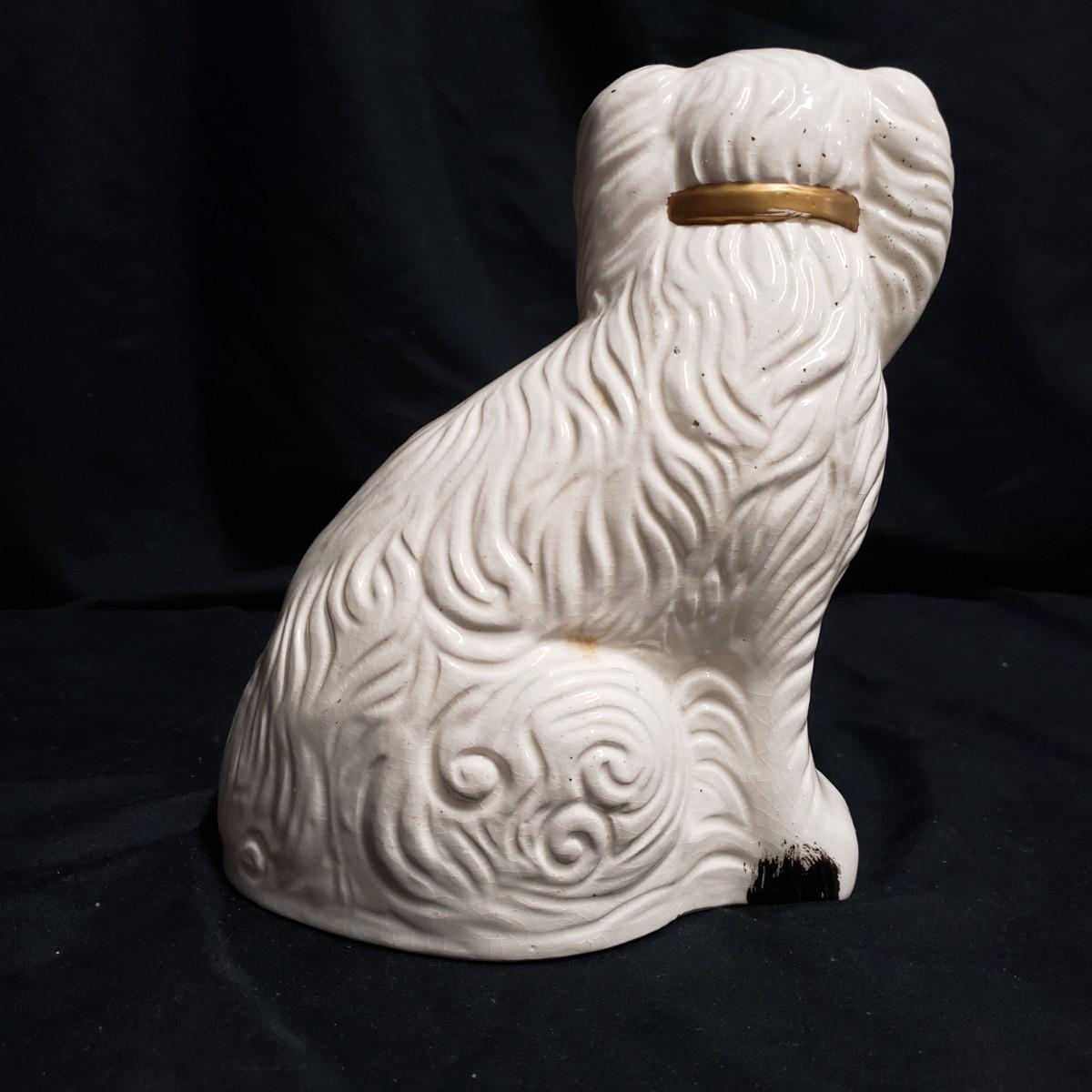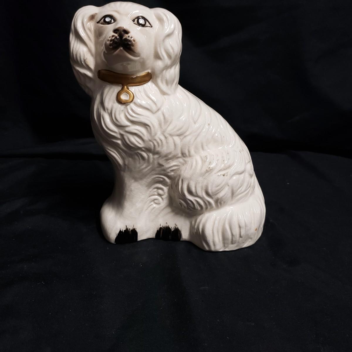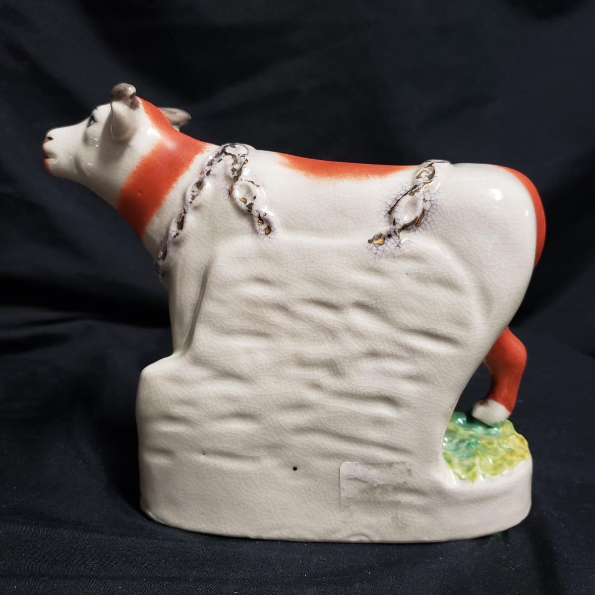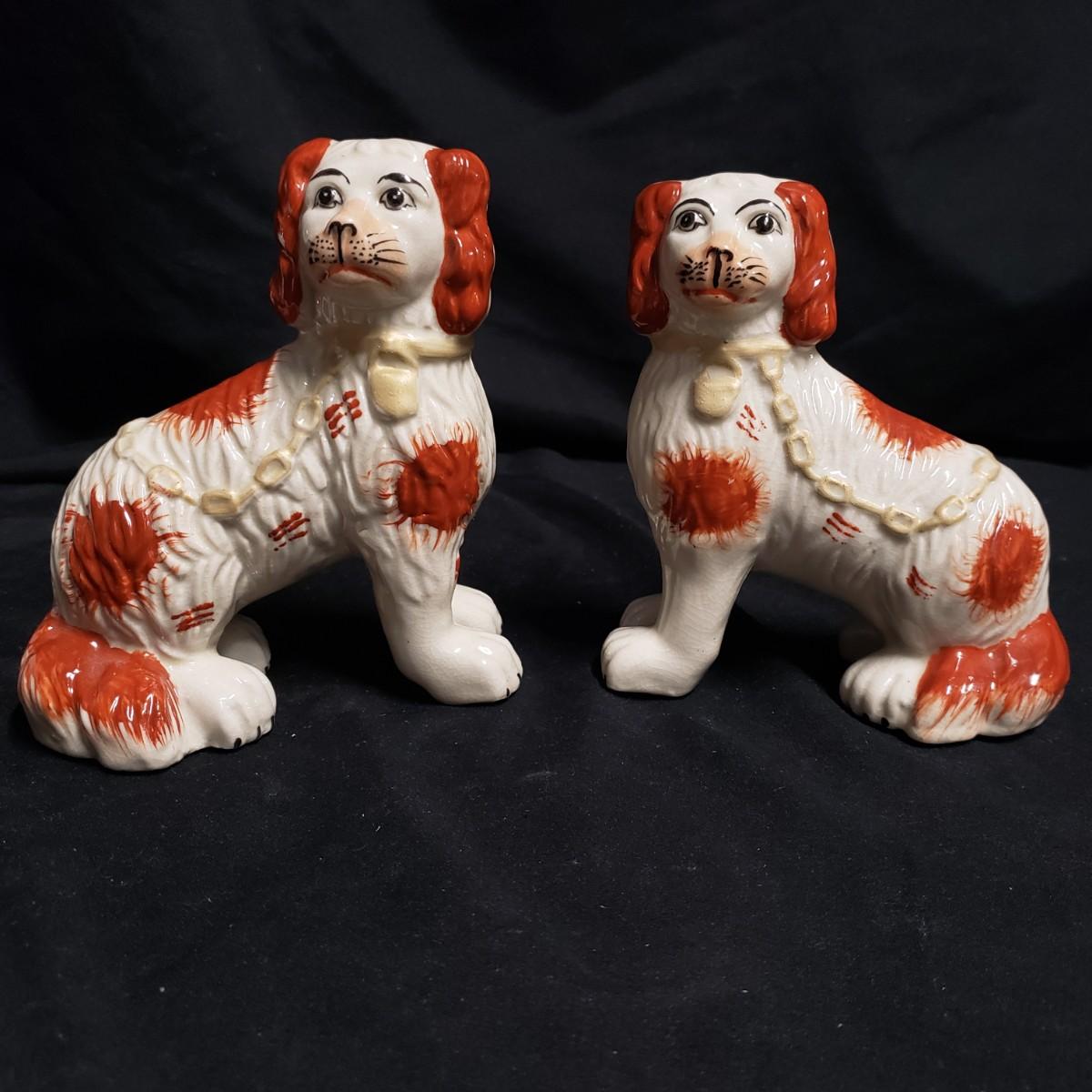 These six, possibly Staffordshire animal figurines were made for your mantle! The happy bull steer measures approximately 6" x 2" x 6"H. There are a pair of matching Spaniels, a larger black and white Terrier, a sitting Terrier and a brown and white dog laying down. There appears to be no markings on these figurines.