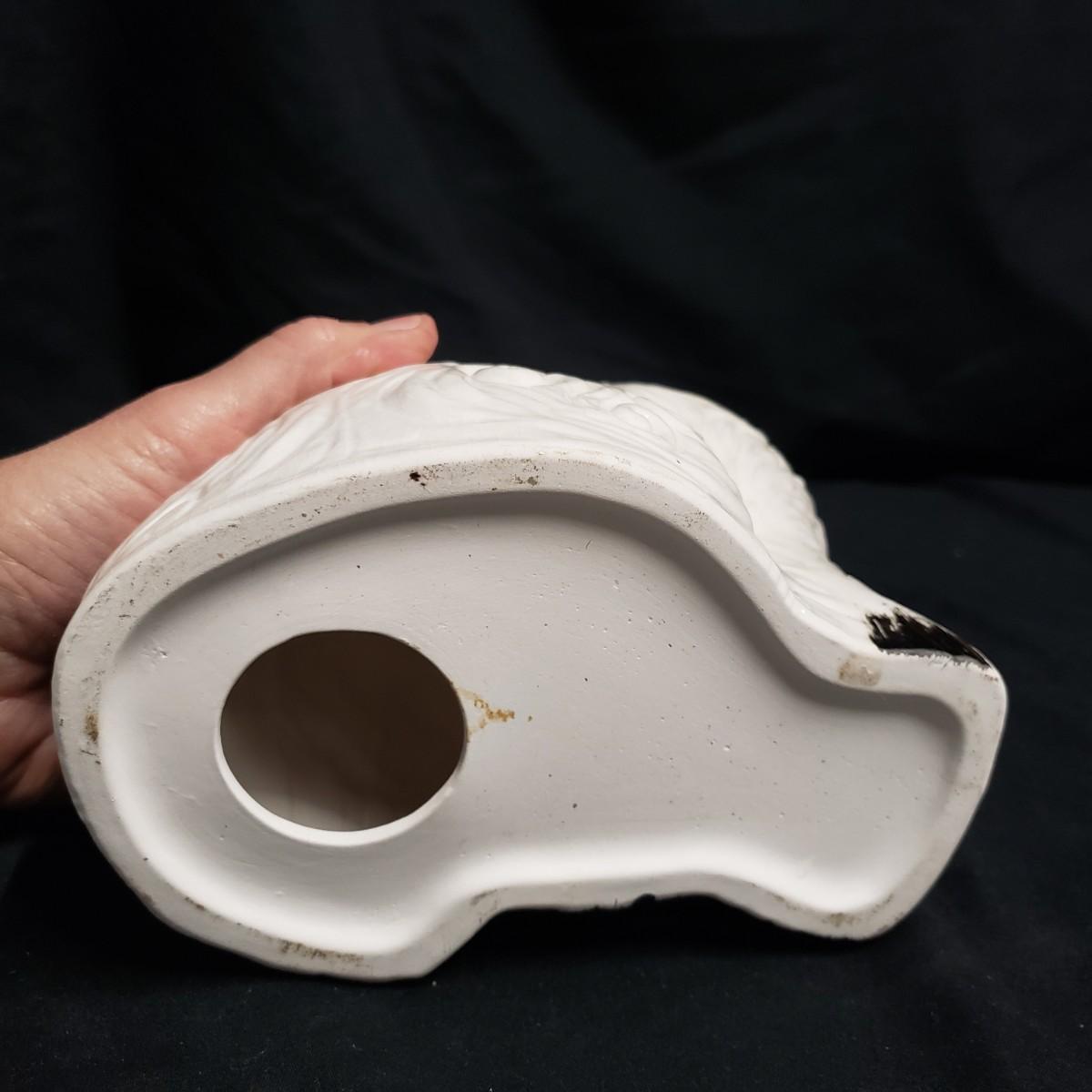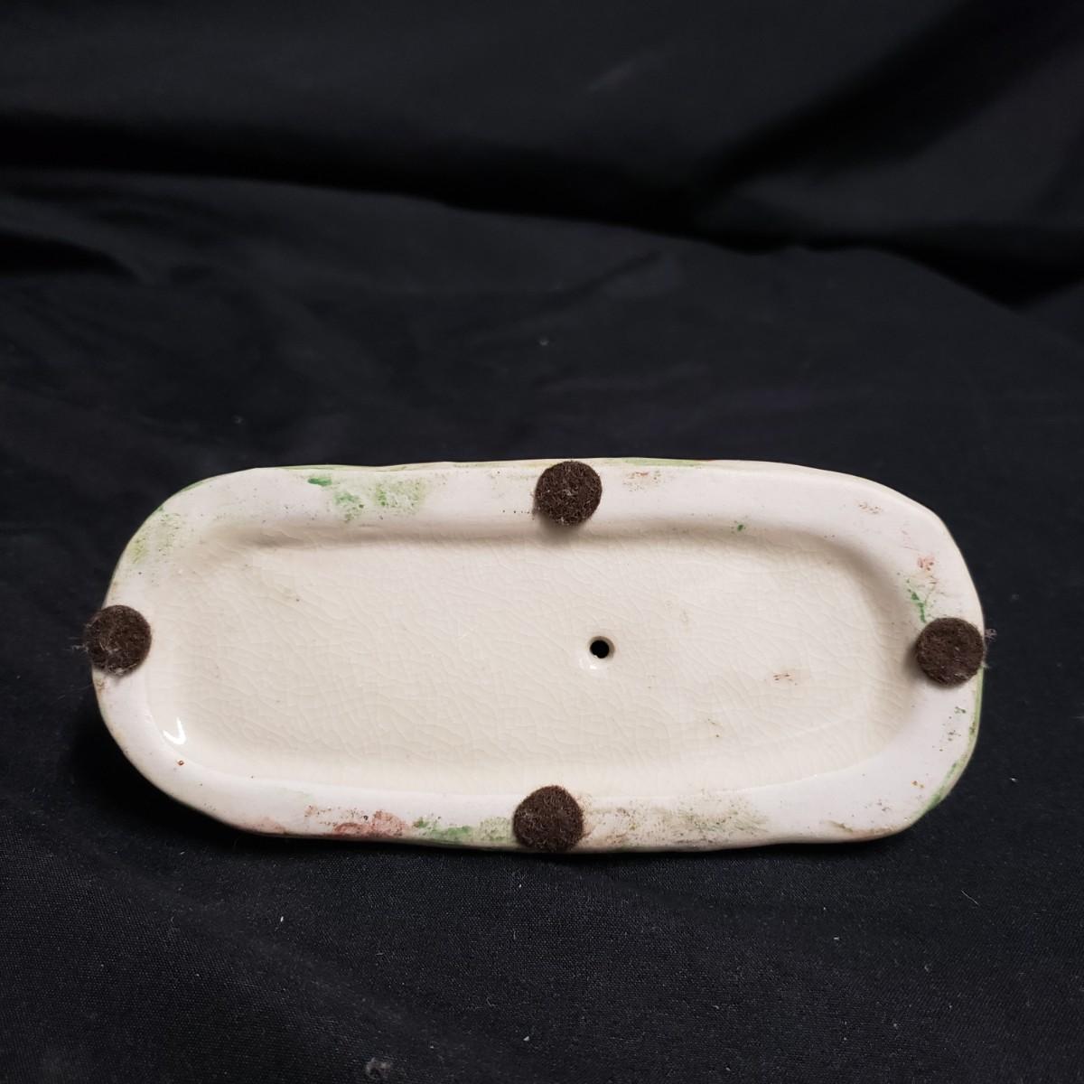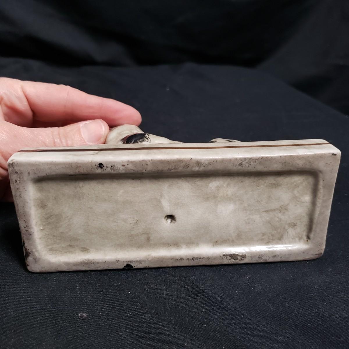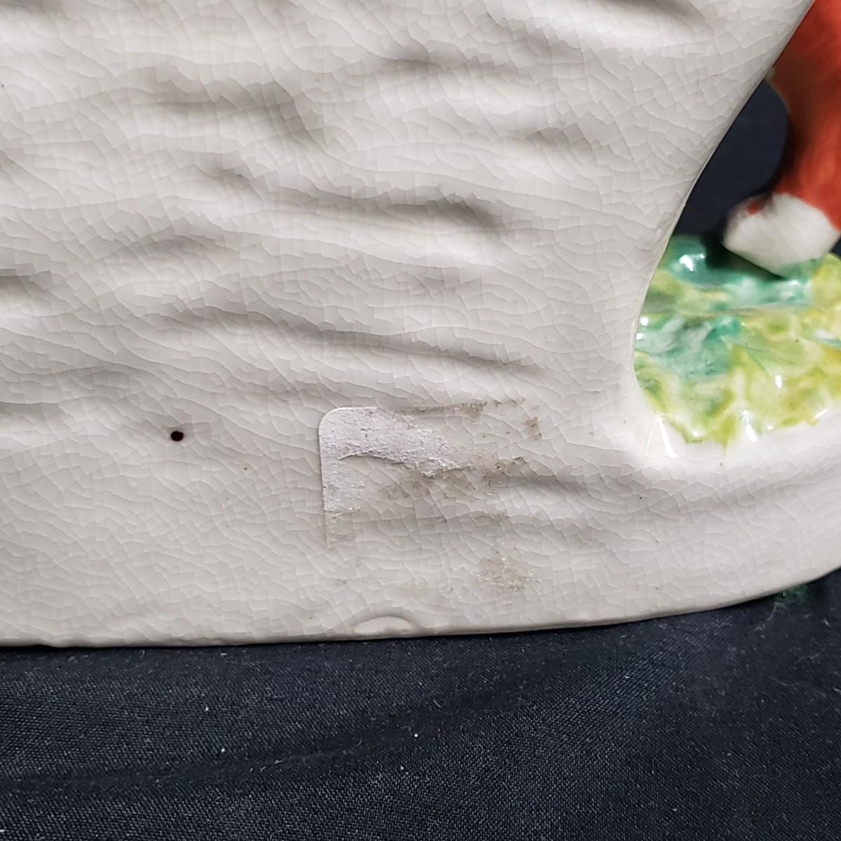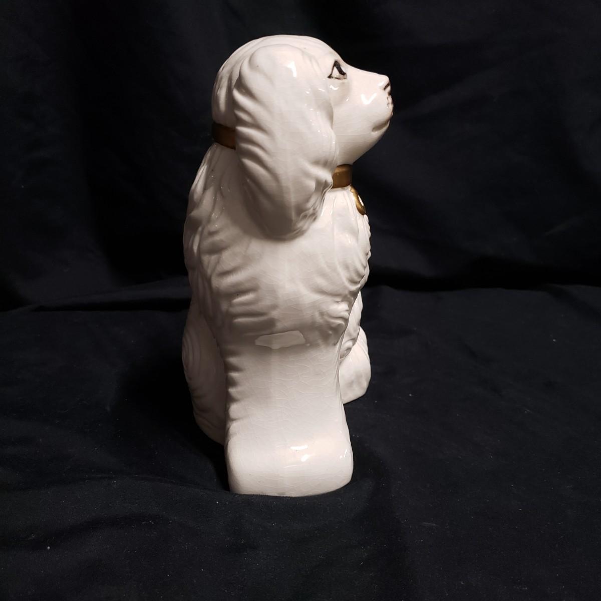 These six, possibly Staffordshire animal figurines were made for your mantle! The happy bull steer measures approximately 6" x 2" x 6"H. There are a pair of matching Spaniels, a larger black and white Terrier, a sitting Terrier and a brown and white dog laying down. There appears to be no markings on these figurines.