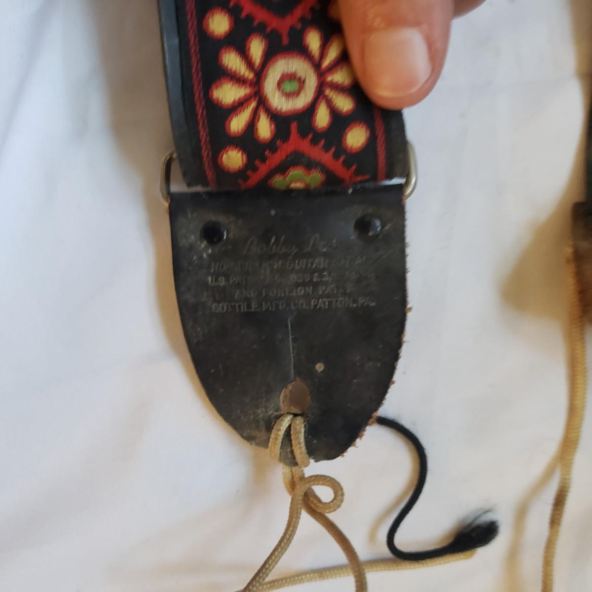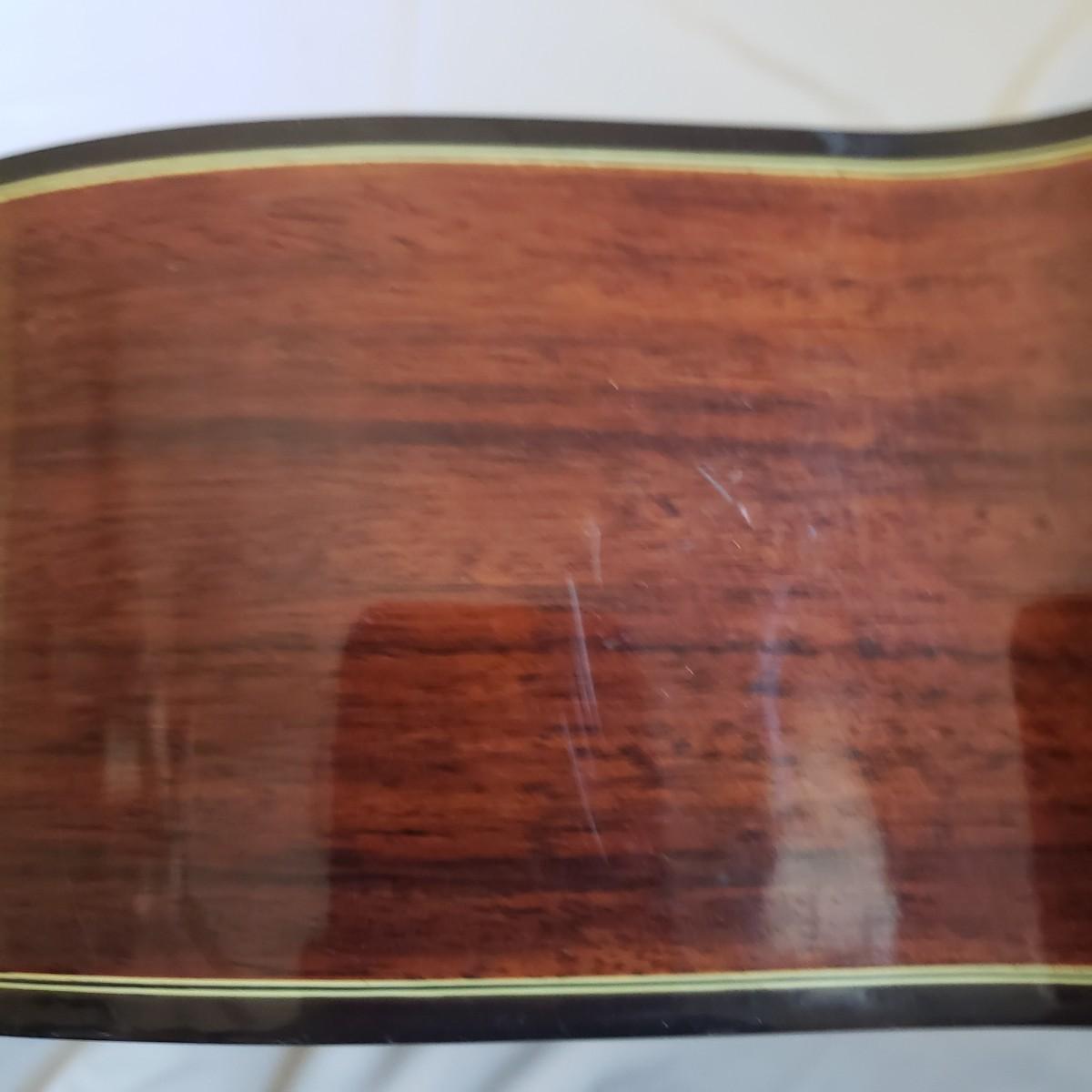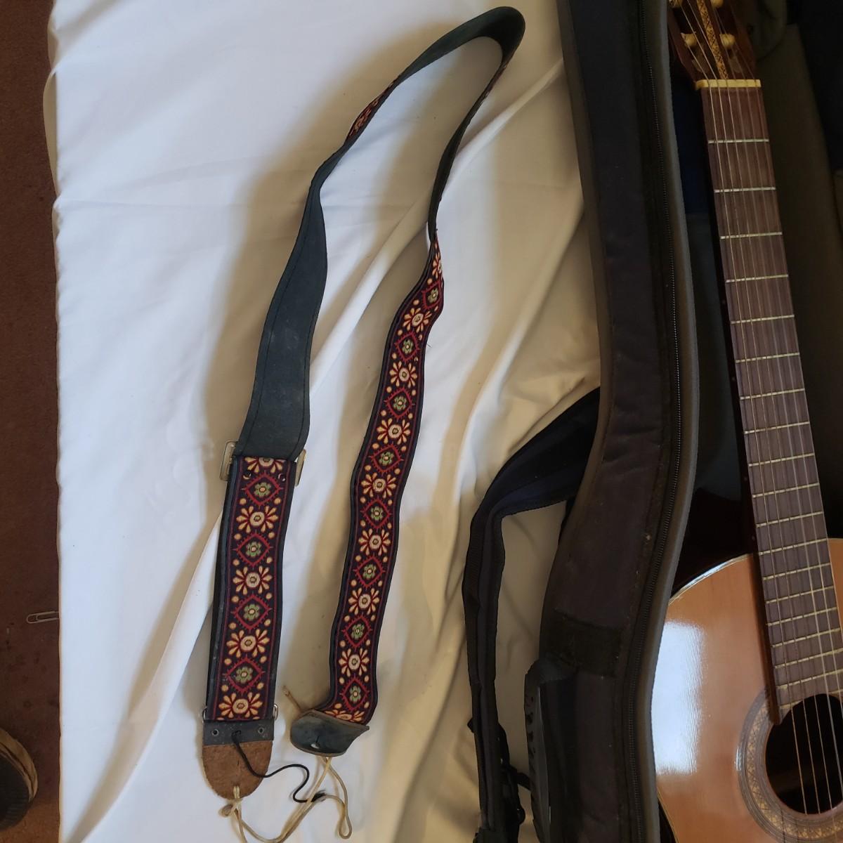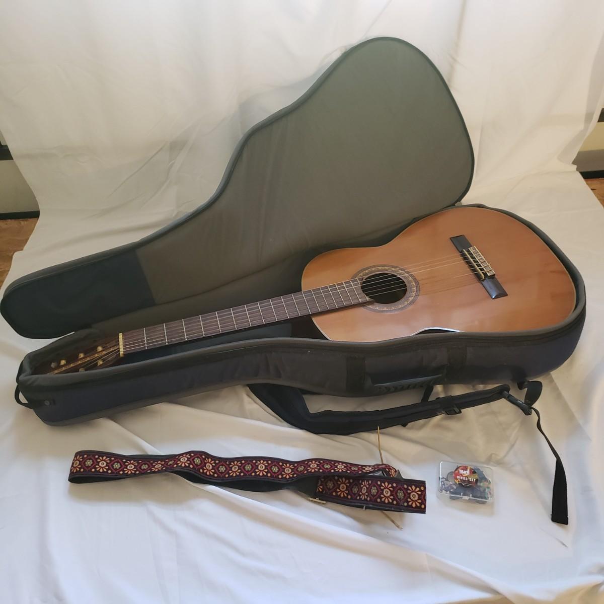 This lot features a Made in Japan six string guitar, a Boulder-Alpine Series soft guitar case, a Bobby Lee guitar strap and a case of various picks. The guitar measures approximately 15" x 4" x 40"H. There are some minor wears on the finish and the strap peg is missing. The case is Boulder brand, Alpine Series and measures 16" x 6" x 42"H. This soft case has three pockets in the front and backpack straps.