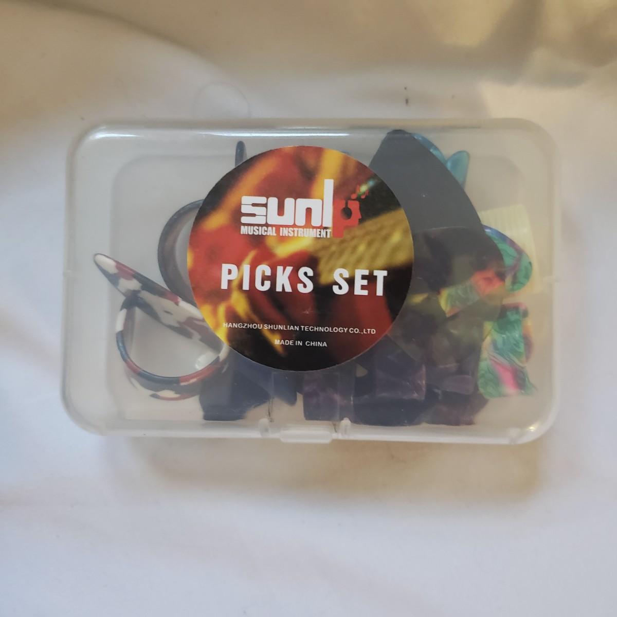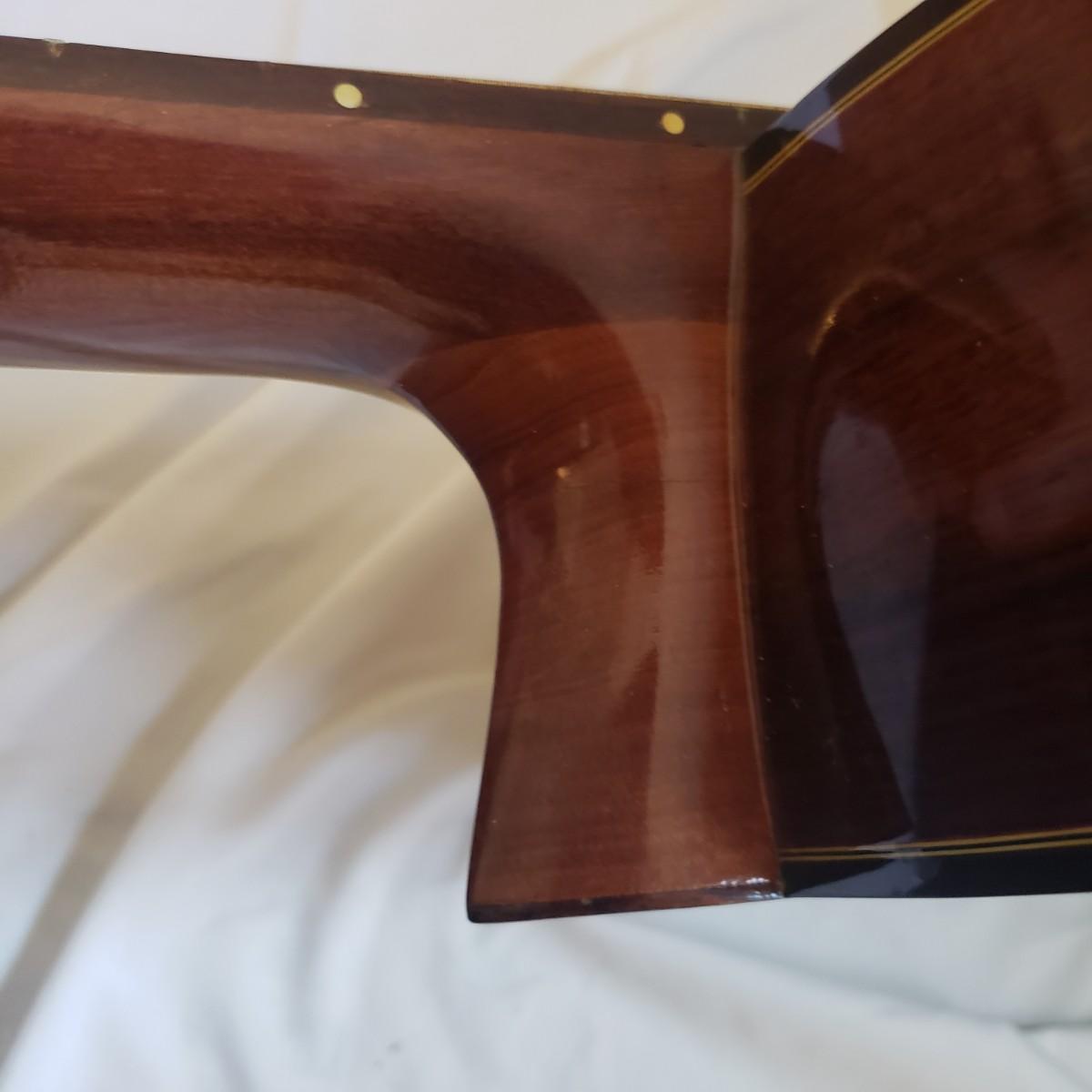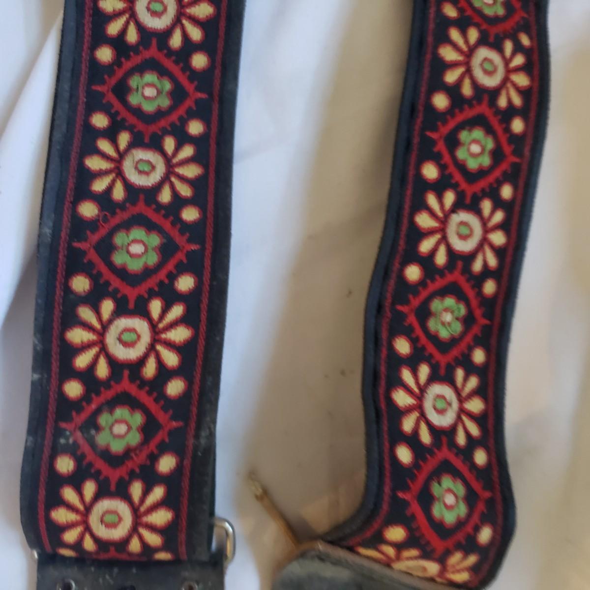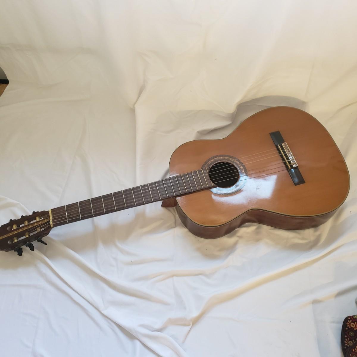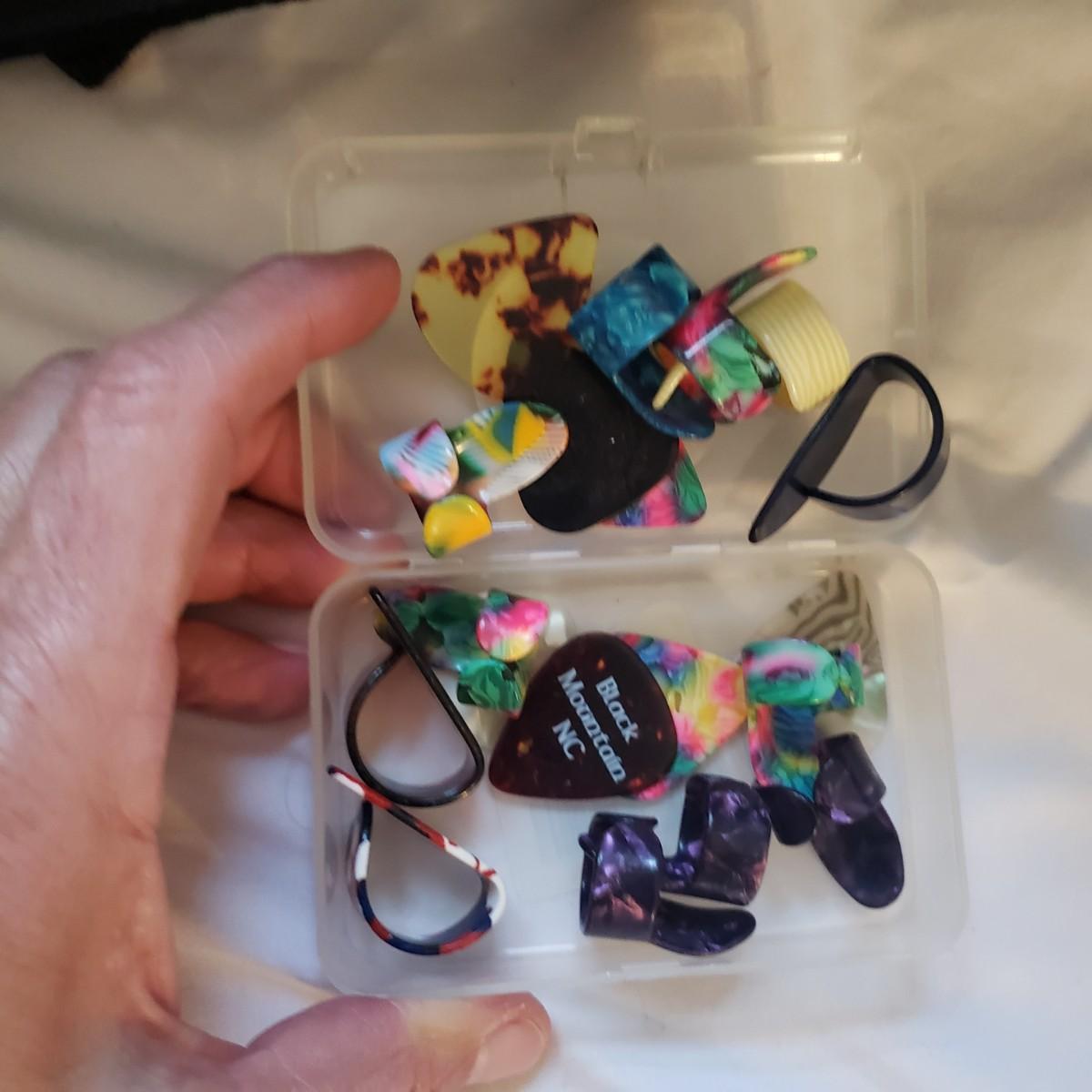 This lot features a Made in Japan six string guitar, a Boulder-Alpine Series soft guitar case, a Bobby Lee guitar strap and a case of various picks. The guitar measures approximately 15" x 4" x 40"H. There are some minor wears on the finish and the strap peg is missing. The case is Boulder brand, Alpine Series and measures 16" x 6" x 42"H. This soft case has three pockets in the front and backpack straps.