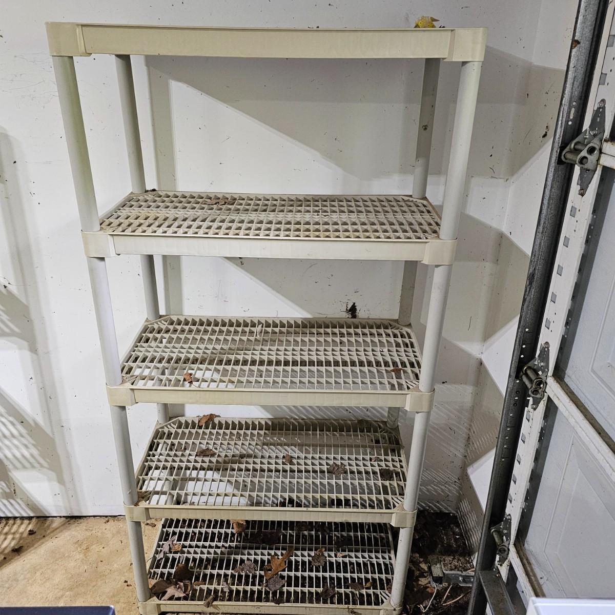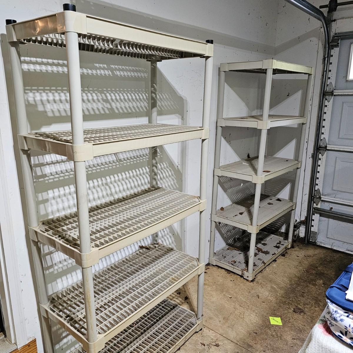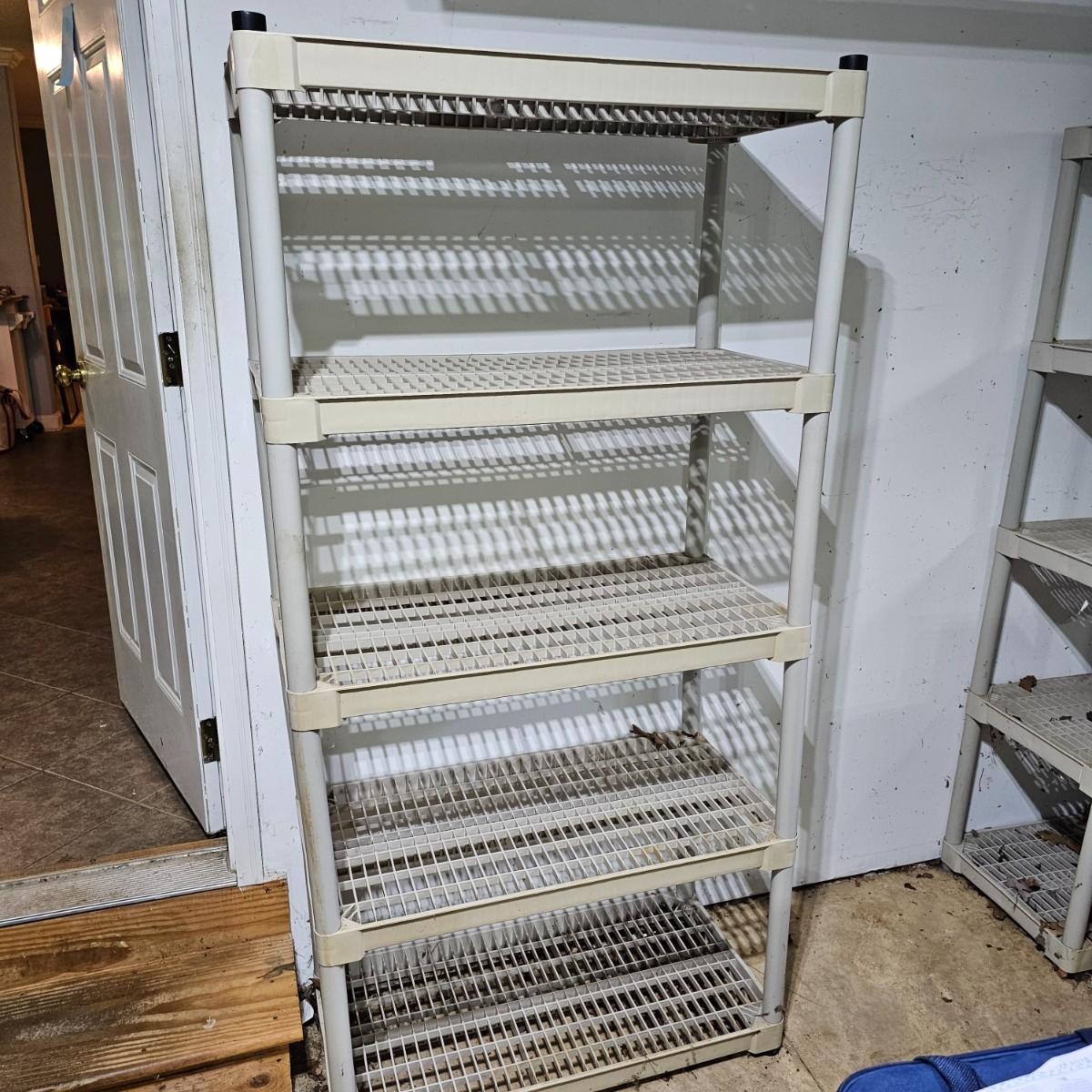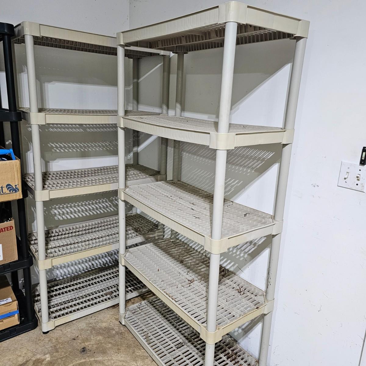 Set of six matching style/size storage shelves. Open grid shelf surface, items measure 36" x 18" x 72"H. Will come apart for transport. Four shelves in garage, two shelves in basement.*Note* items on basement shelves NOT included in this lot, but will be available elsewhere in this auction. Blue shelves pictured are not included. See photos for details. Local pickup only after 3 PM.