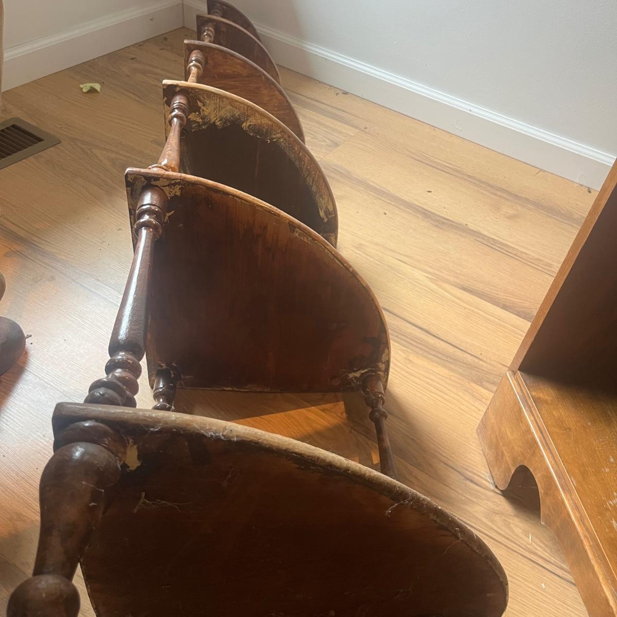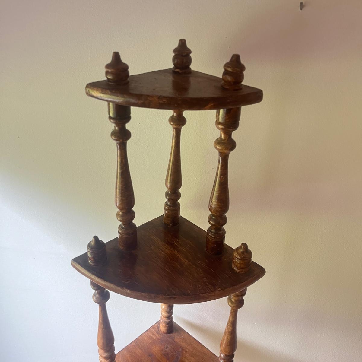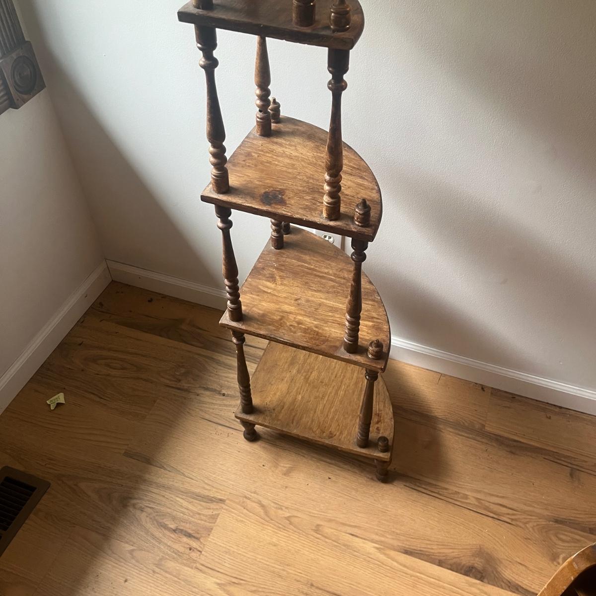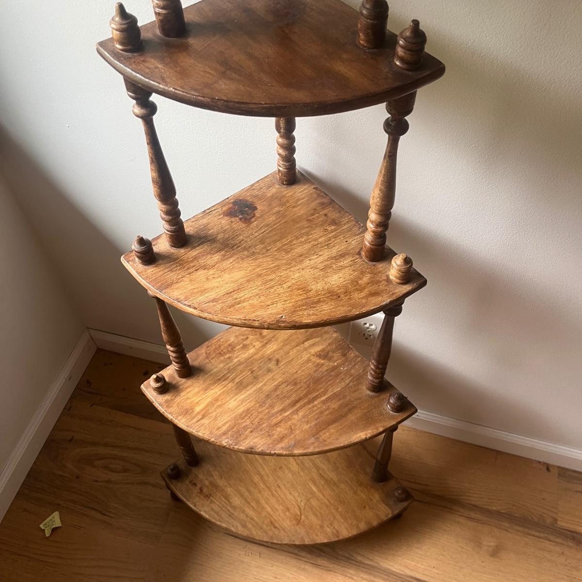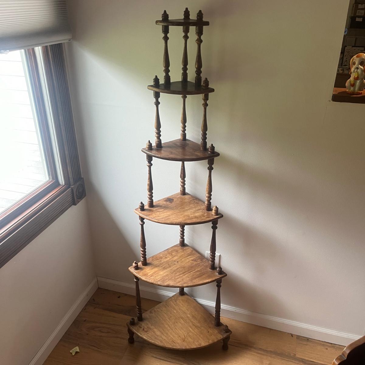 Lot includes a six tier wooden corner shelf. Shelf measures 23” x 16” x 65”H. The bottom three shelves are faded more than the top three shelves, see pictures. All shelves have scratches and nicks.