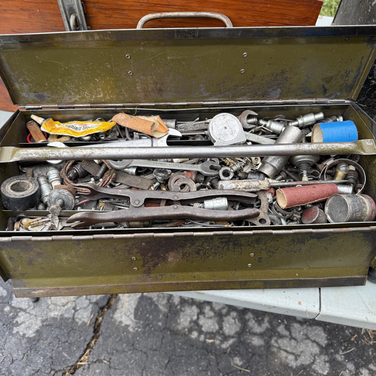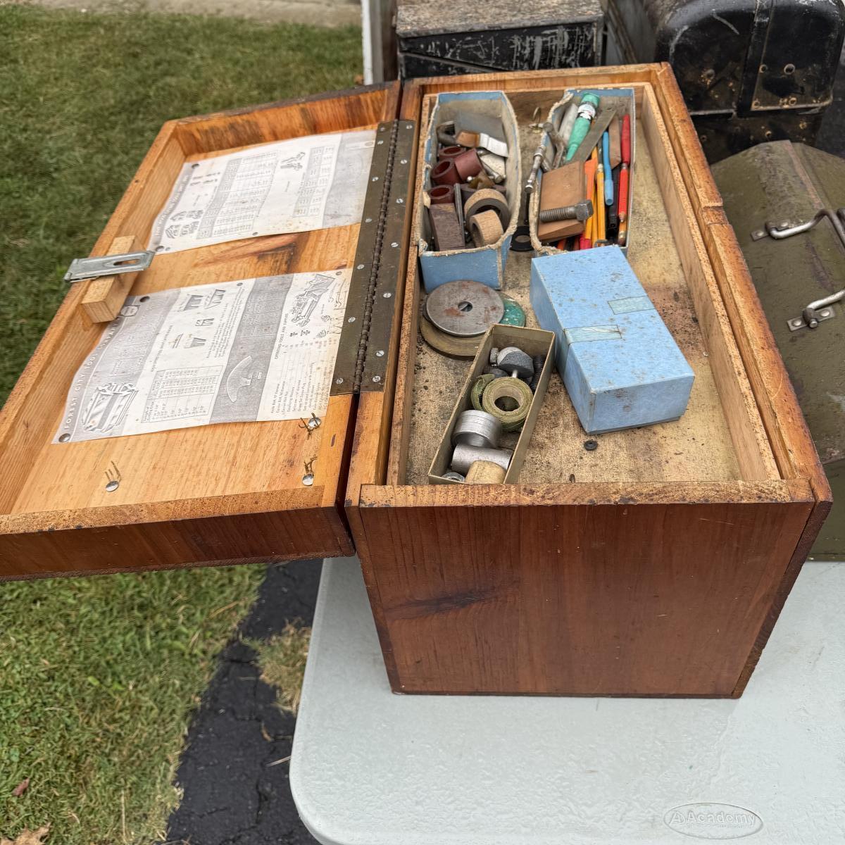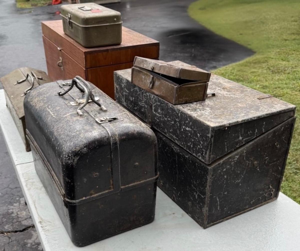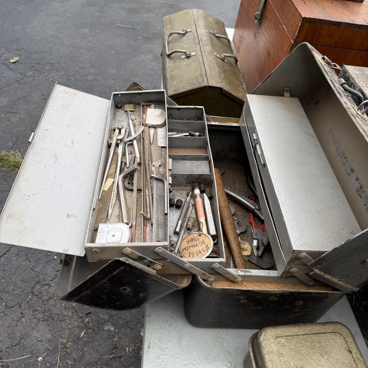 This lot contains six tool boxes five of which are metal and the sixth which is wood. The wood tool boxes measures 27” x 13” x 14.5”H and the smallest metal tool box measures 9.5” x 4.5” x 3”H. Also included are the contents of the tool boxes, see pictures for full inventory. Local pick up only.