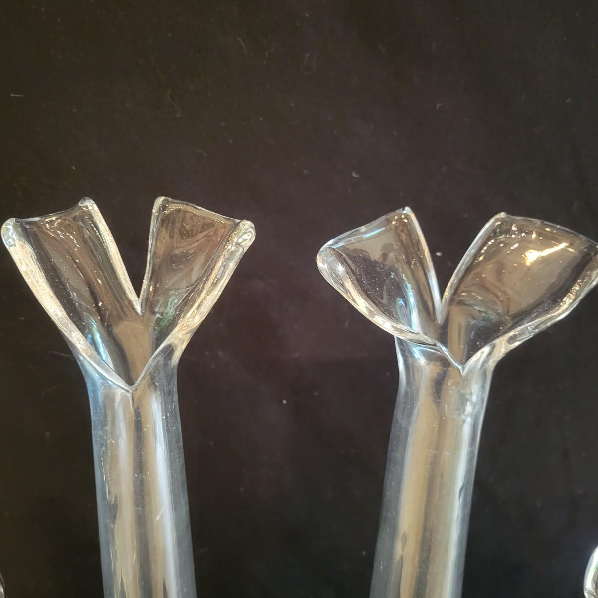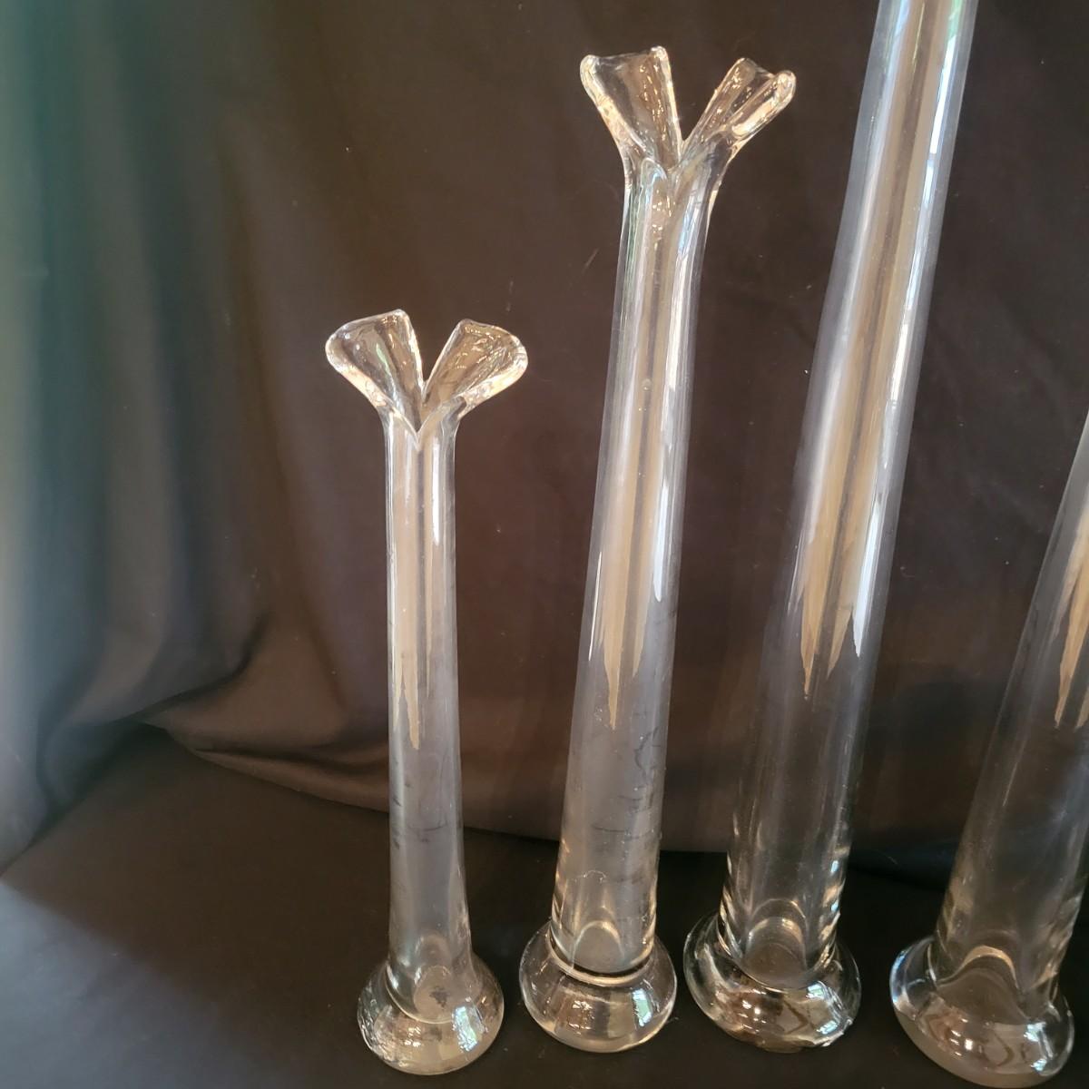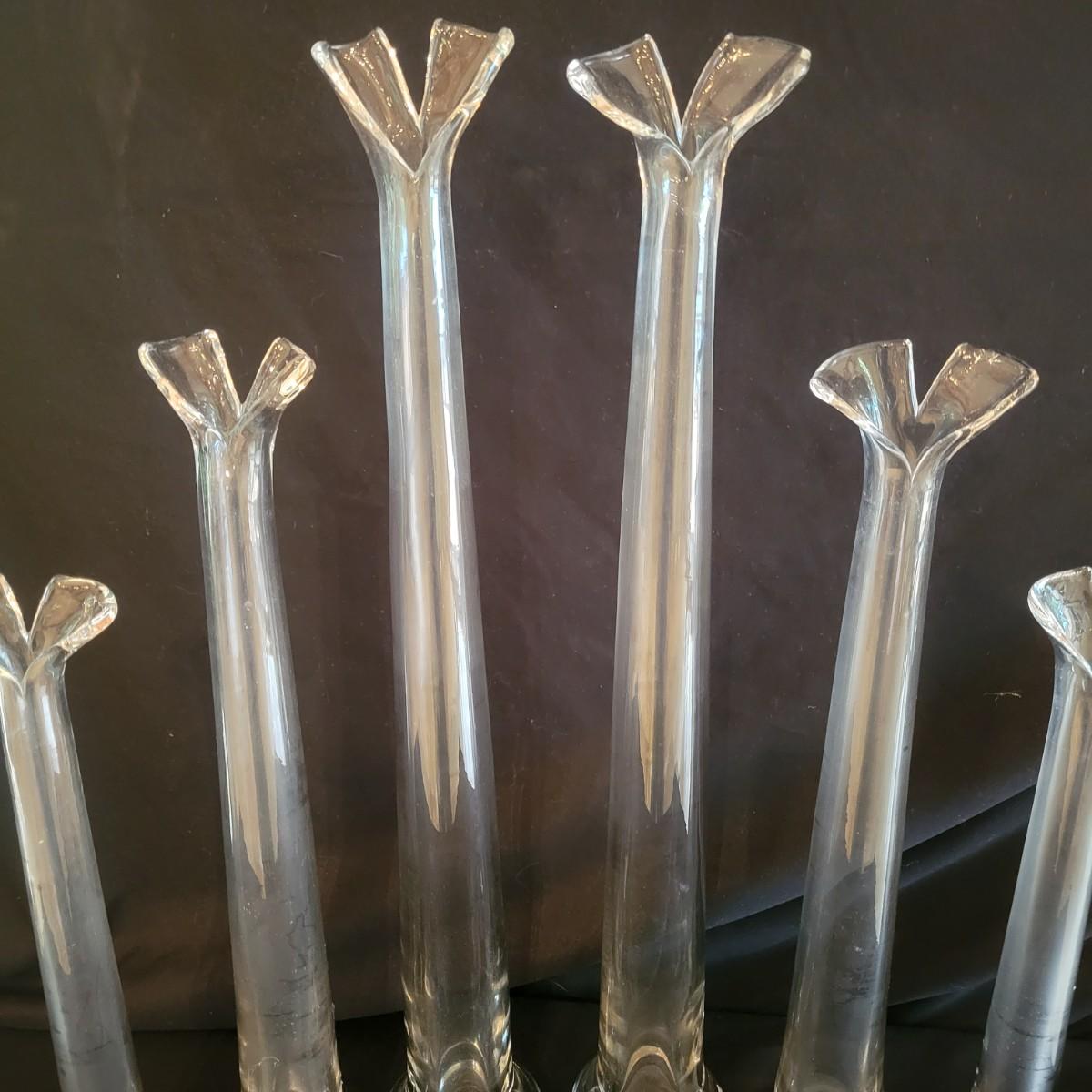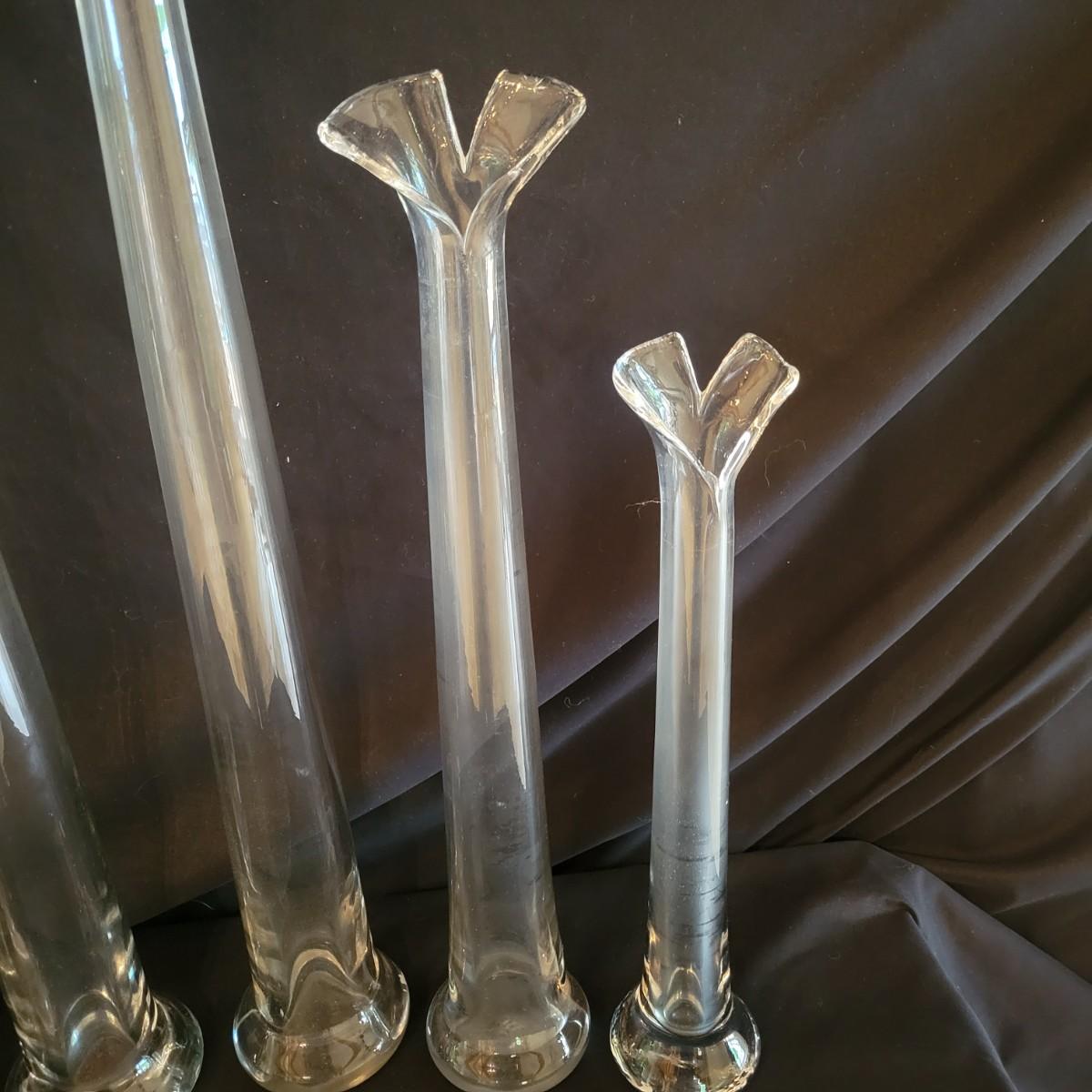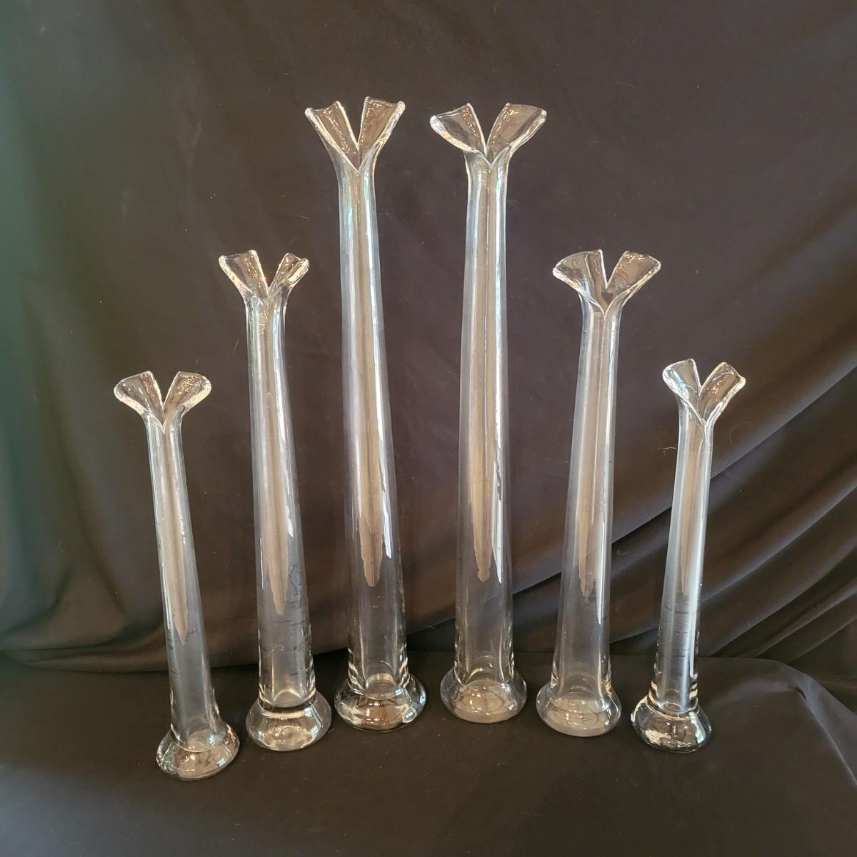 A collection of six matching vases that have a unique split at the top. The largest vases measure approximately 4"D x 25.5"H. Local pickup only