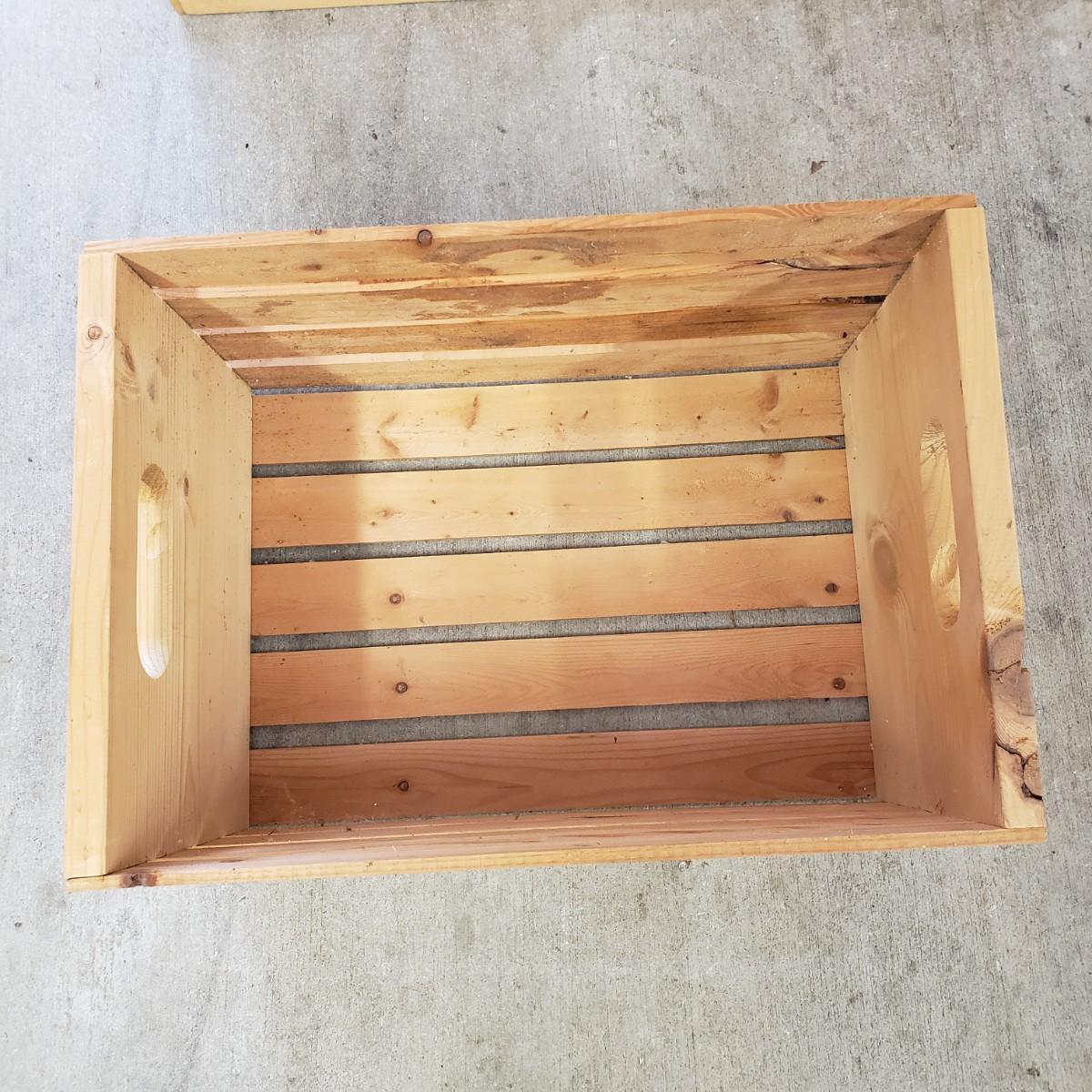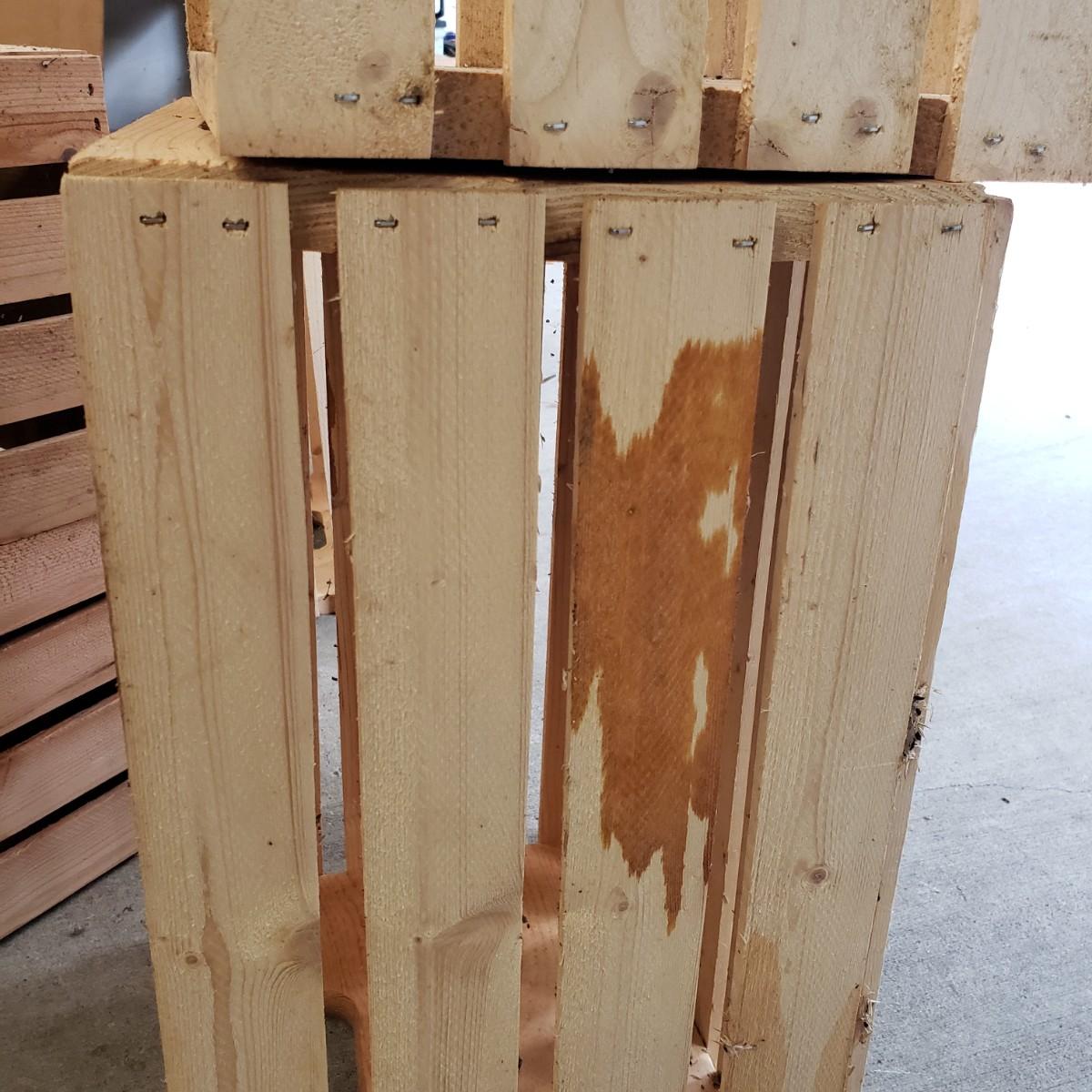 These approximately 18" x 12" x 10"H wooden crates are sturdy. They have been used in a garage to hold yard chemicals, such as fertilizers. Two crates have some stains on the sides, see pictures.