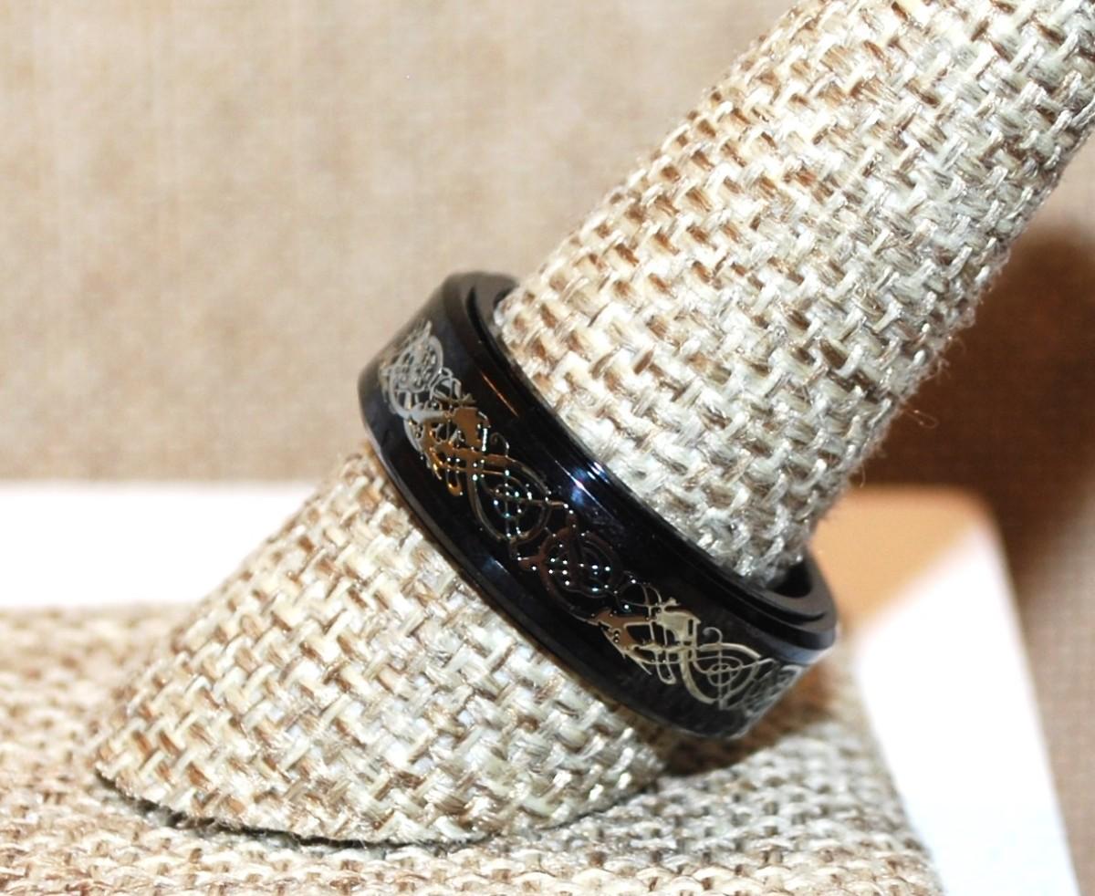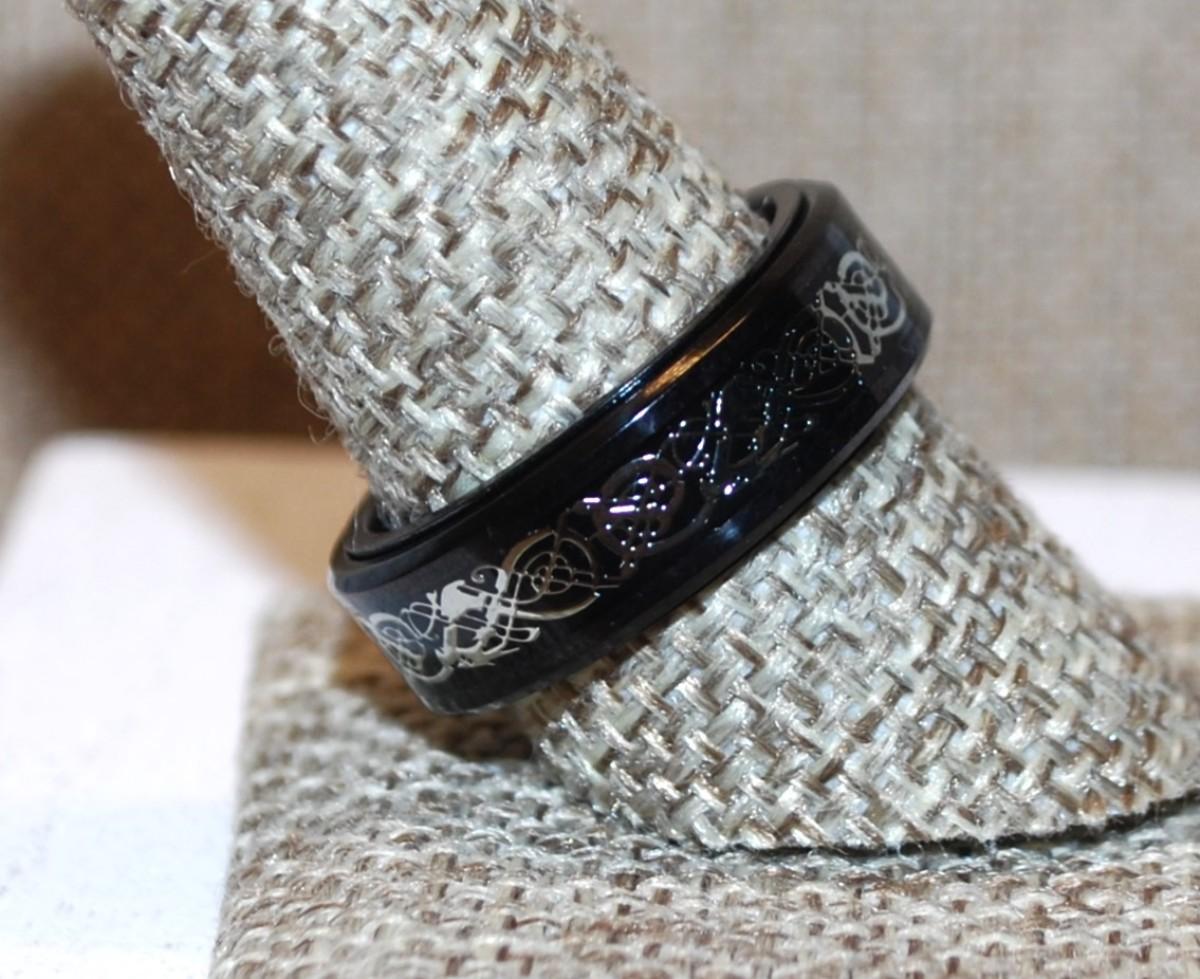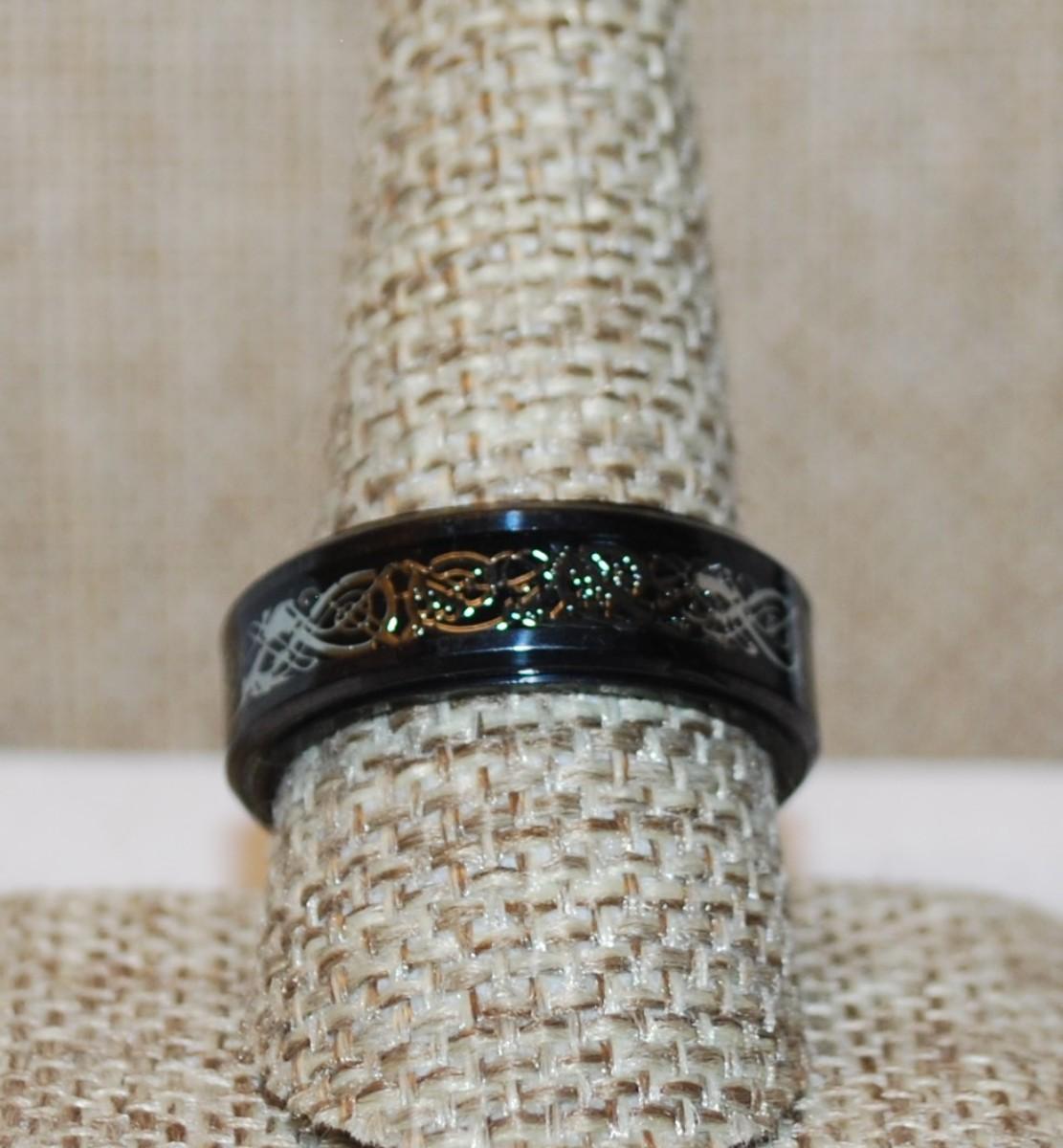 Size 10 Black Acrylic Ring with Graphic Designed Inlay Down the Middle (6.8g)