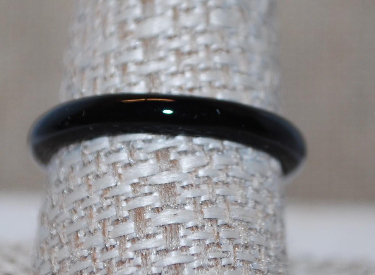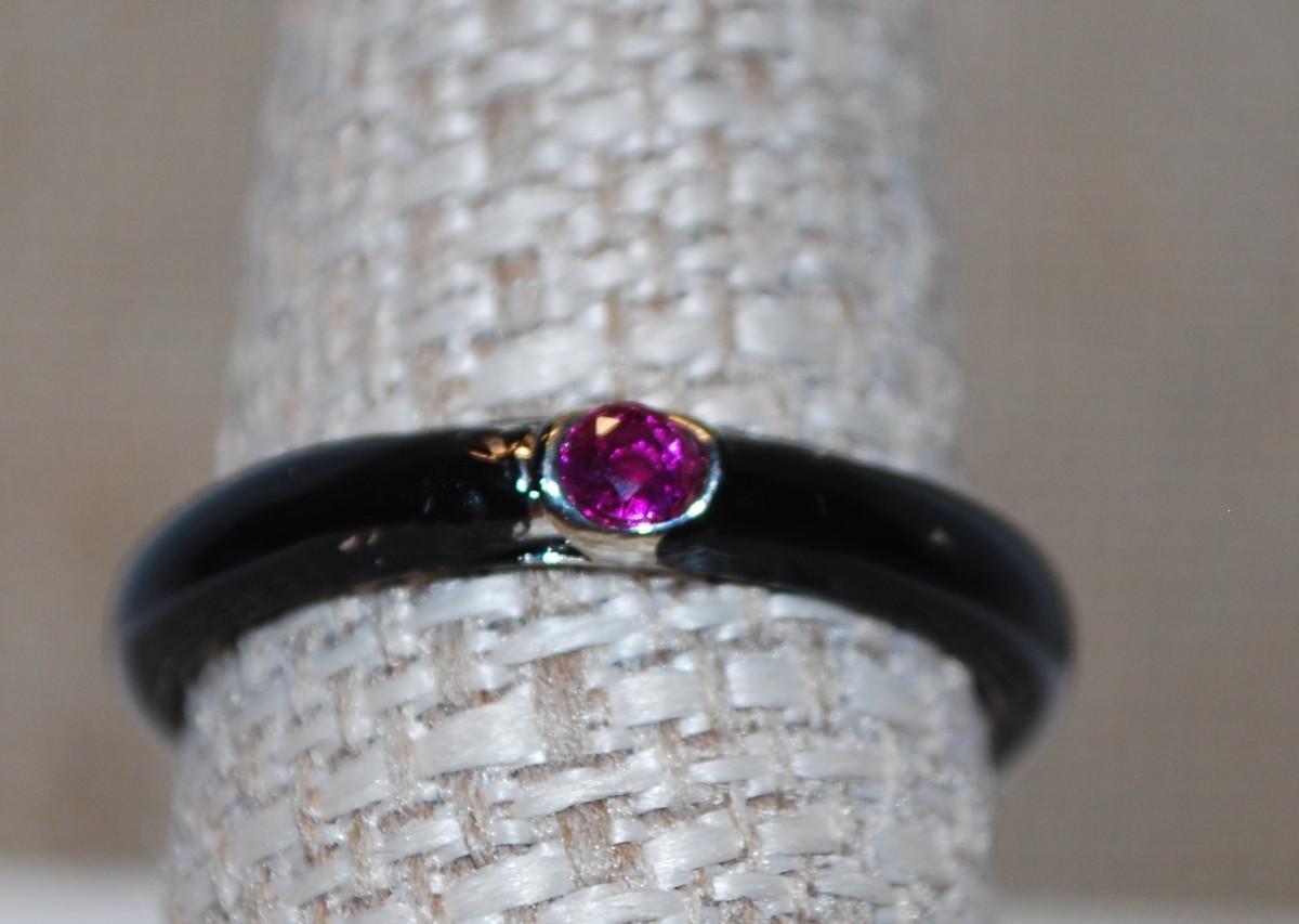 Size 10 BLACK Enamel Ring with Single Cranberry Red Round Stone on a Silver Tone Band (2.6g)