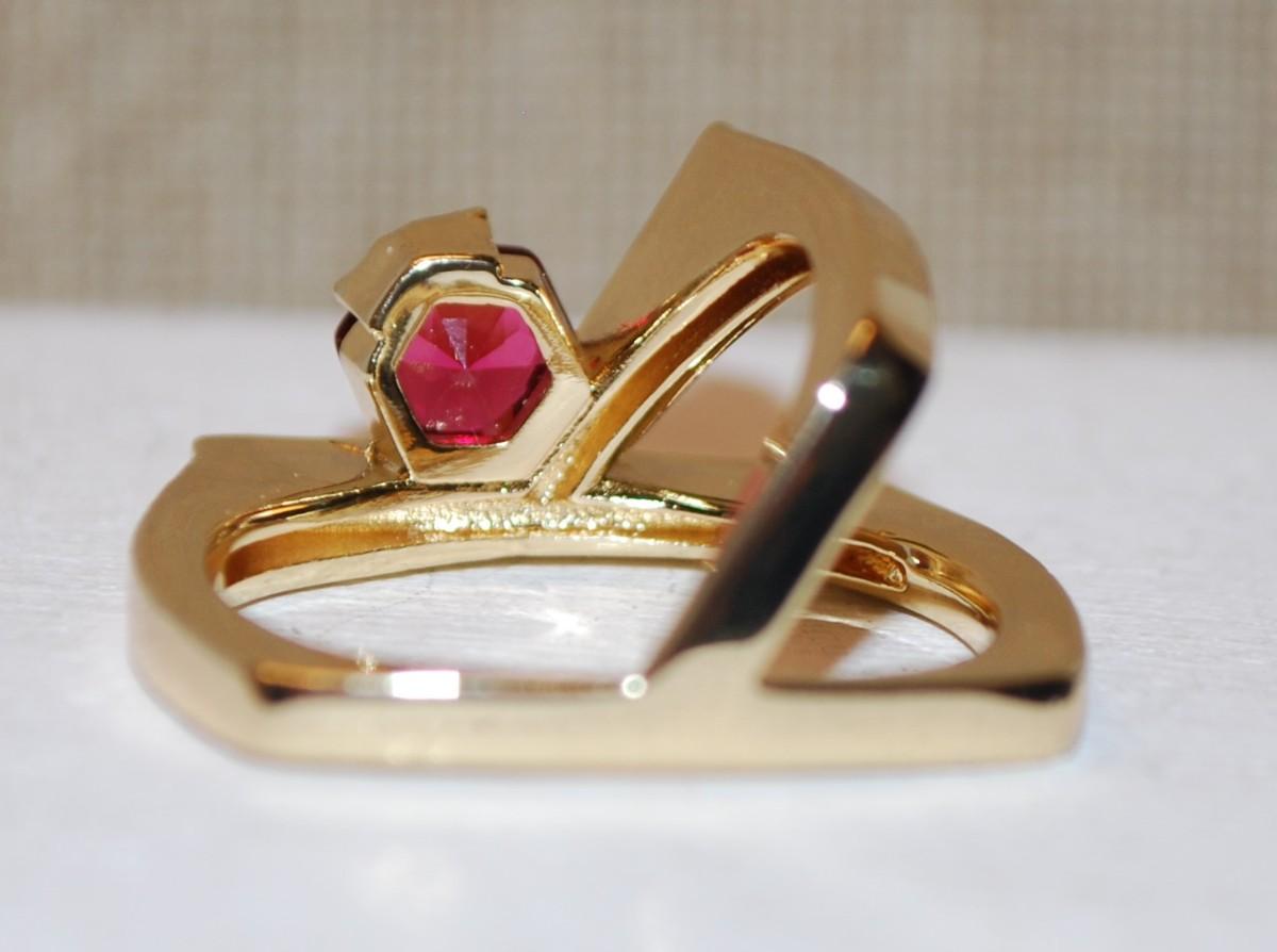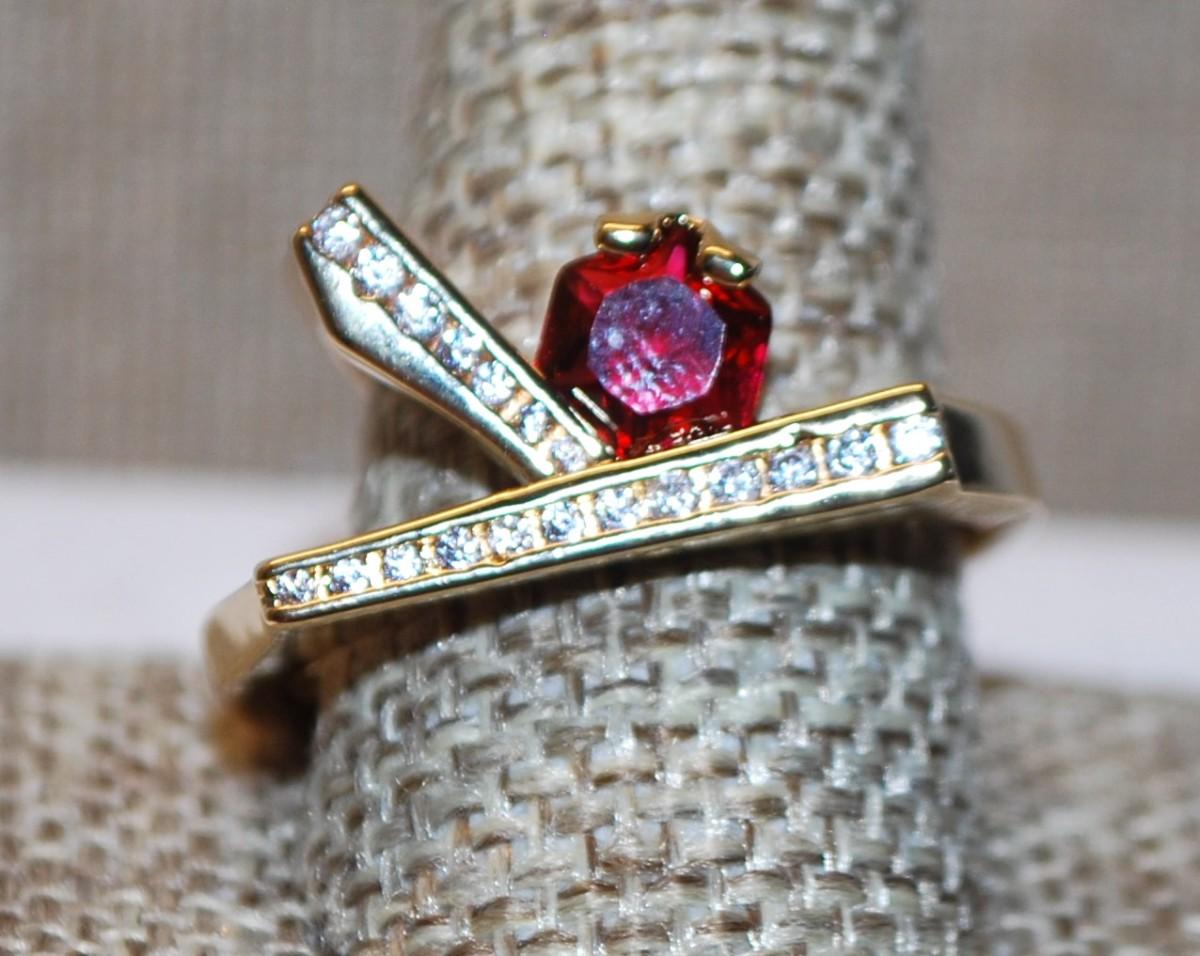 Size 10½ Contemporary Styled Unique Ring with Red Stone & Clear Stone Accent Lines on a Gold Tone Band (9.6g)