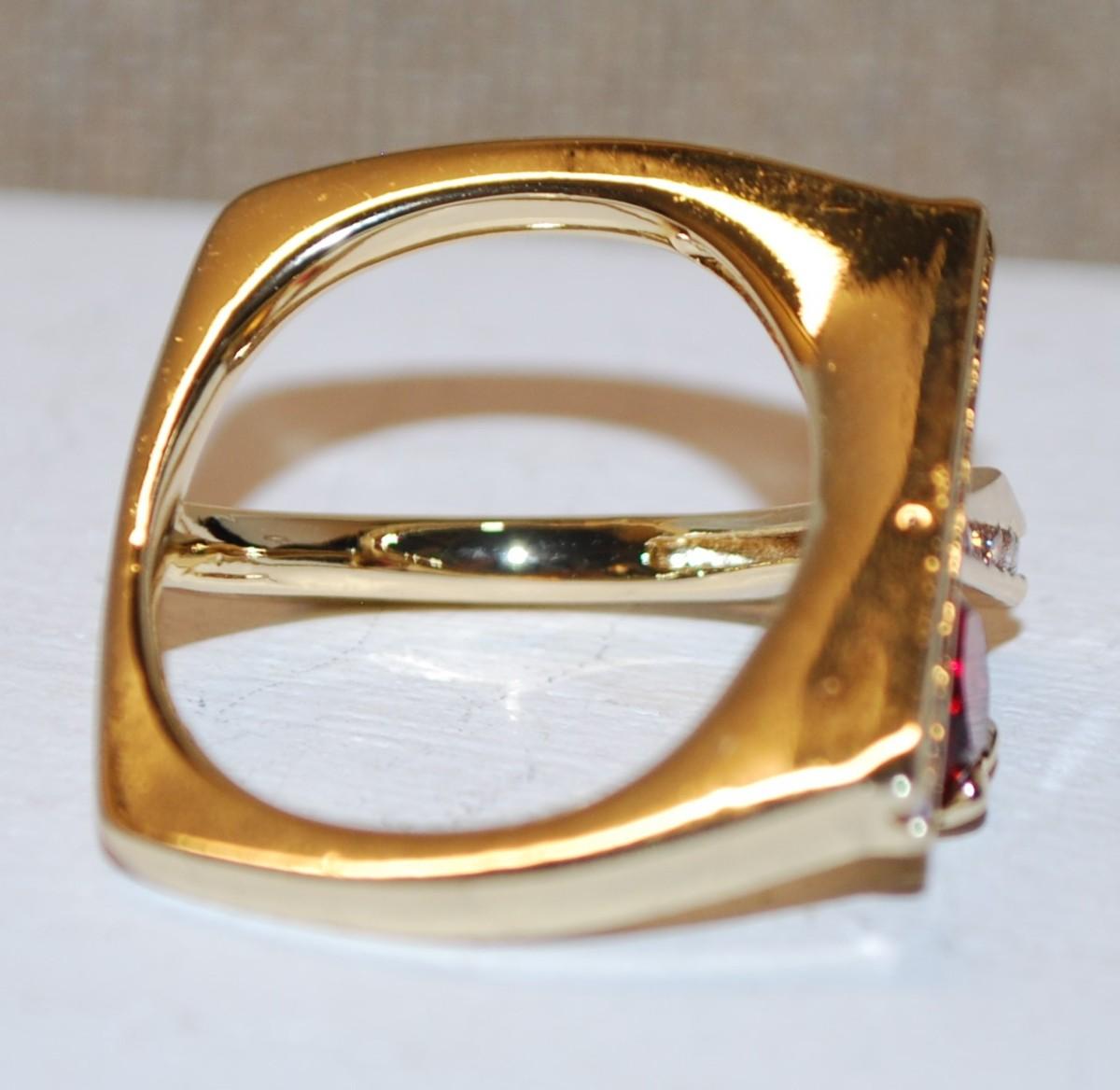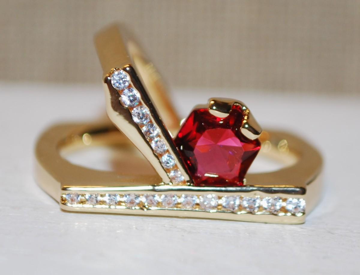 Size 10½ Contemporary Styled Unique Ring with Red Stone & Clear Stone Accent Lines on a Gold Tone Band (9.6g)