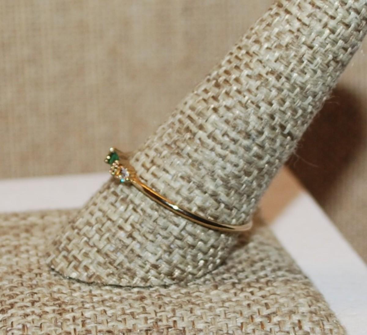 Size 10 ½ Delicate Green Rectangle Stone Ring with Side Accents on a Gold Tone Band (0.8g)