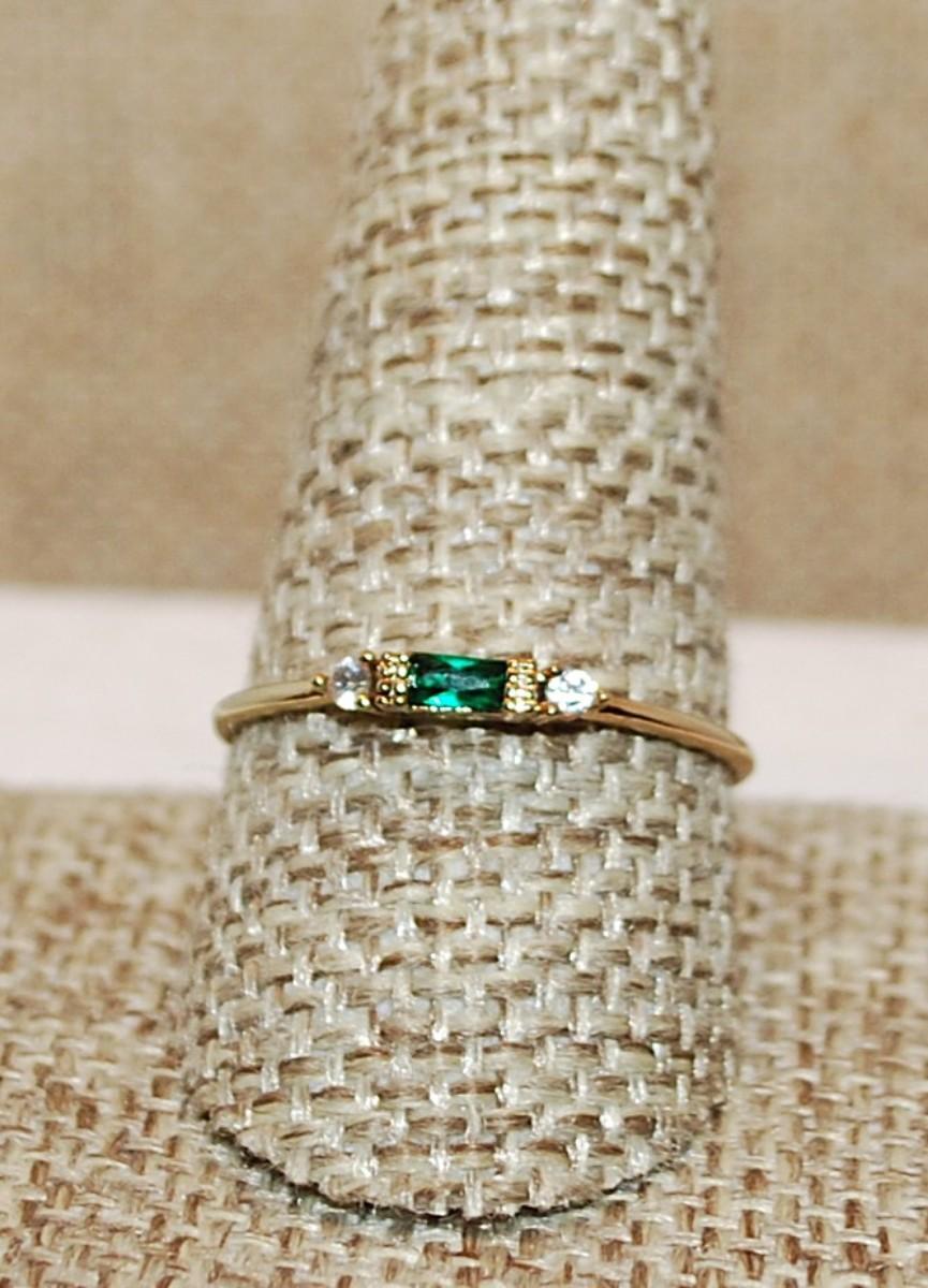 Size 10 ½ Delicate Green Rectangle Stone Ring with Side Accents on a Gold Tone Band (0.8g)