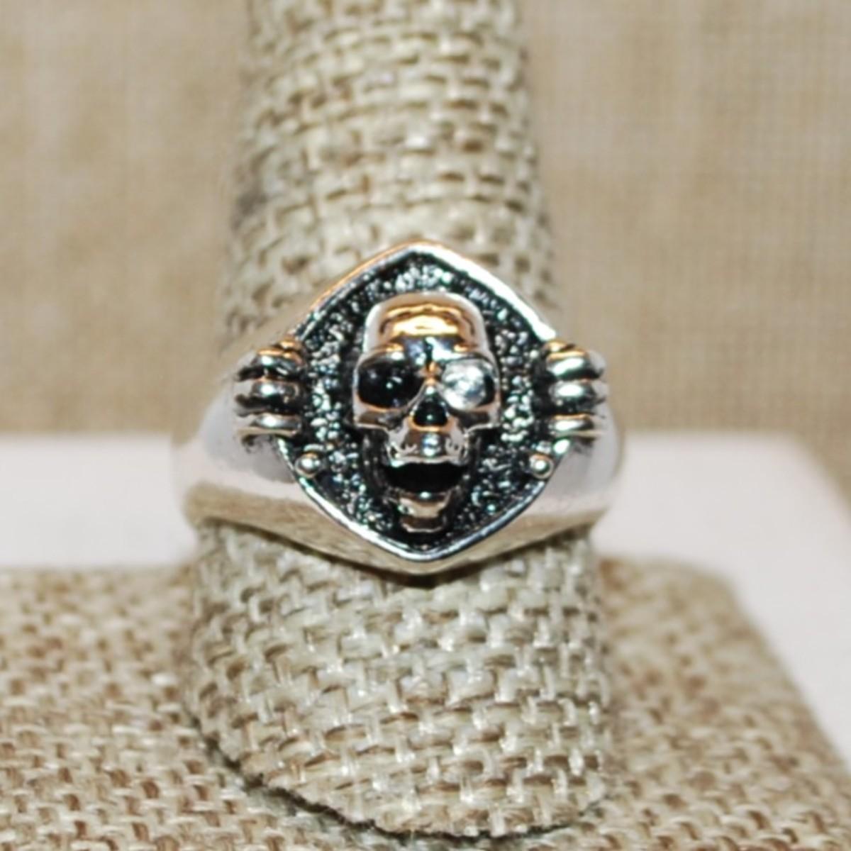 Size 10 Full Face SKULL & "Hands" Ring on a Solid Silver Tone Band (8.7g)