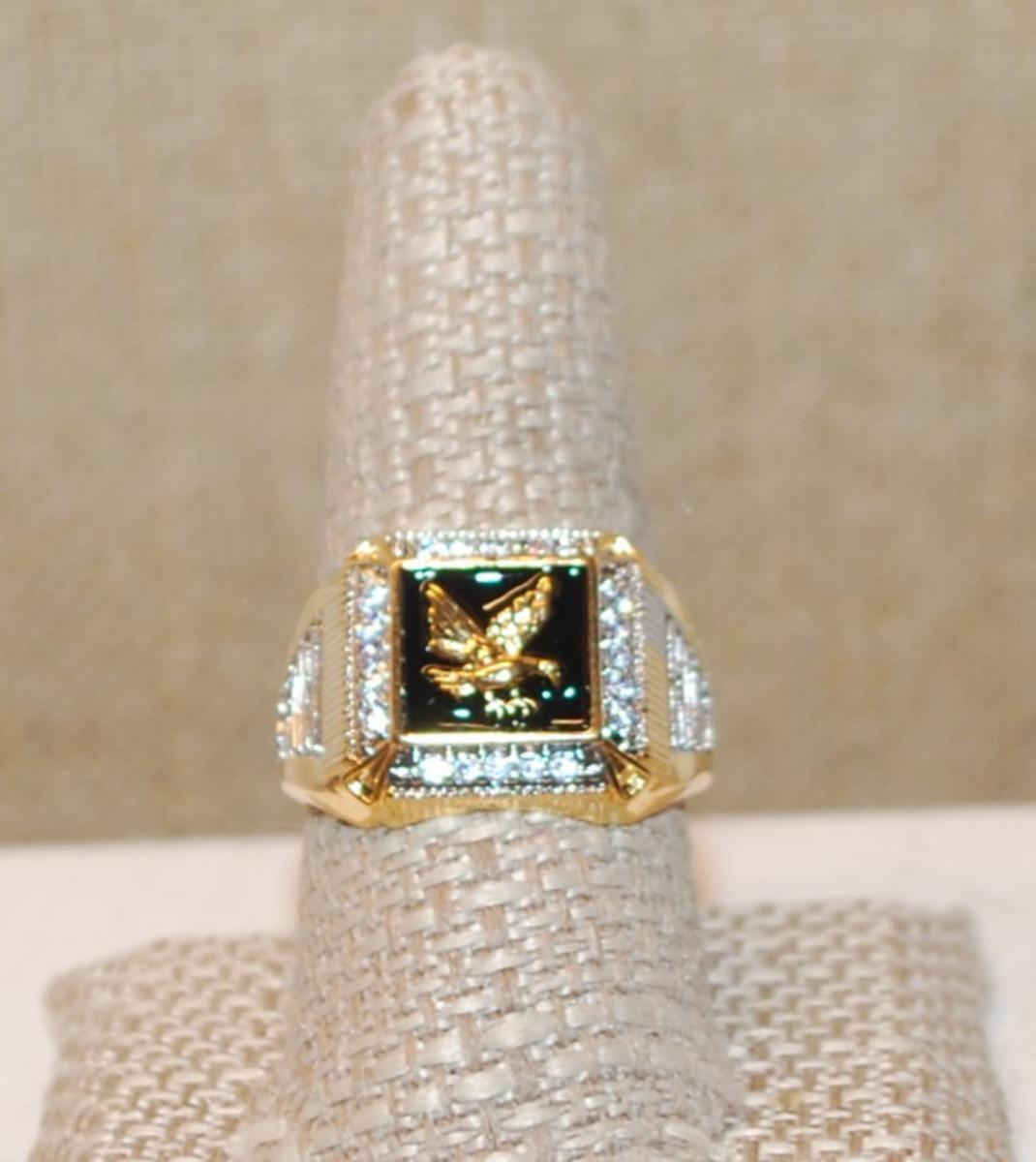 Size 10 "Gold Eagle on Black" Ring with a Square of Brilliant Clear Stones on a Gold Tone Band (6.9g)