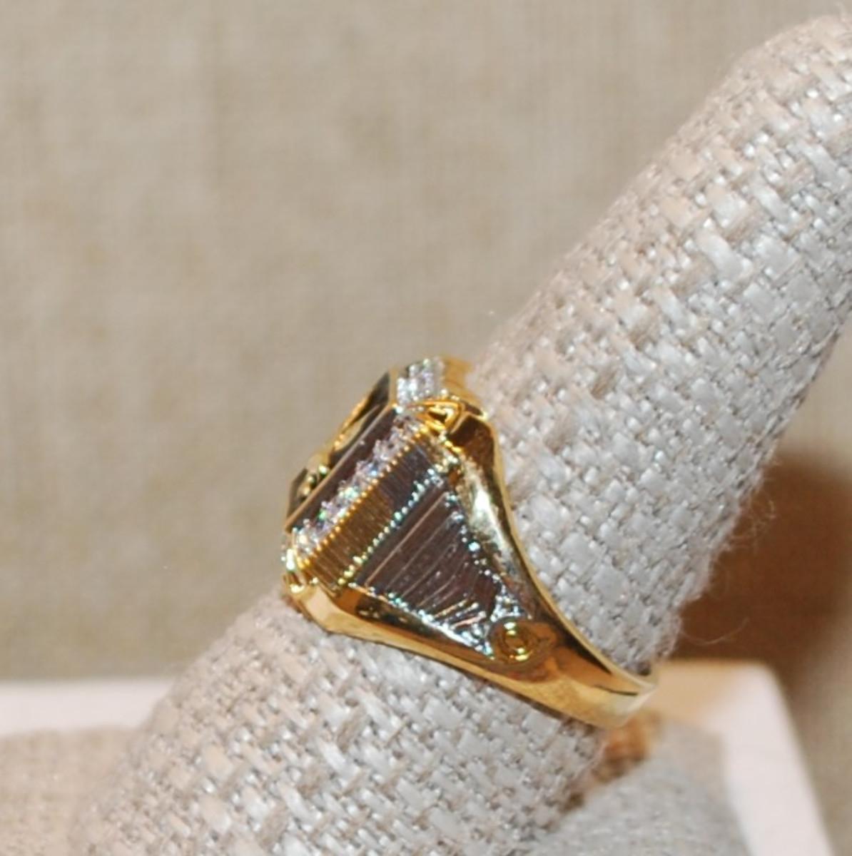Size 10 "Gold Eagle on Black" Ring with a Square of Brilliant Clear Stones on a Gold Tone Band (6.9g)