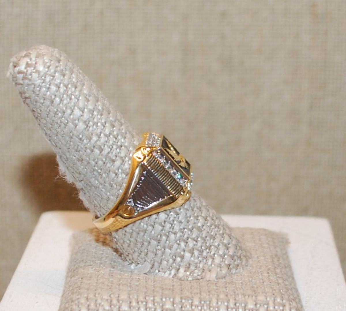 Size 10 "Gold Eagle on Black" Ring with a Square of Brilliant Clear Stones on a Gold Tone Band (6.9g)