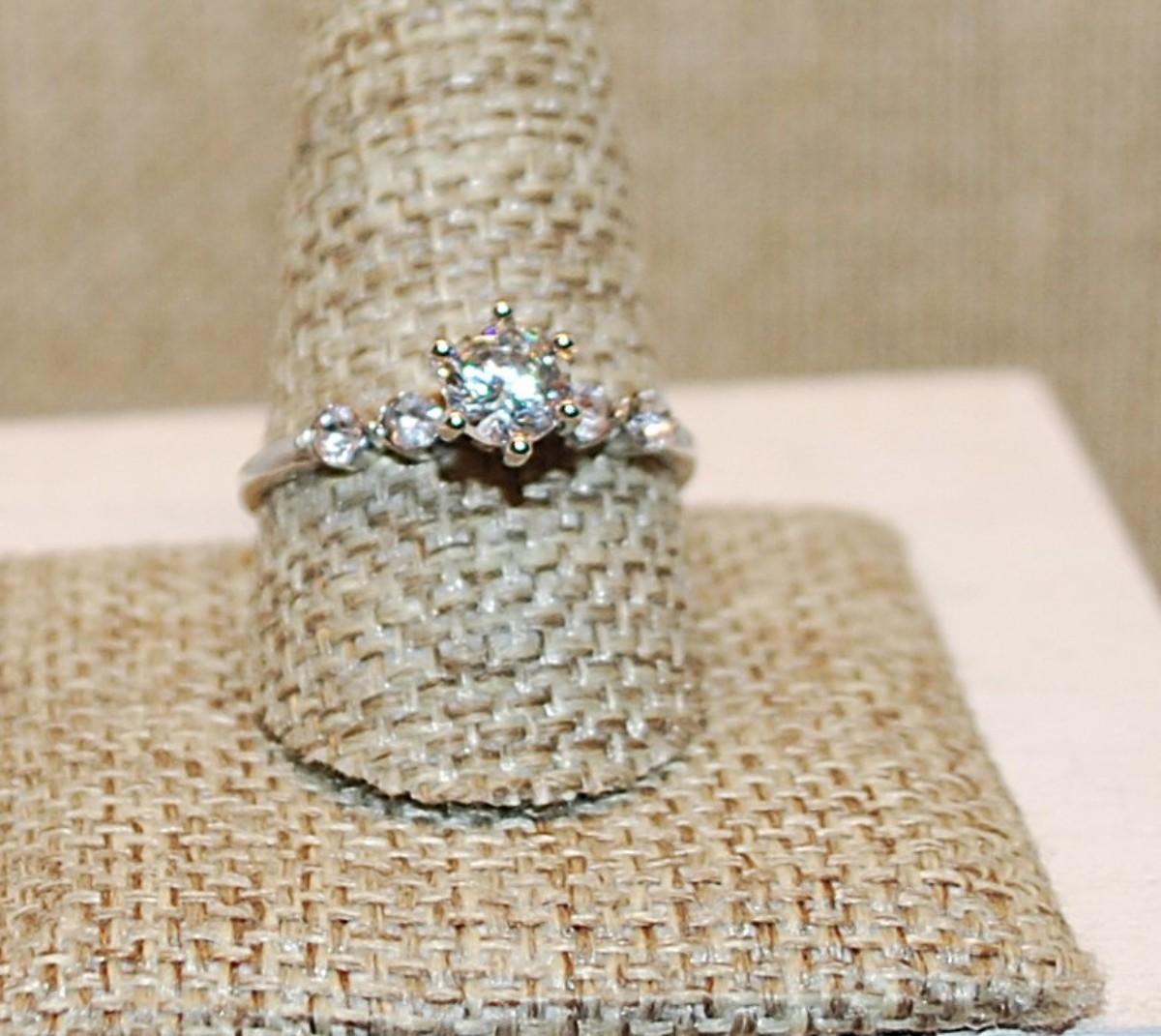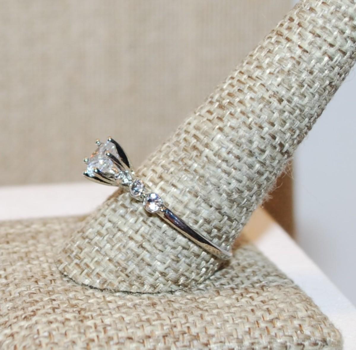 Size 10 ¾ Hi-Rise Single Clear 6 Prong Round Stone with 4 Round Side Accents on a Silver Tone Band (2.4g)