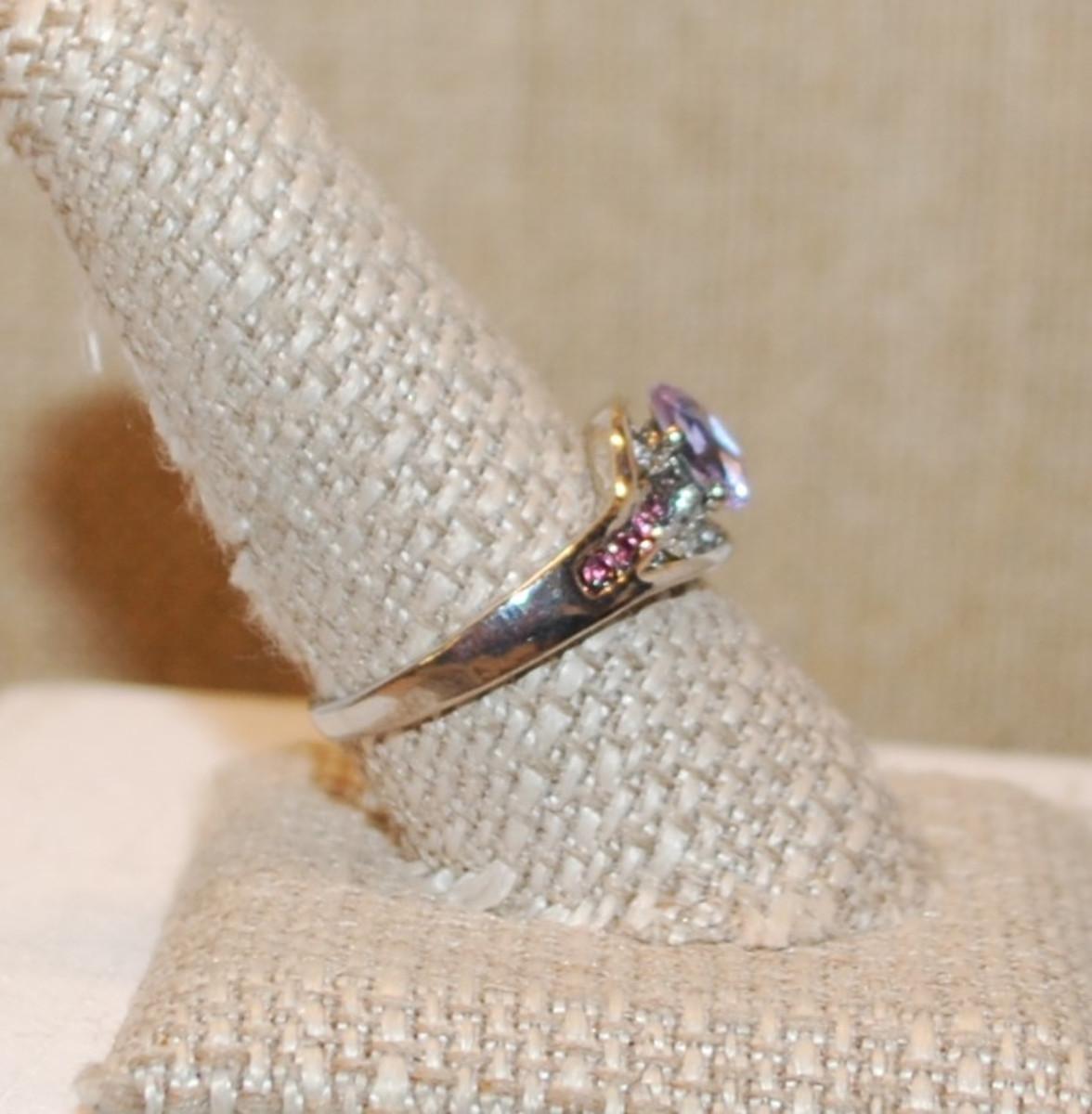 Size 10 Light Purple Oval Main Stone Ring with 8 Purple Side Stone Accents on a Silver Tone Band (4.3g)