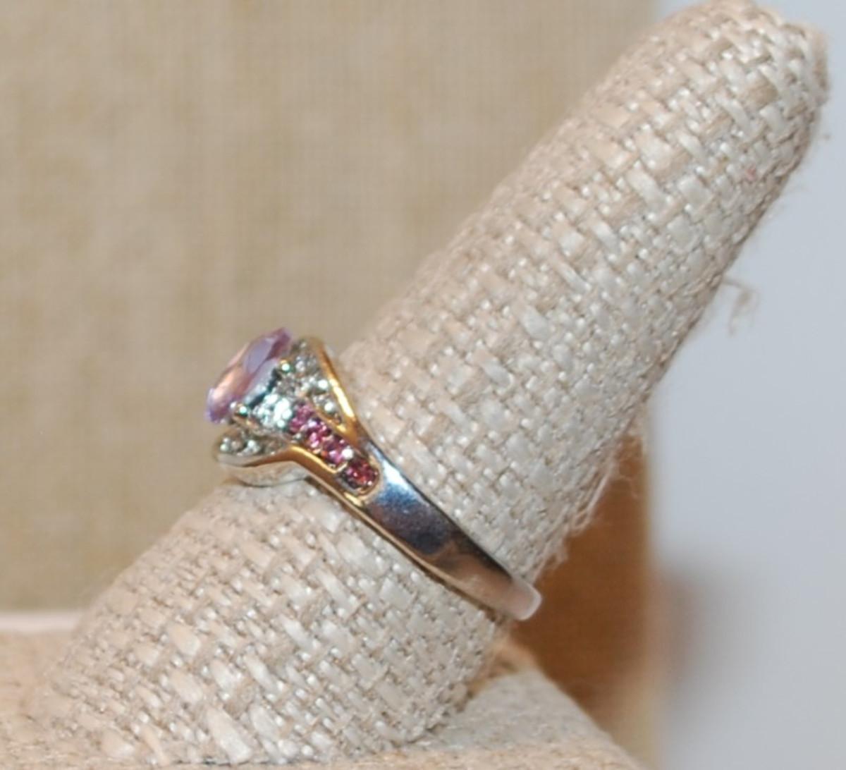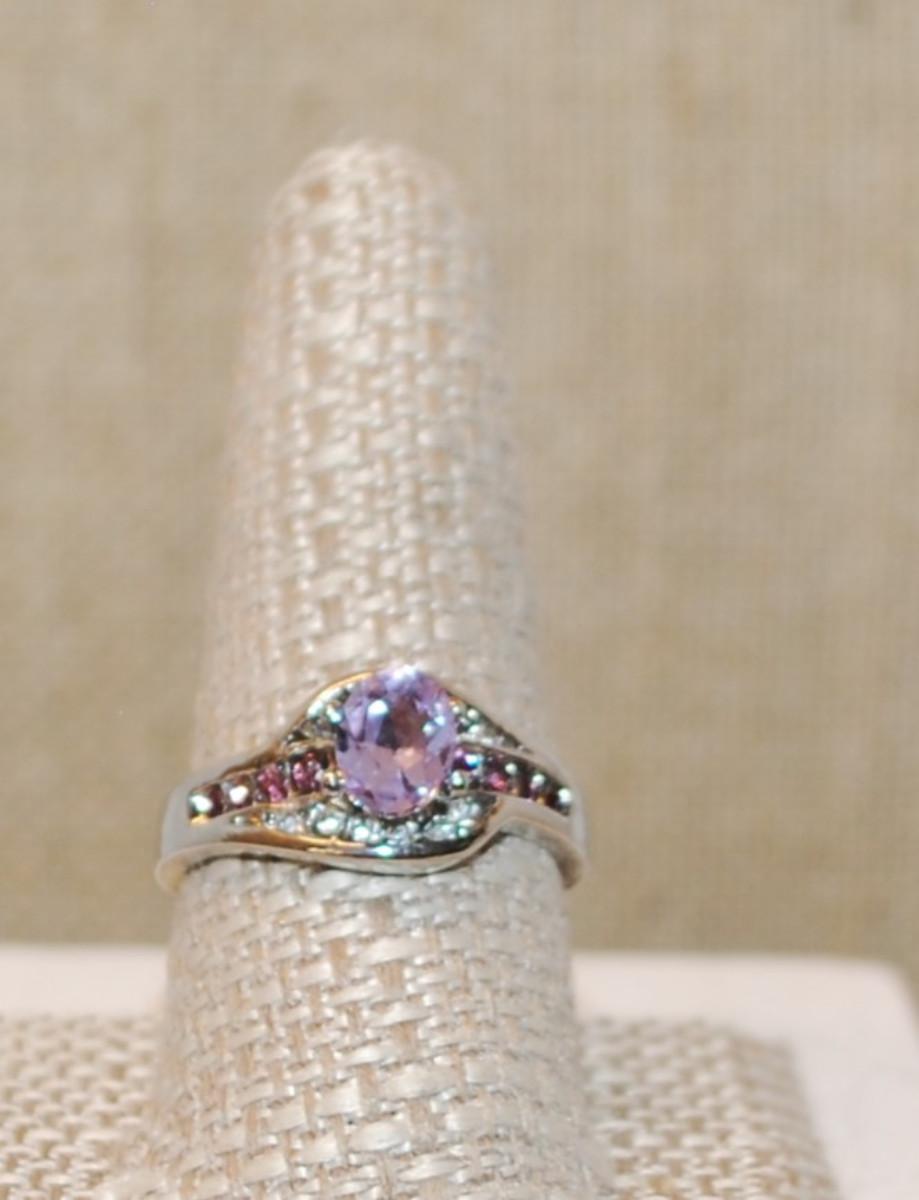 Size 10 Light Purple Oval Main Stone Ring with 8 Purple Side Stone Accents on a Silver Tone Band (4.3g)