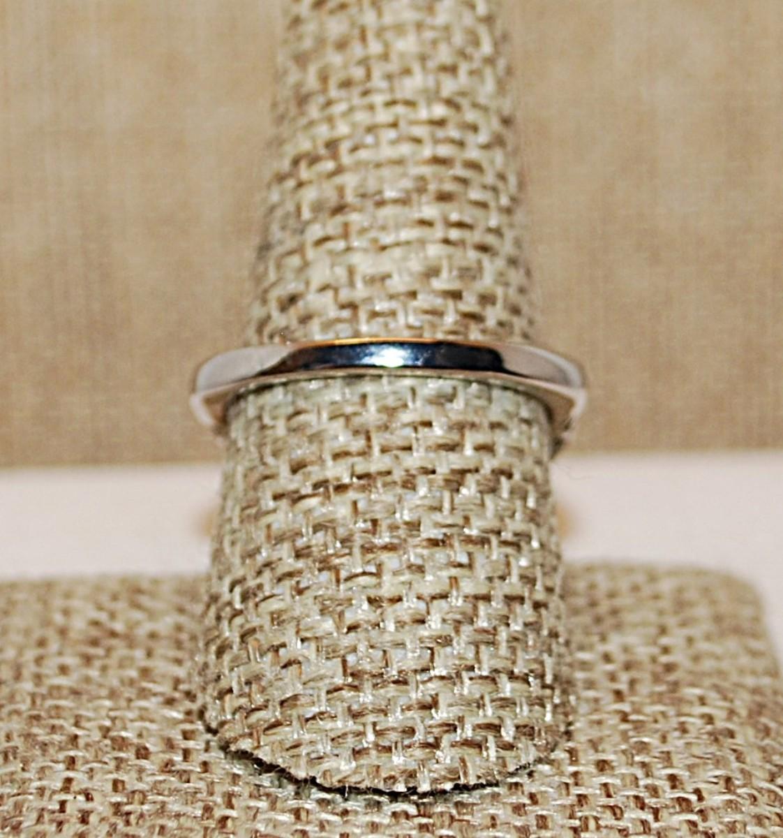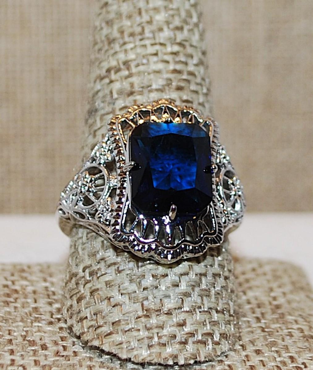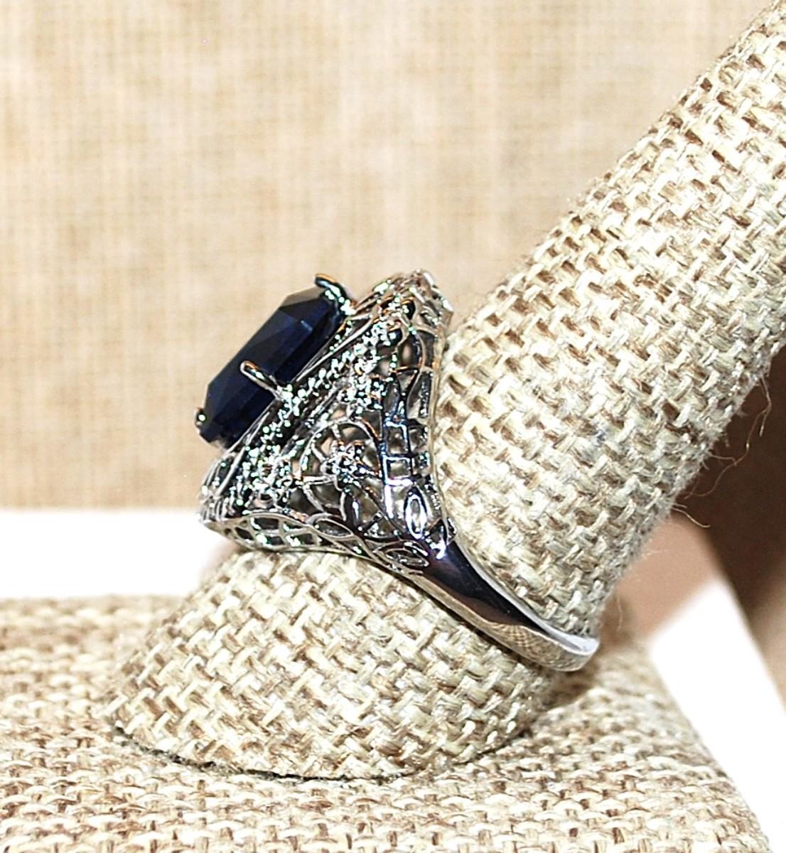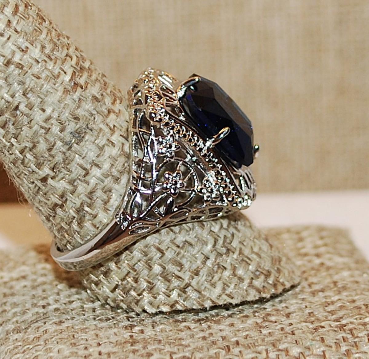 Size 10 Large Deep BLUE Beveled Rectangle Stone on a "Spider Web" Style Setting on a Silver Tone Band (5.6g)