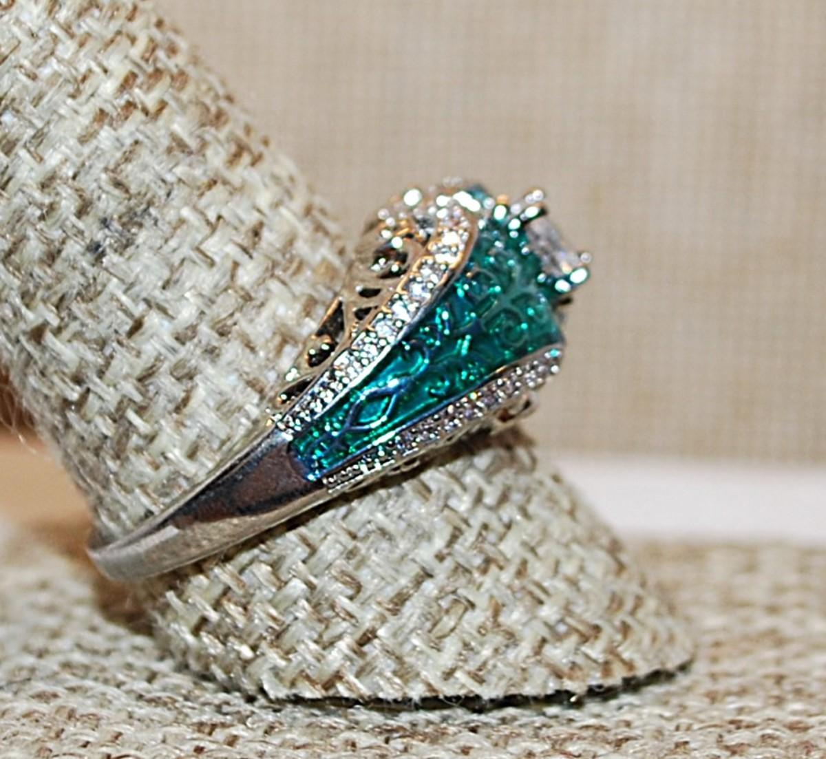 Size 10 Marked .925 "Puffy" AQUAMARINE Party Ring with a Single Main Clear Round Stone on a Silver Band (6.5g)
