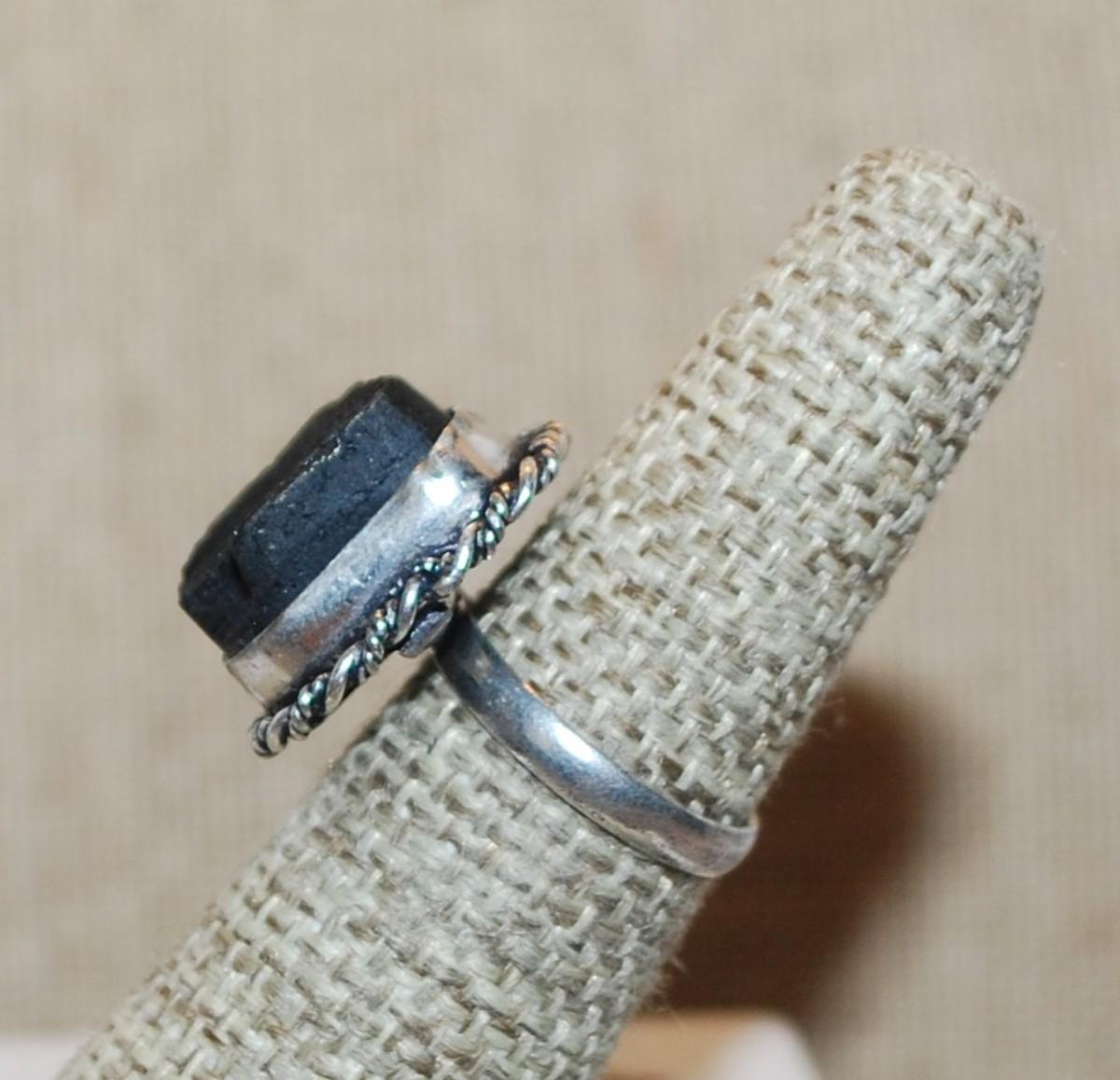 Size 10½ Marked .925 Rectangle Shaped BLACK TITANIUM Gemstone Ring with "Looped Surround" on a Silver-Plated Band (6.5g)