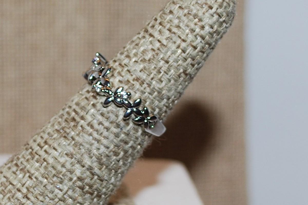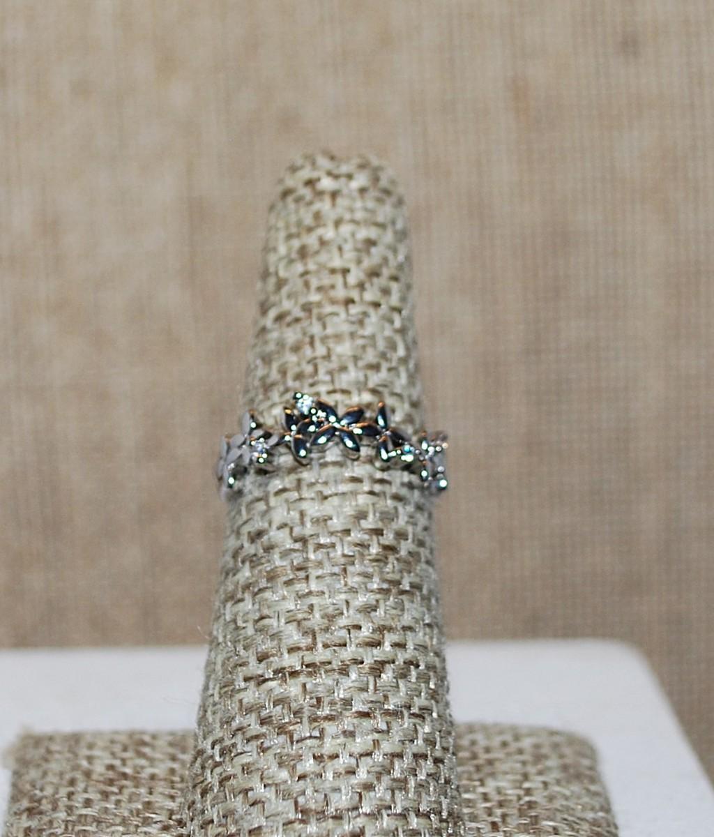 Size 10 Marked .925 Tiny Group of 4 Stones Ring on a Graphic Flowered Silver Band (2.3g)